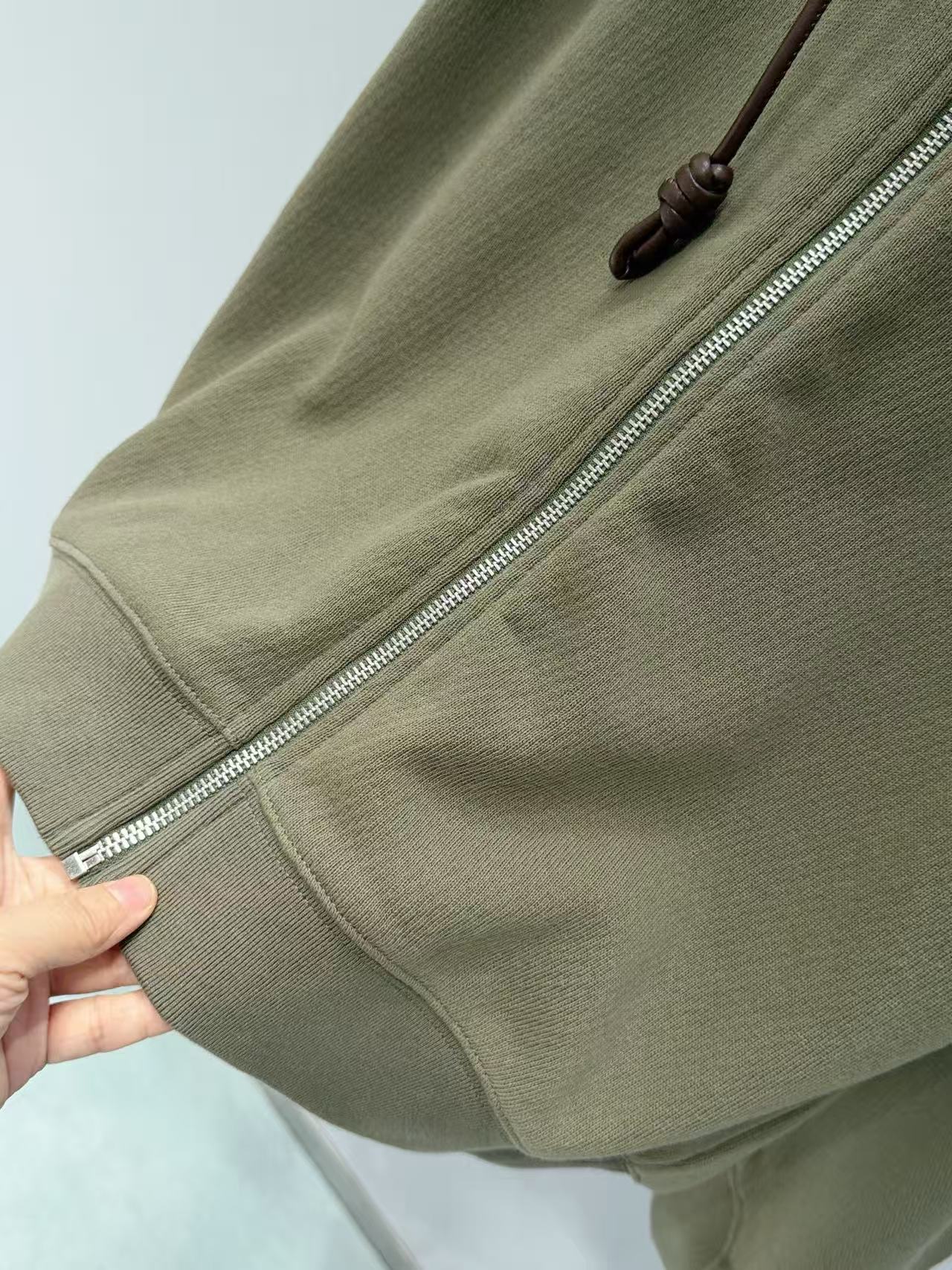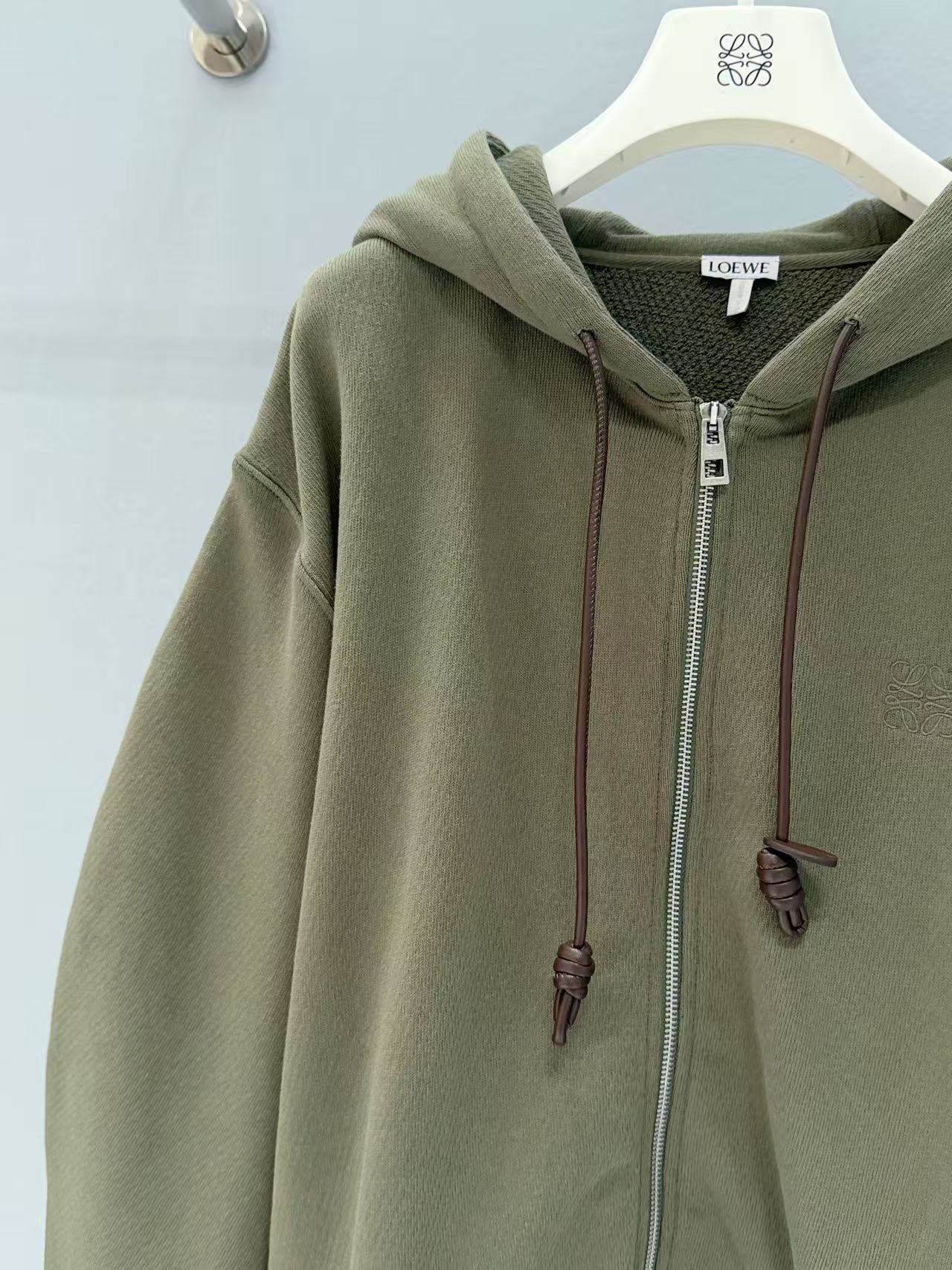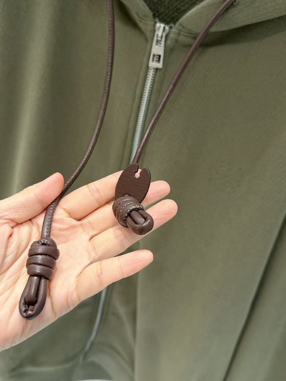 設計細節滿分,前中訂製拉鍊順滑好拉,領口雞眼穿入皮質抽繩,皮革質感與棉料形成強烈材質反差,瞬間提升奢感;