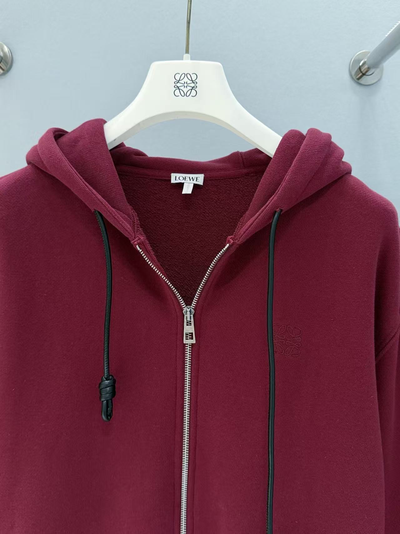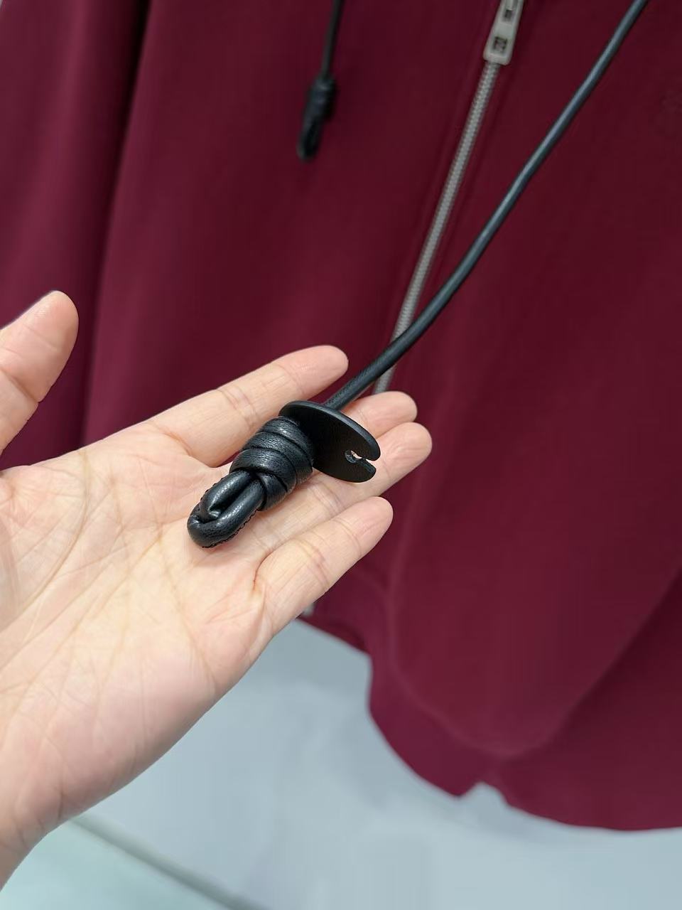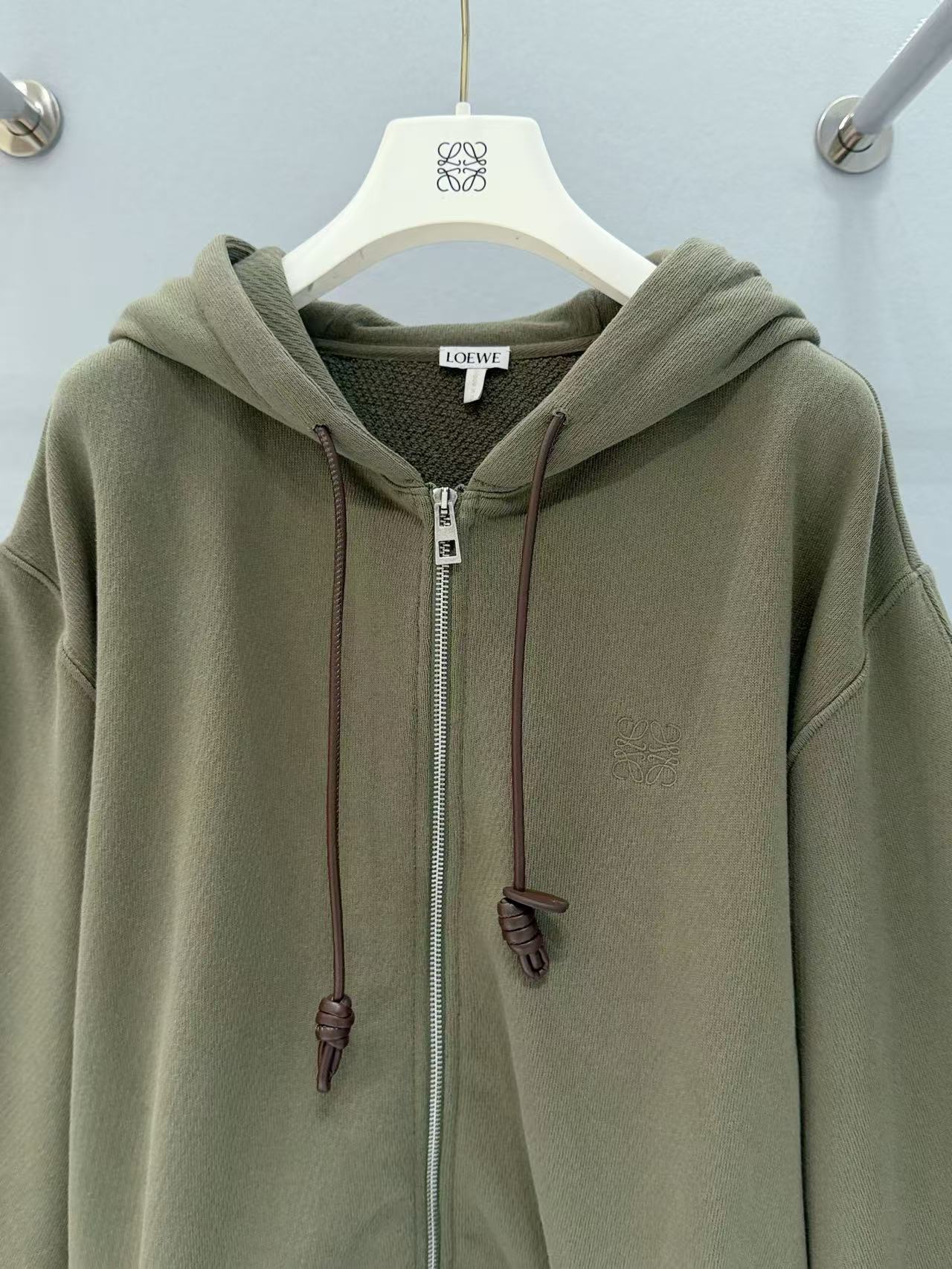 設計細節滿分,前中訂製拉鍊順滑好拉,領口雞眼穿入皮質抽繩,皮革質感與棉料形成強烈材質反差,瞬間提升奢感;