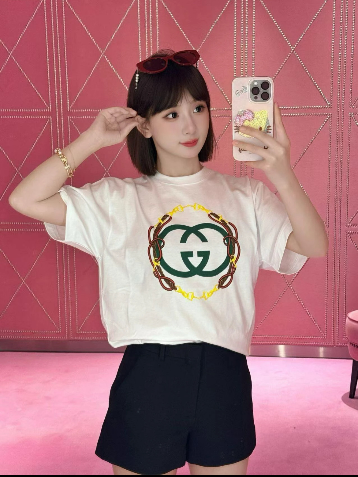 胸前的馬銜扣印花設計是整件的視覺重點,線條俐落、不過度張揚,卻能一眼看出質感與品味。