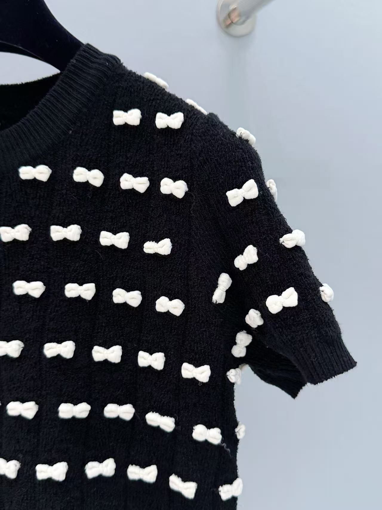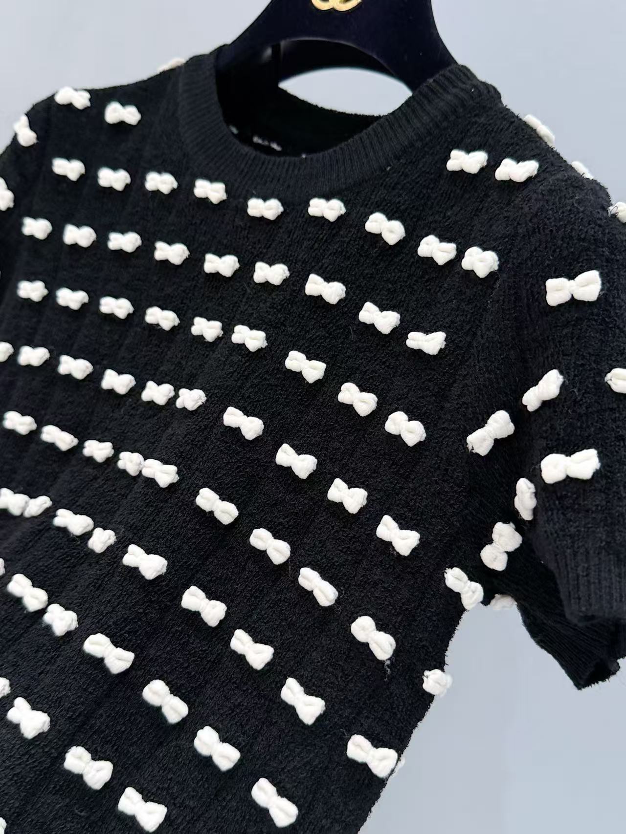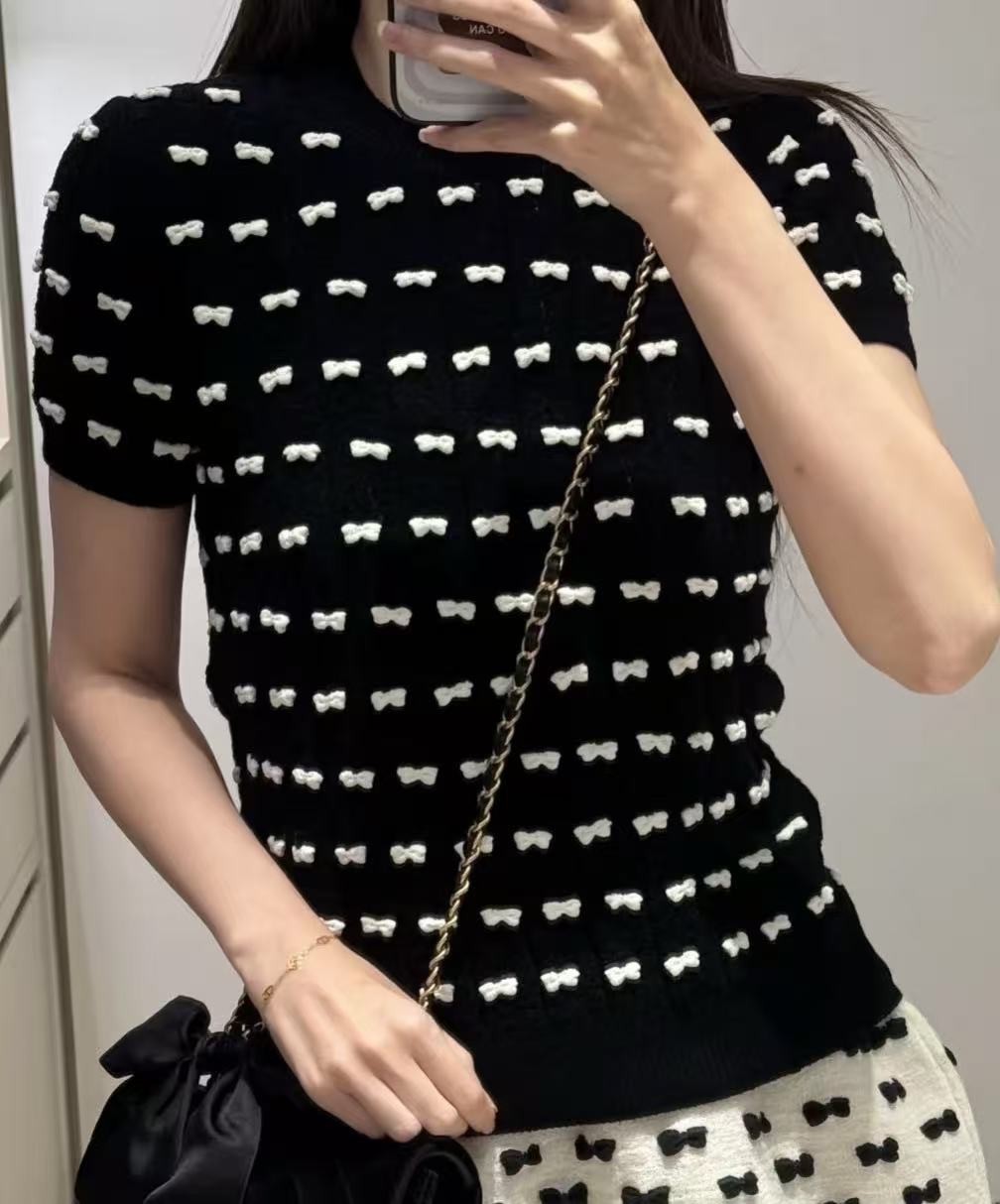 版型採用經典圓領廓形,暗藏巧思,黑白混織的針織紋理帶來視覺趣味,立體蝴蝶結如藝術符號般點綴,整體俐落卻充滿玩心,輕鬆駕馭各種風格。