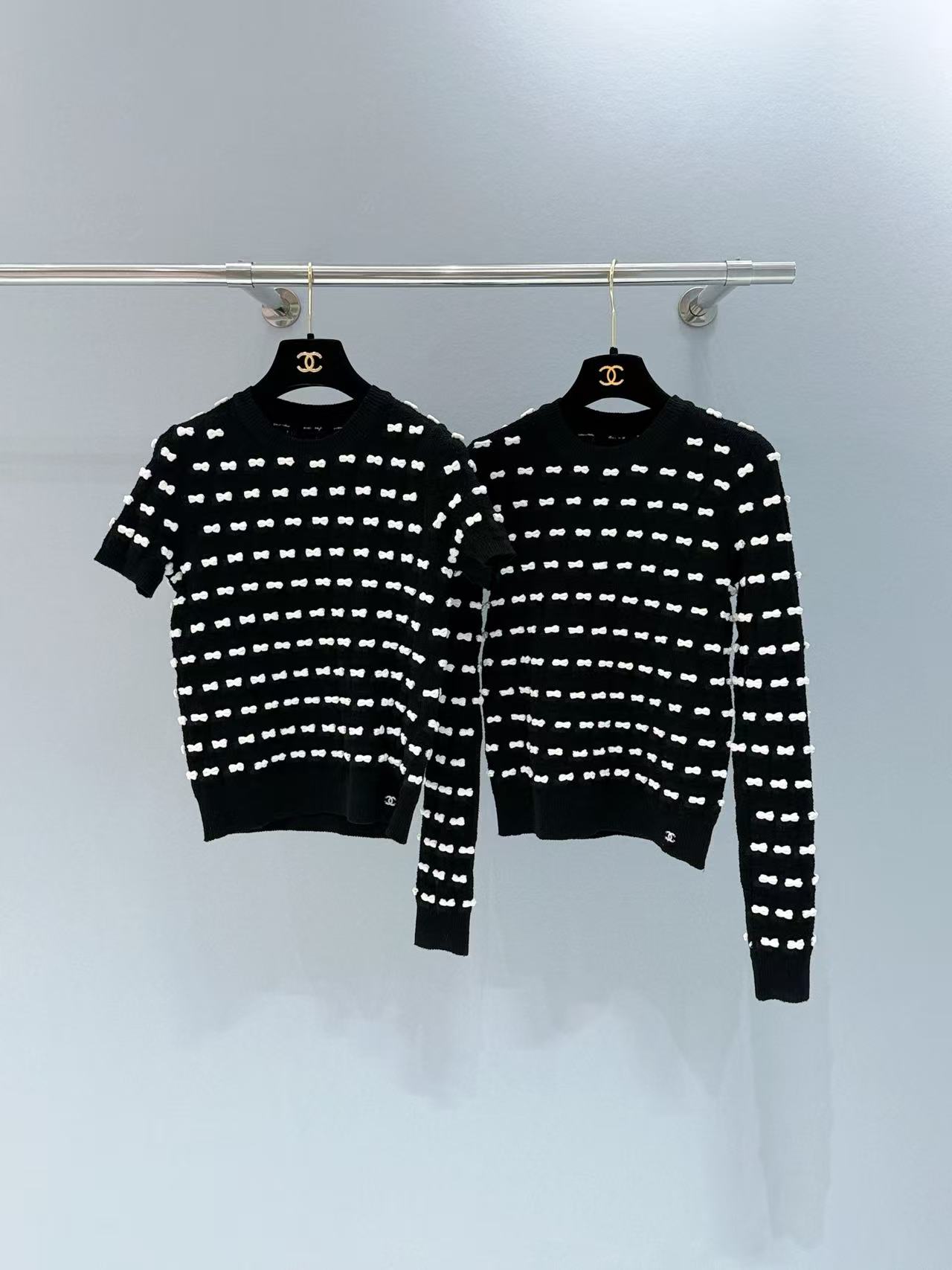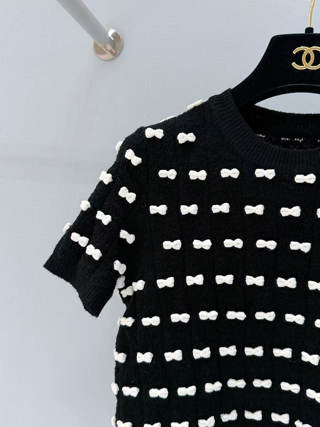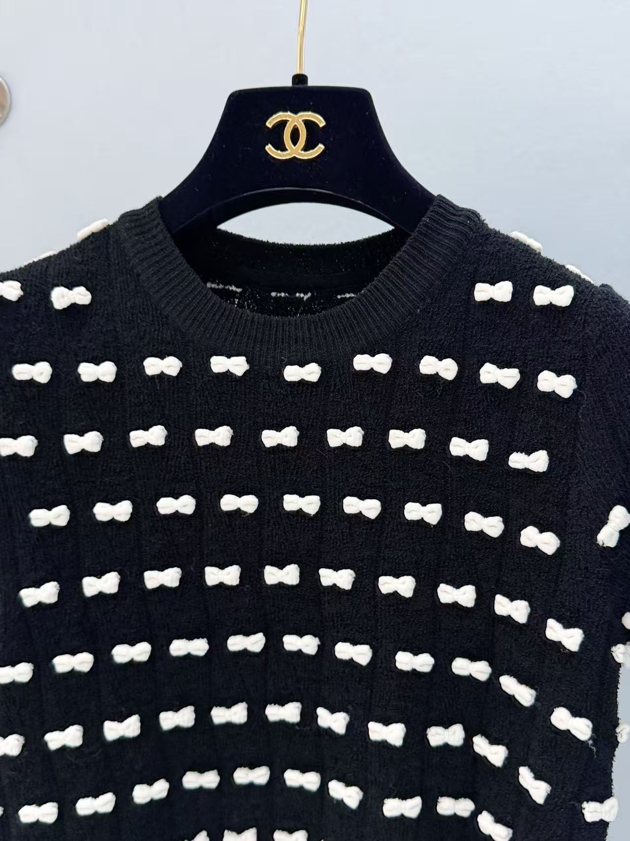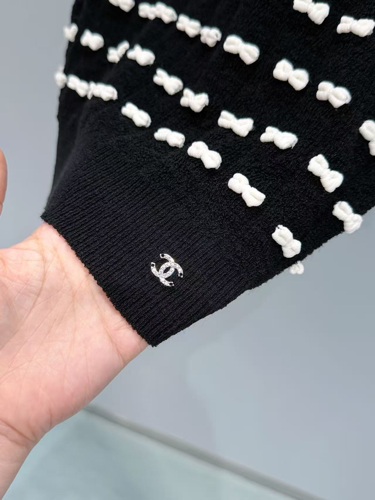版型採用經典圓領廓形,暗藏巧思,黑白混織的針織紋理帶來視覺趣味,立體蝴蝶結如藝術符號般點綴,整體俐落卻充滿玩心,輕鬆駕馭各種風格。