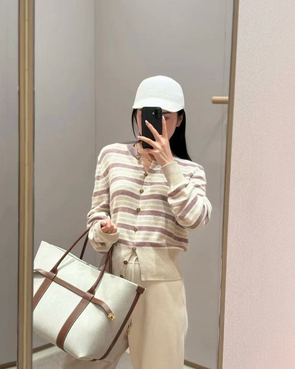 這款開衫的設計以經典條紋為基調,線條流暢且比例完美,營造出輕鬆卻高雅的氛圍。