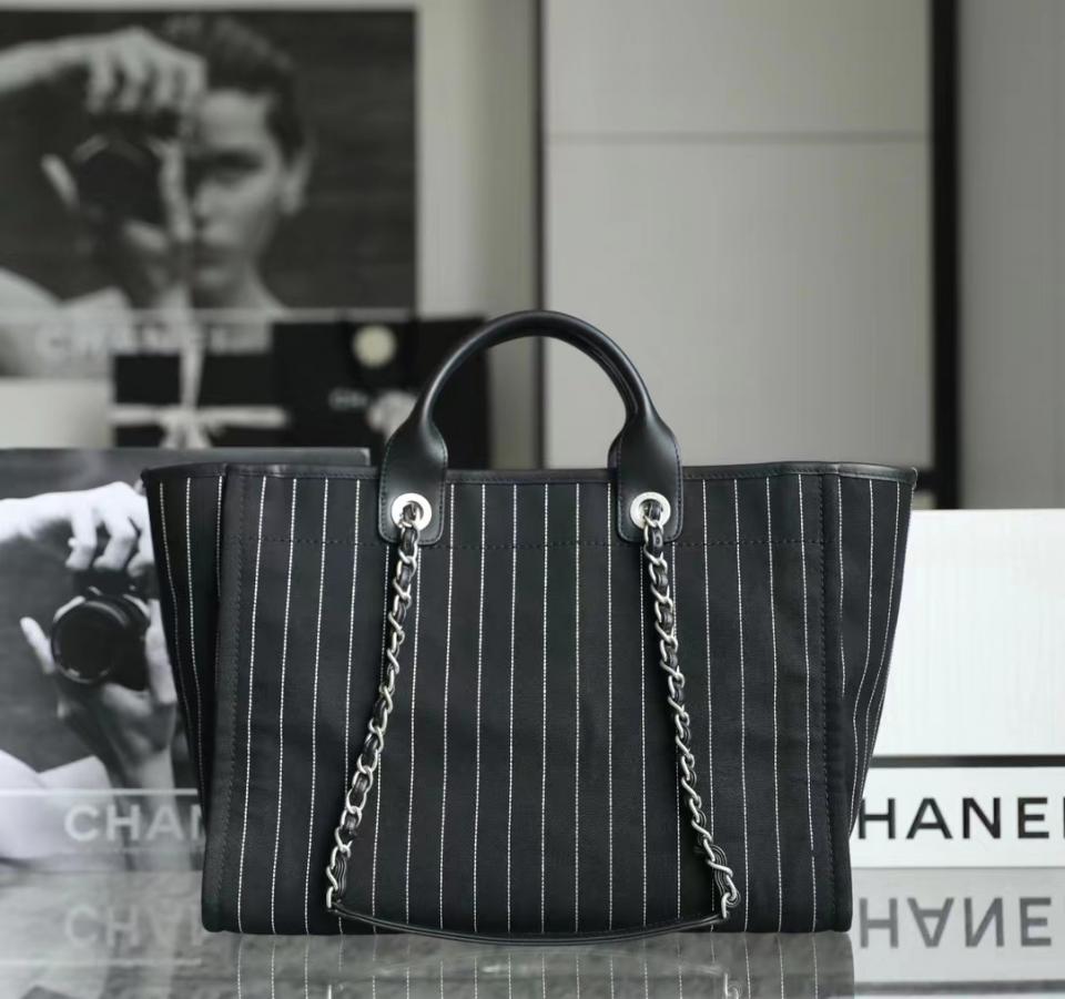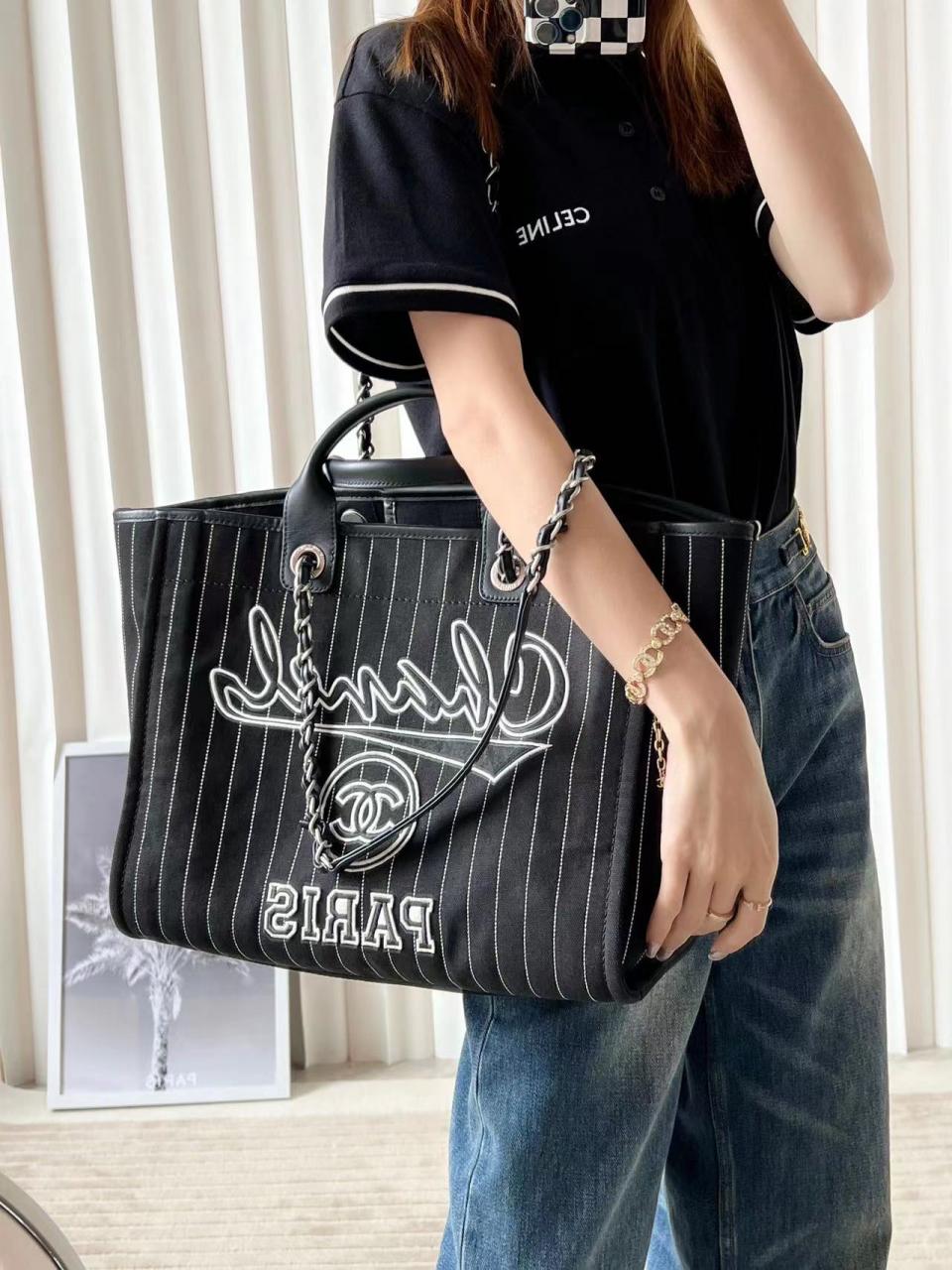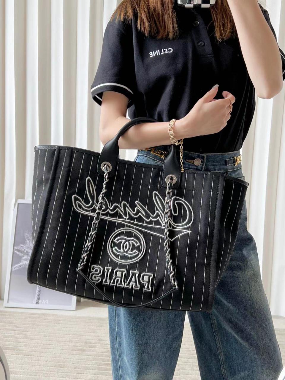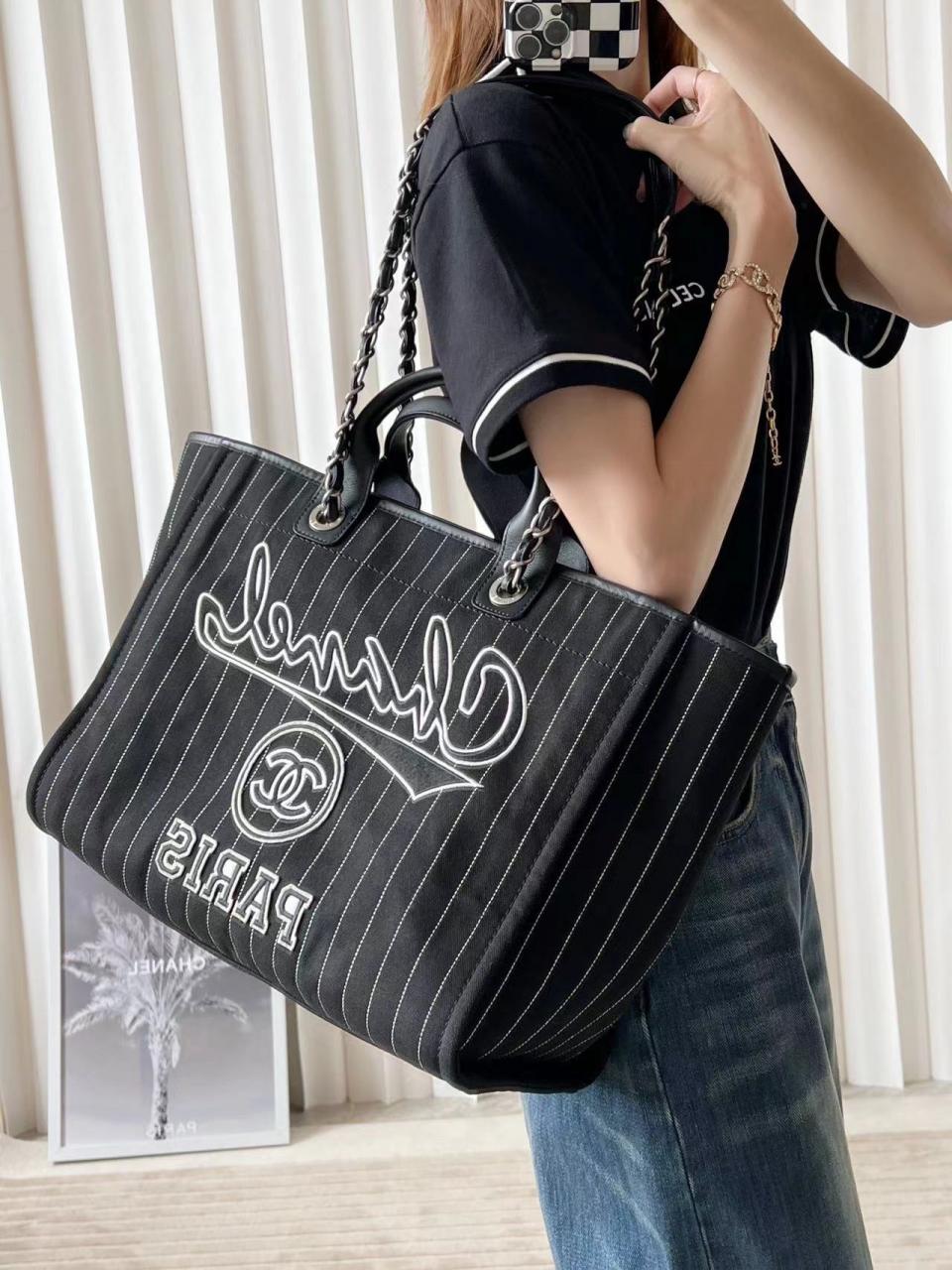 2023夏季新品 C家23p刺繡字母沙灘包(黑色大號) 條紋設計 容量超大