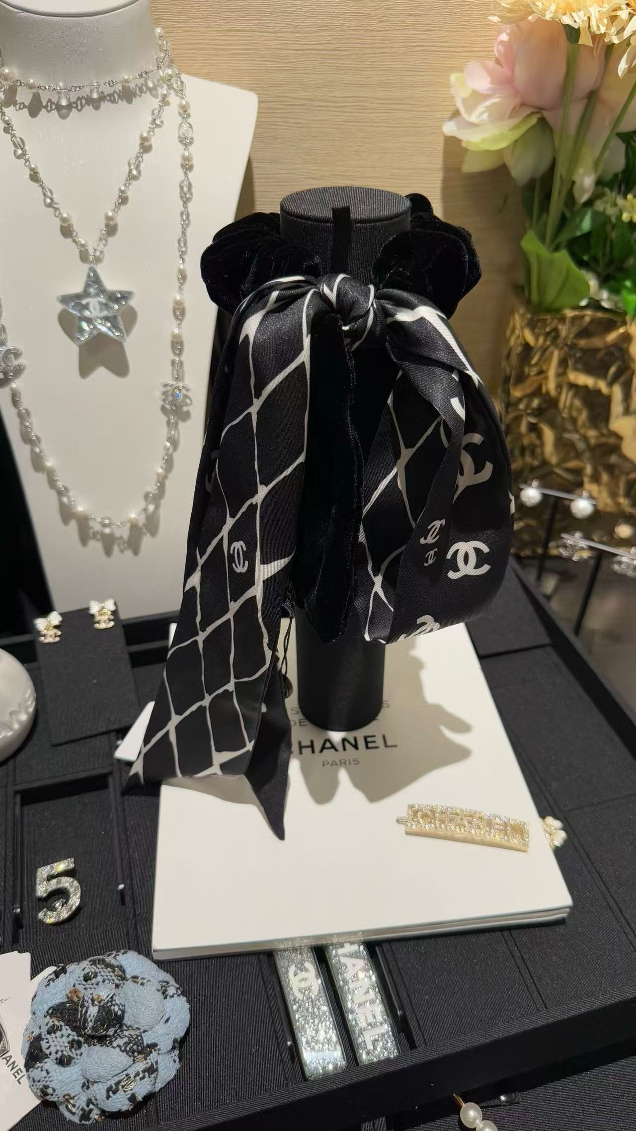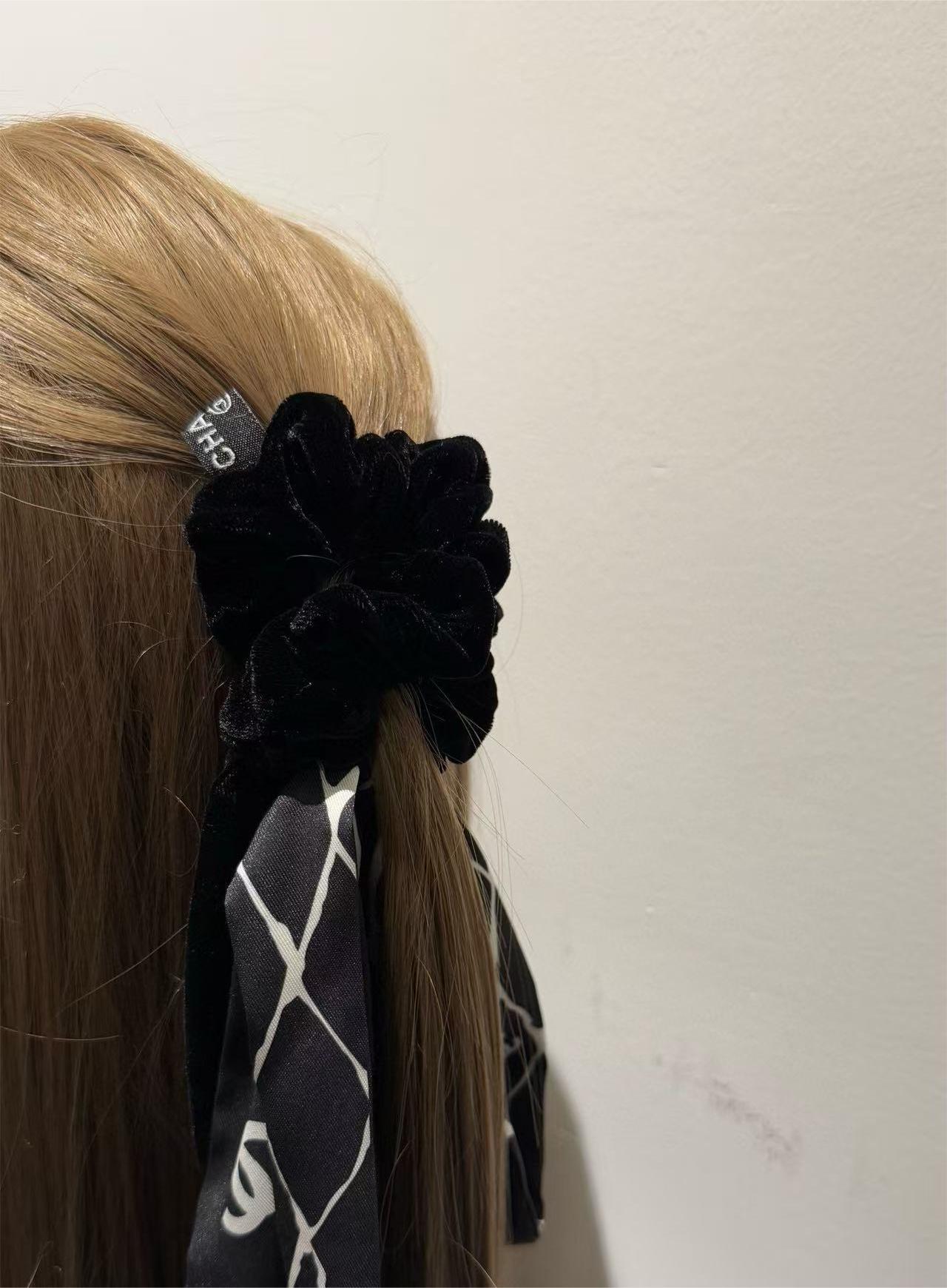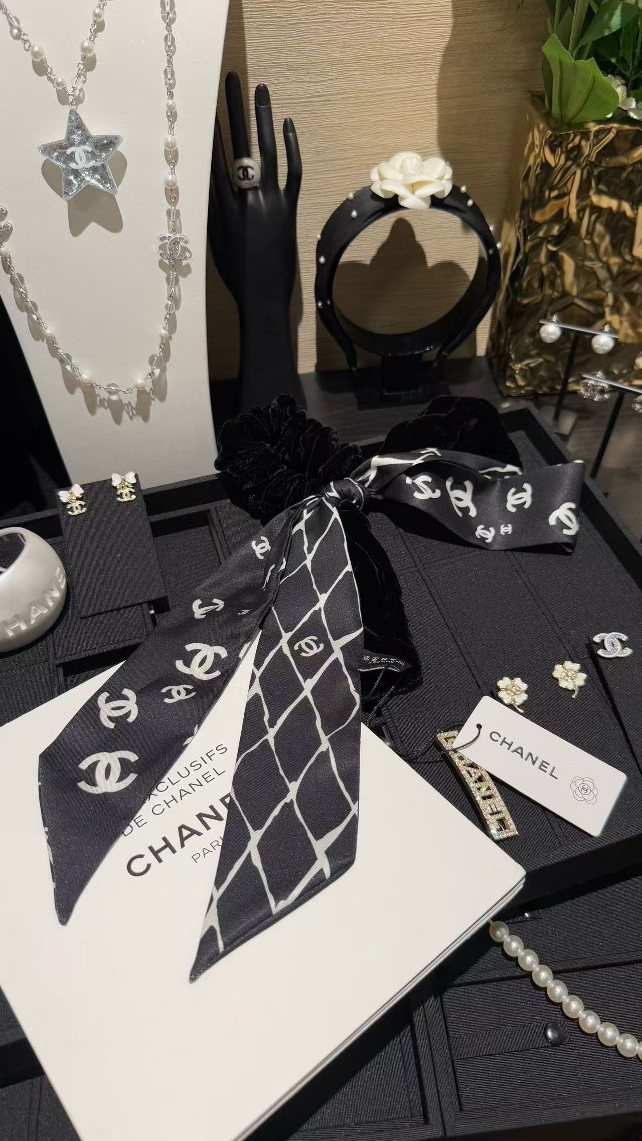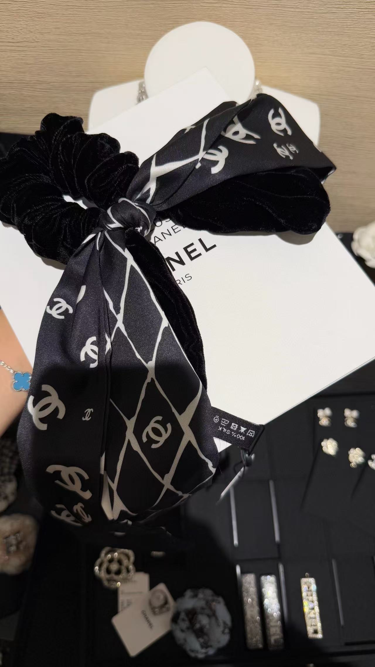 黑絲絨菱格雙C髮圈,再搭配黑白格紋雙C雙面緞帶 Twilly 絲巾的二合一設計!,CP值直接爆表!