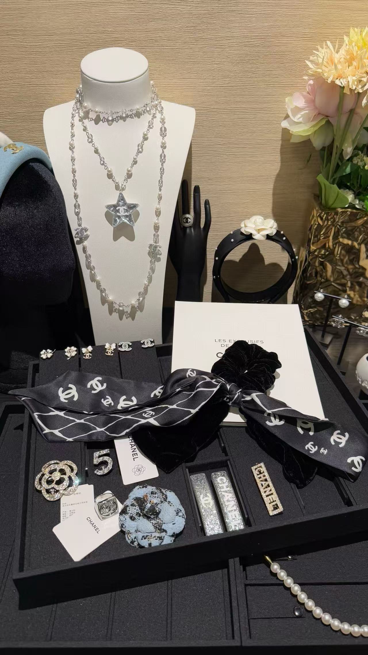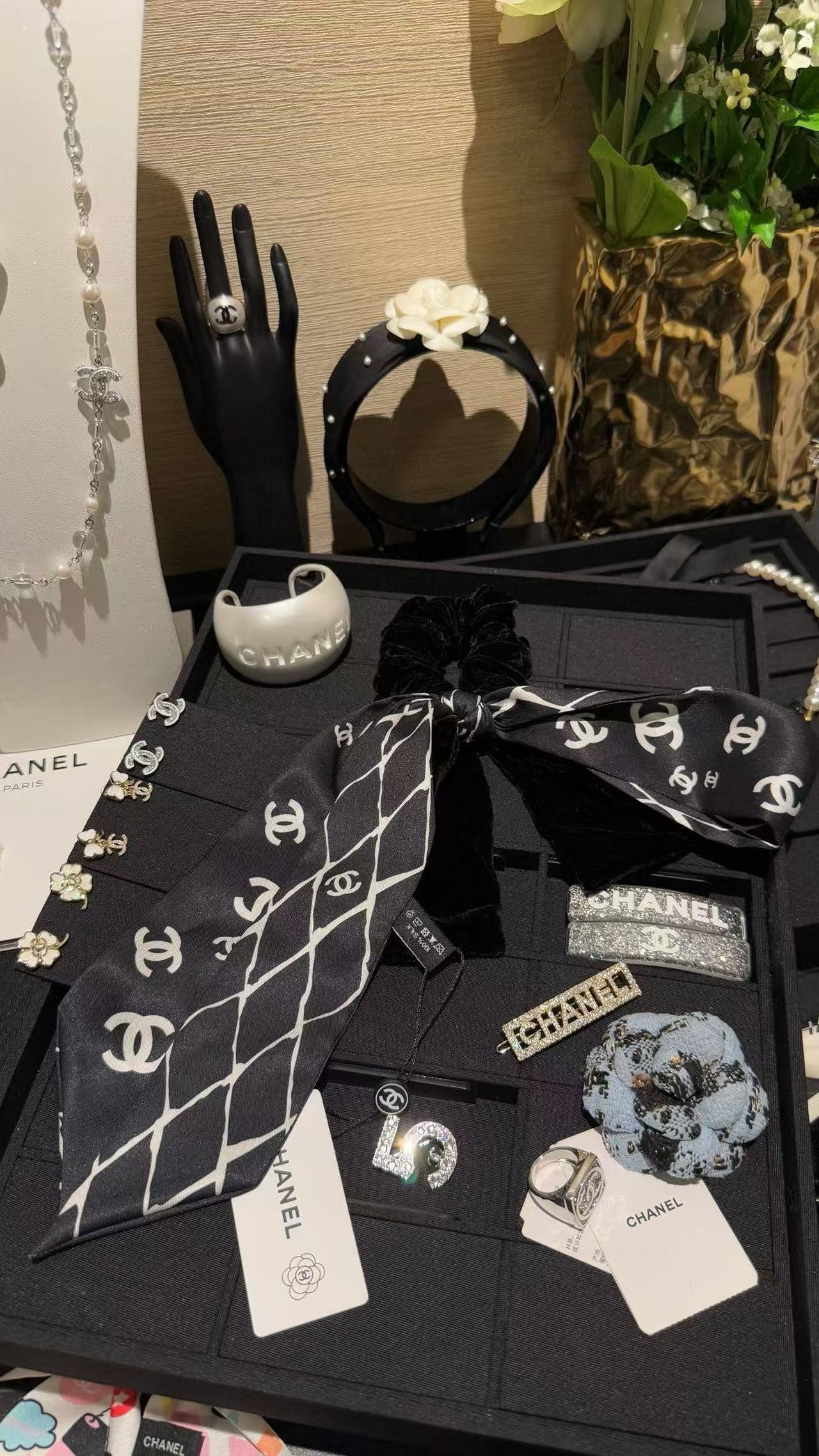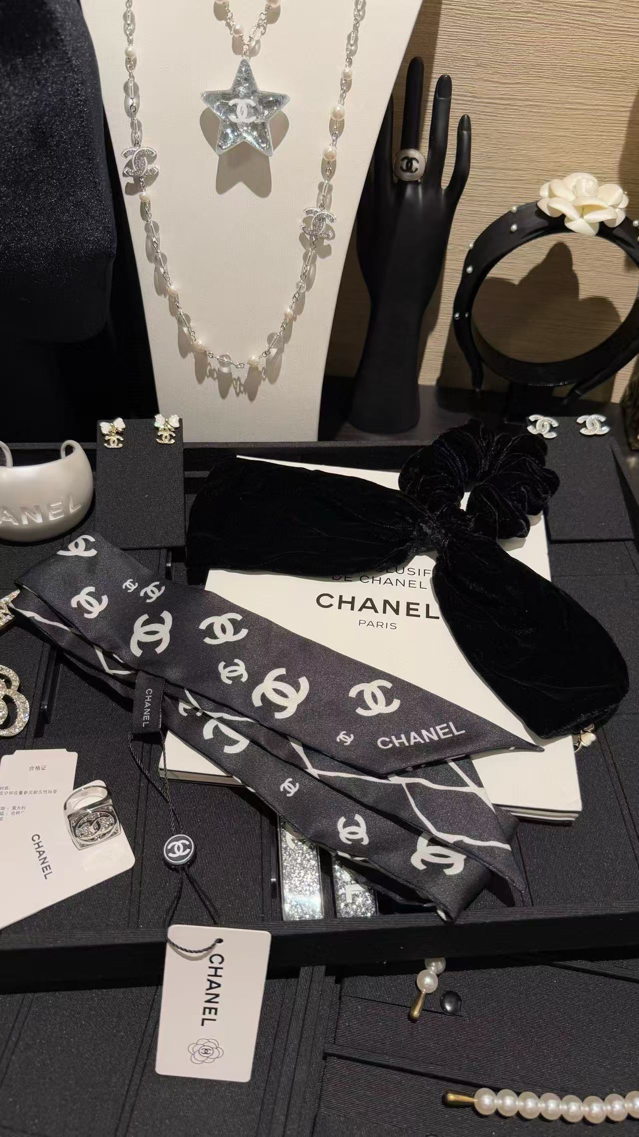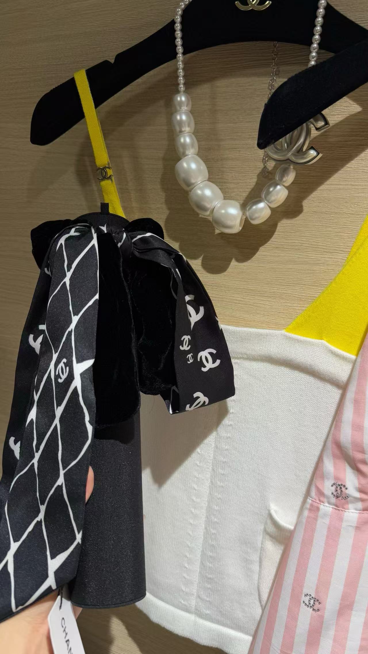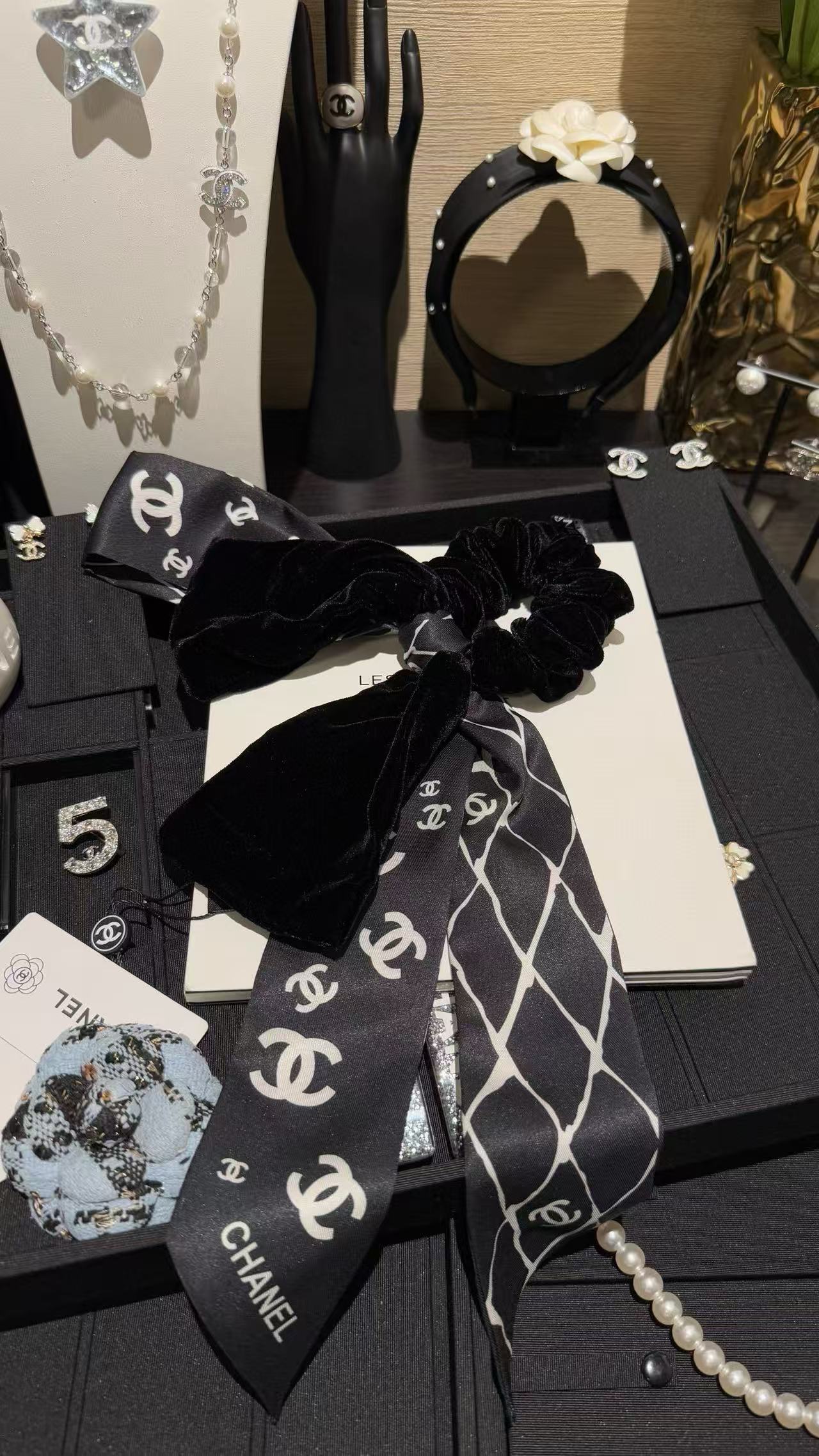 黑絲絨菱格雙C髮圈,再搭配黑白格紋雙C雙面緞帶 Twilly 絲巾的二合一設計!,CP值直接爆表!