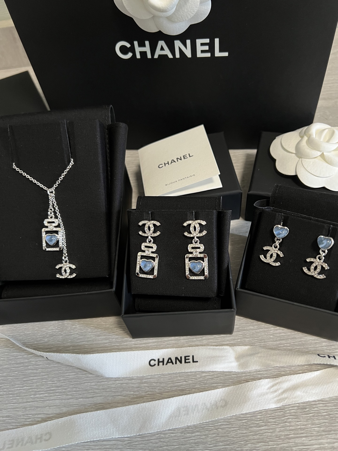 設計靈感來自品牌經典香水瓶輪廓,結合標誌性的雙C Logo,吊墜心型細節則以夢幻藍色演繹,整體散發一種剛剛好的浪漫氛圍,既優雅又帶點甜美的俏皮。