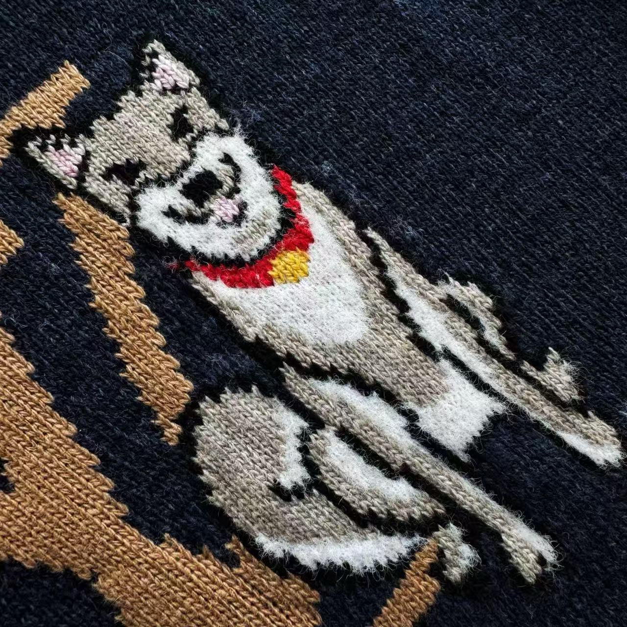 這不僅是一件毛衣,更是一件藝術作品。透過頂級的畫花製版與極度繁複的編織工序,將柴犬的生動神態展露無遺,營造出既有高級感又充滿溫度的層次氛圍。