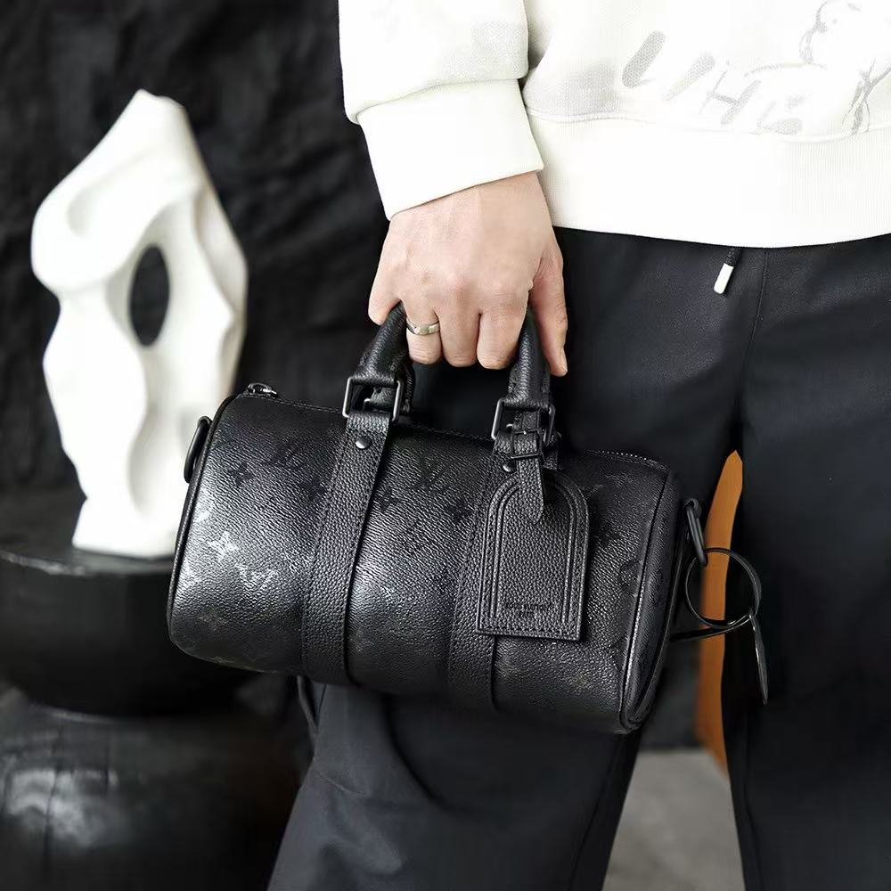 25 公分的精巧尺寸,不僅保留了 Keepall 經典的波士頓包型,更優化了日常斜背的比例。這不僅是一款手袋,更是一件展現極簡叛逆美學的藝術品,無論是搭配全黑的暗黑系層次穿搭,或是洗鍊的都會商務造型,都能以其強大的氣場定義您的品味格調。