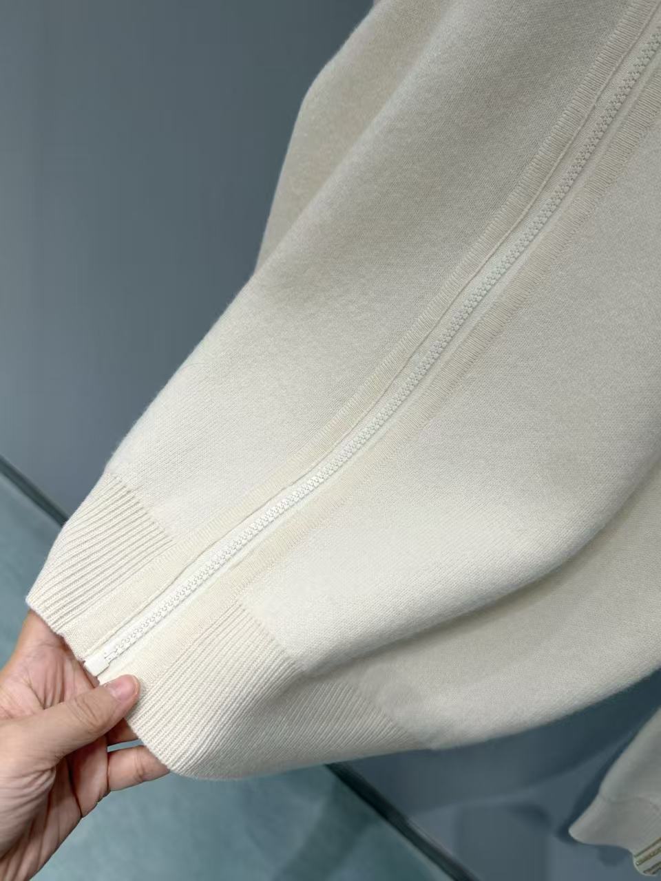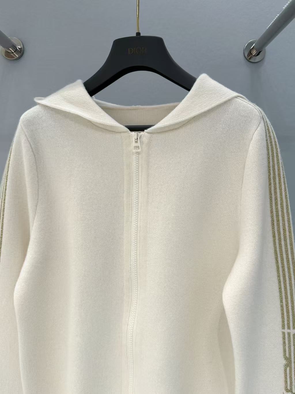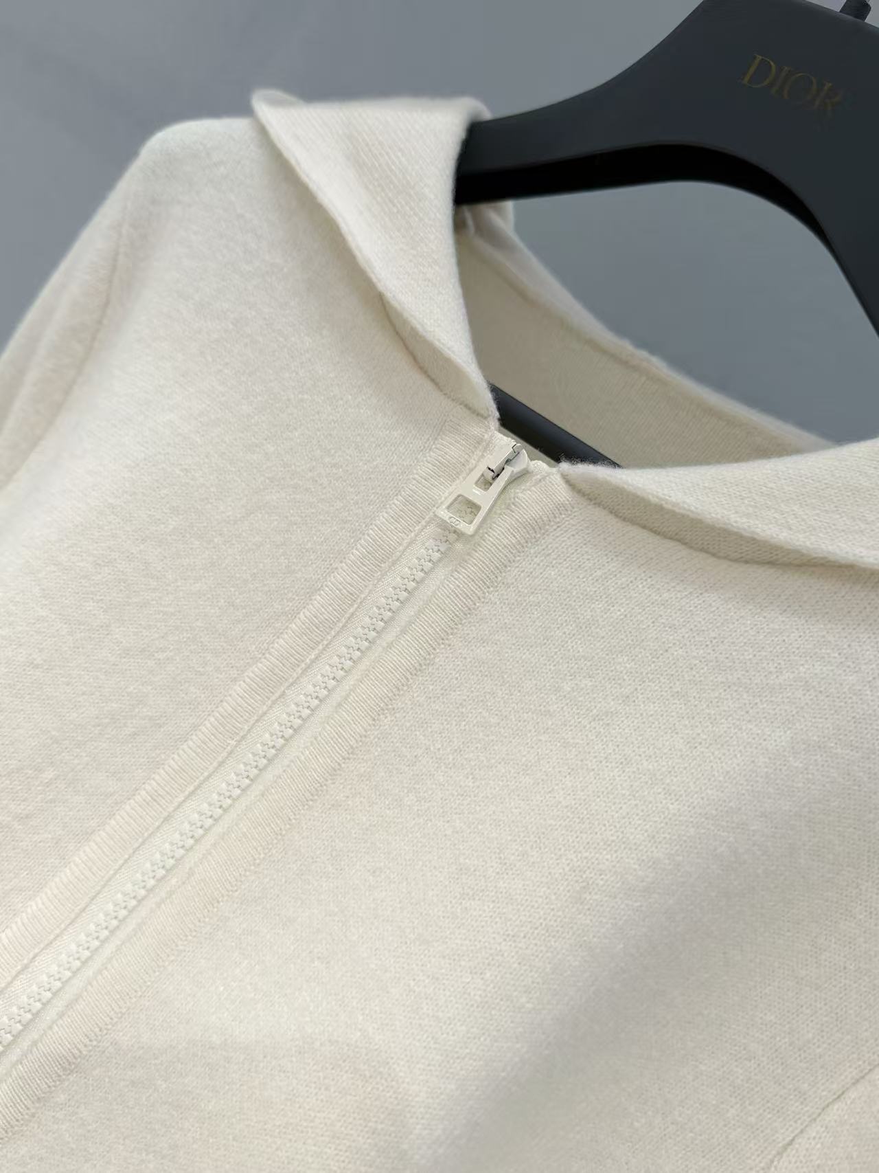 設計是經典拉鍊連帽款,袖子與前襟都有低調的Oblique滿版提花,遠看乾淨、近看才有驚喜,辨識度很高卻一點都不張揚。