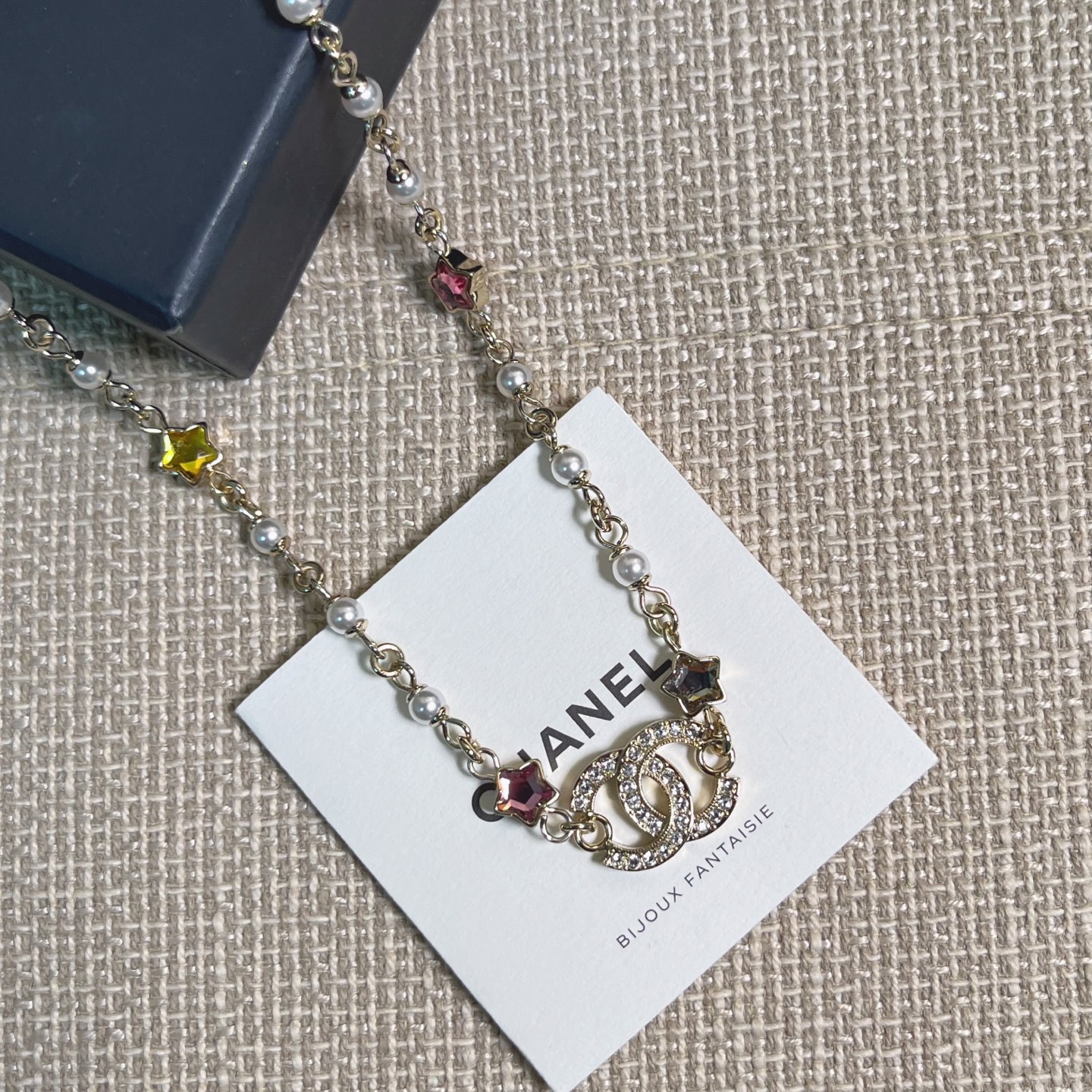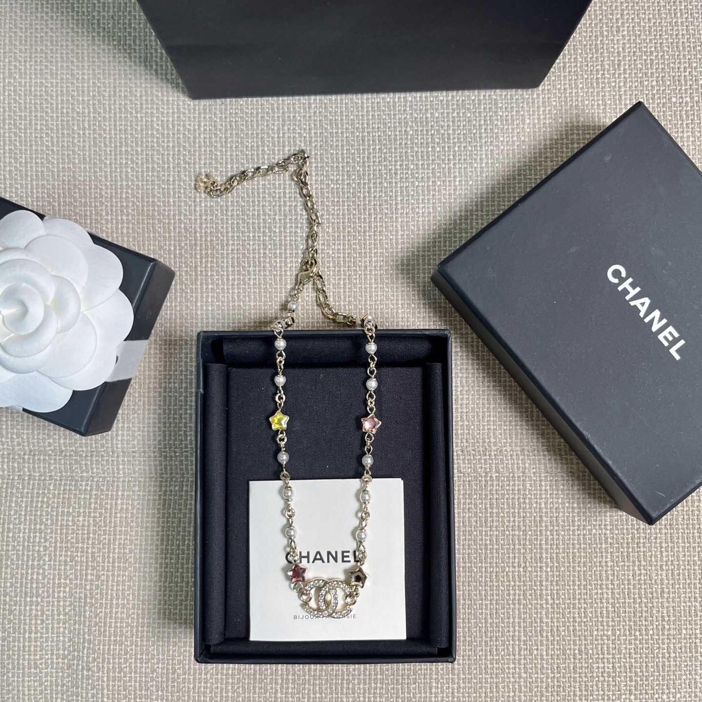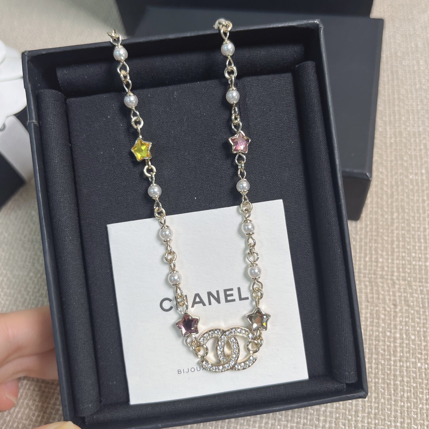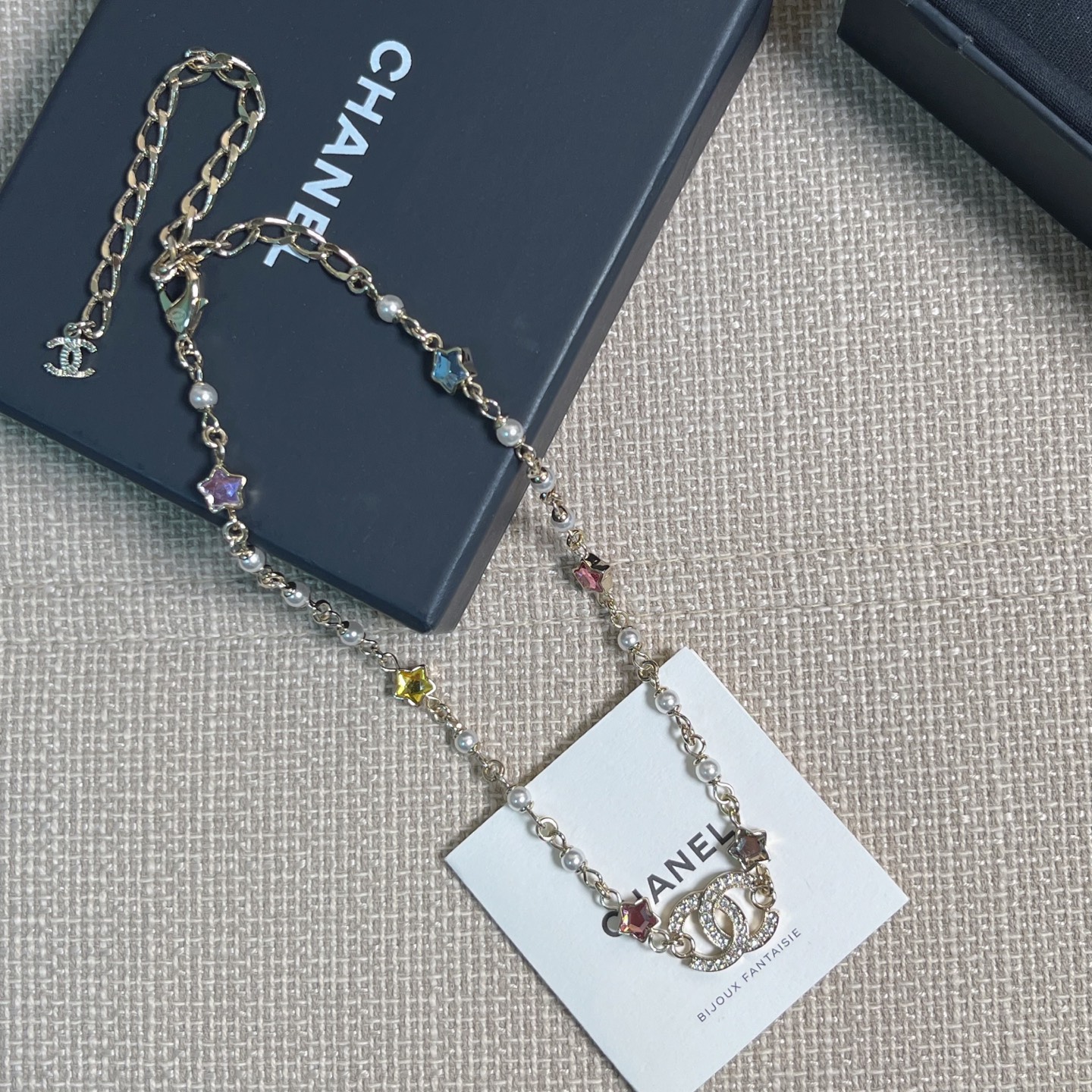 整體設計充滿童趣與精緻的融合感,將經典雙C標誌結合五彩星星元素,展現出既時尚又甜美的氣質。每一顆彩星色調都柔和明亮,讓整條項鍊在光線下閃爍得剛剛好,不浮誇卻非常吸睛。
