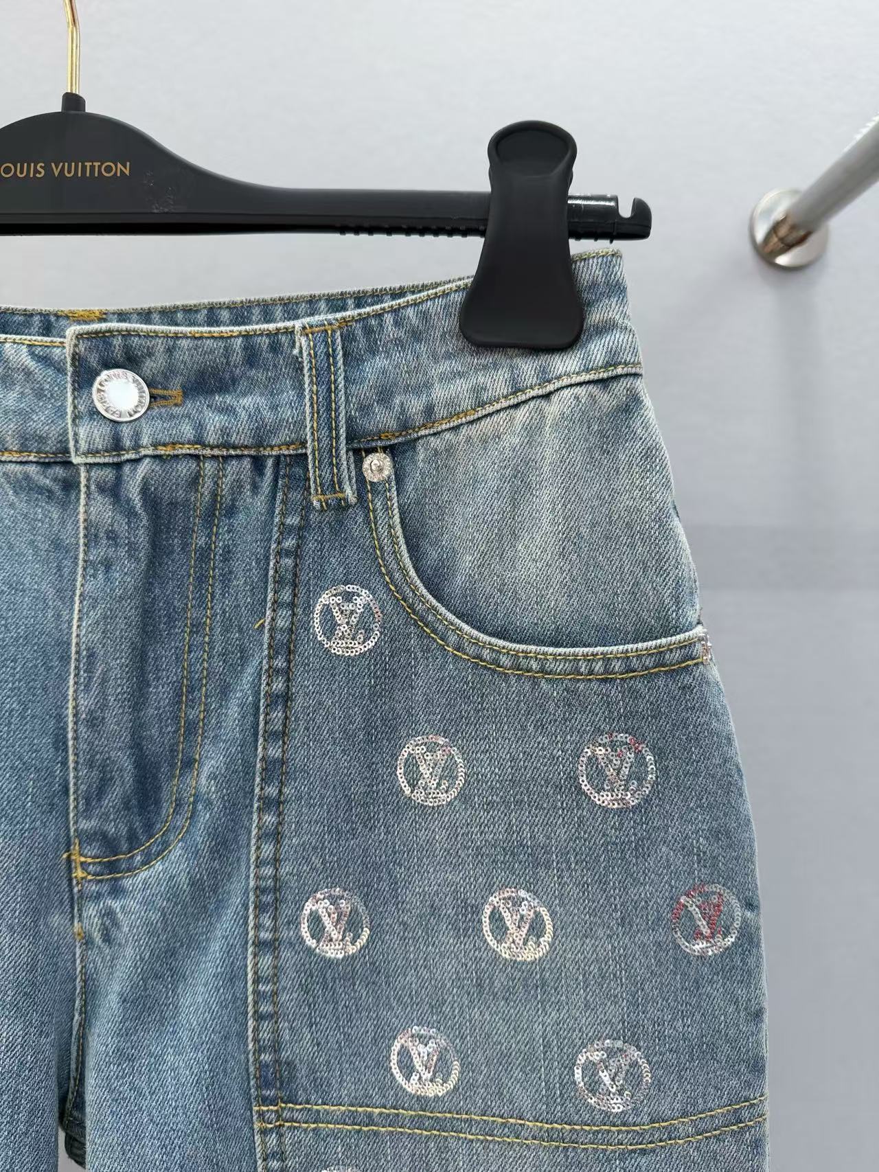 褲身滿滿手工縫製銀色亮片 LV Logo,走一步就閃一次,陽光下像雪花折射、室內燈光下又低調內斂,那種「不刻意卻貴氣逼人」的精緻。