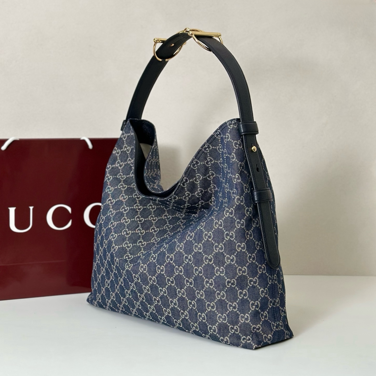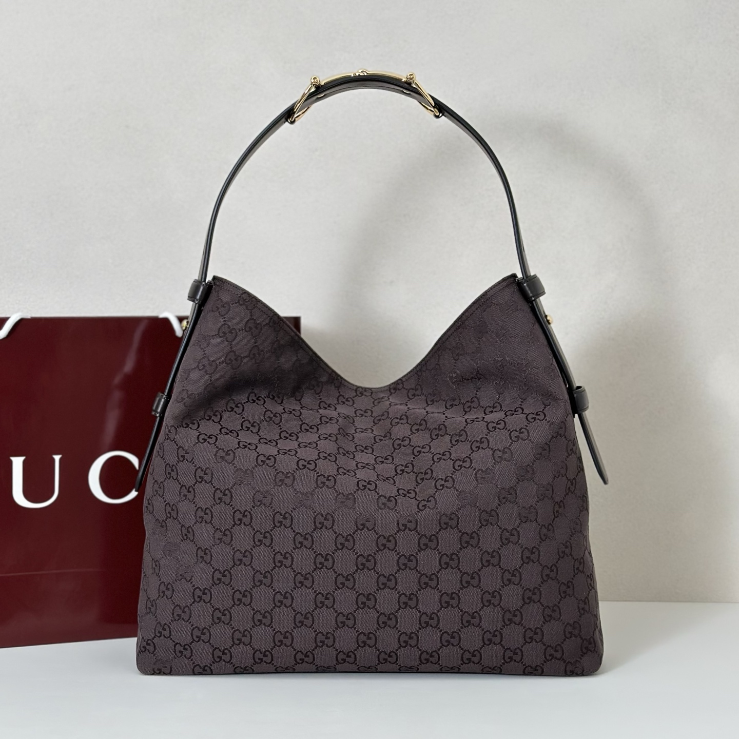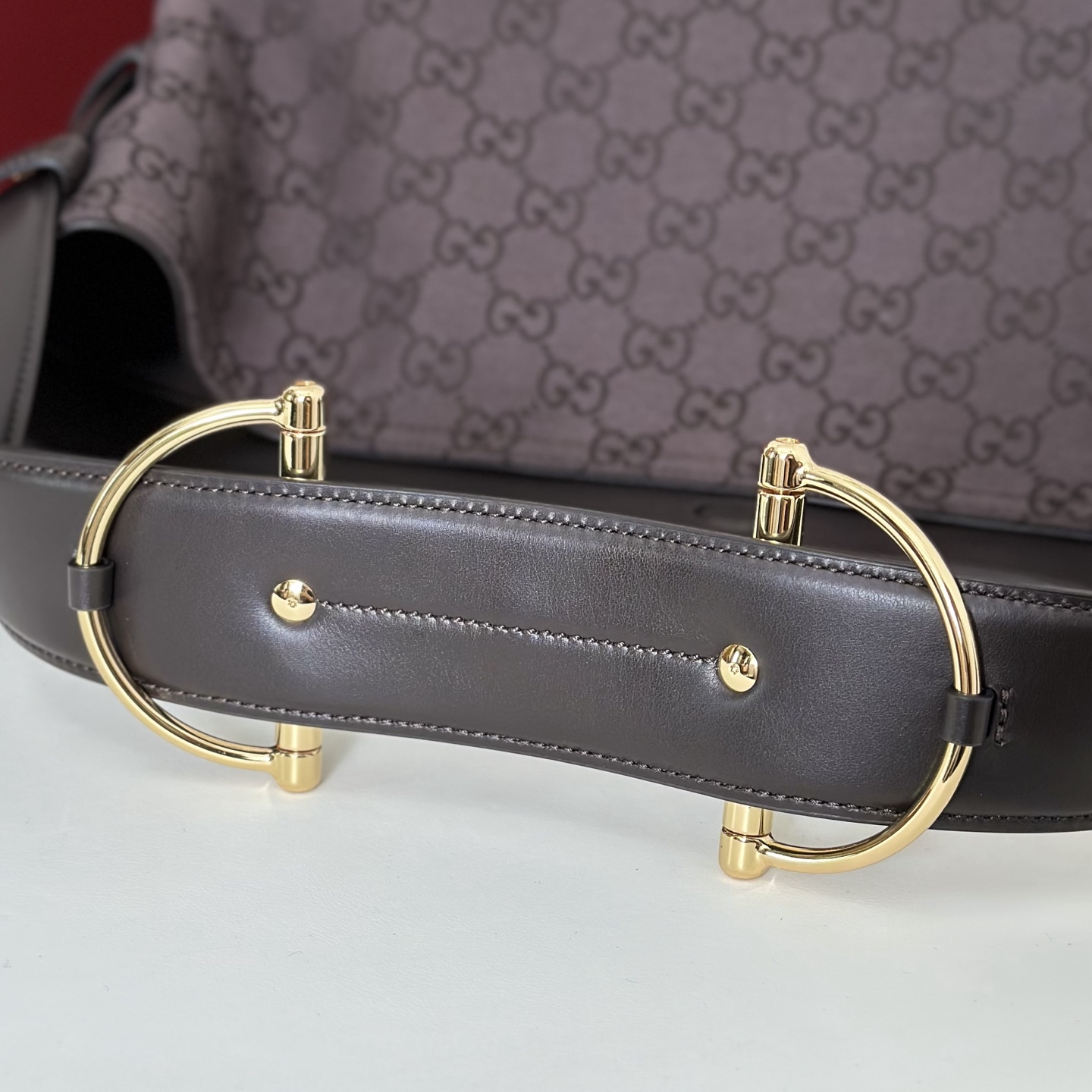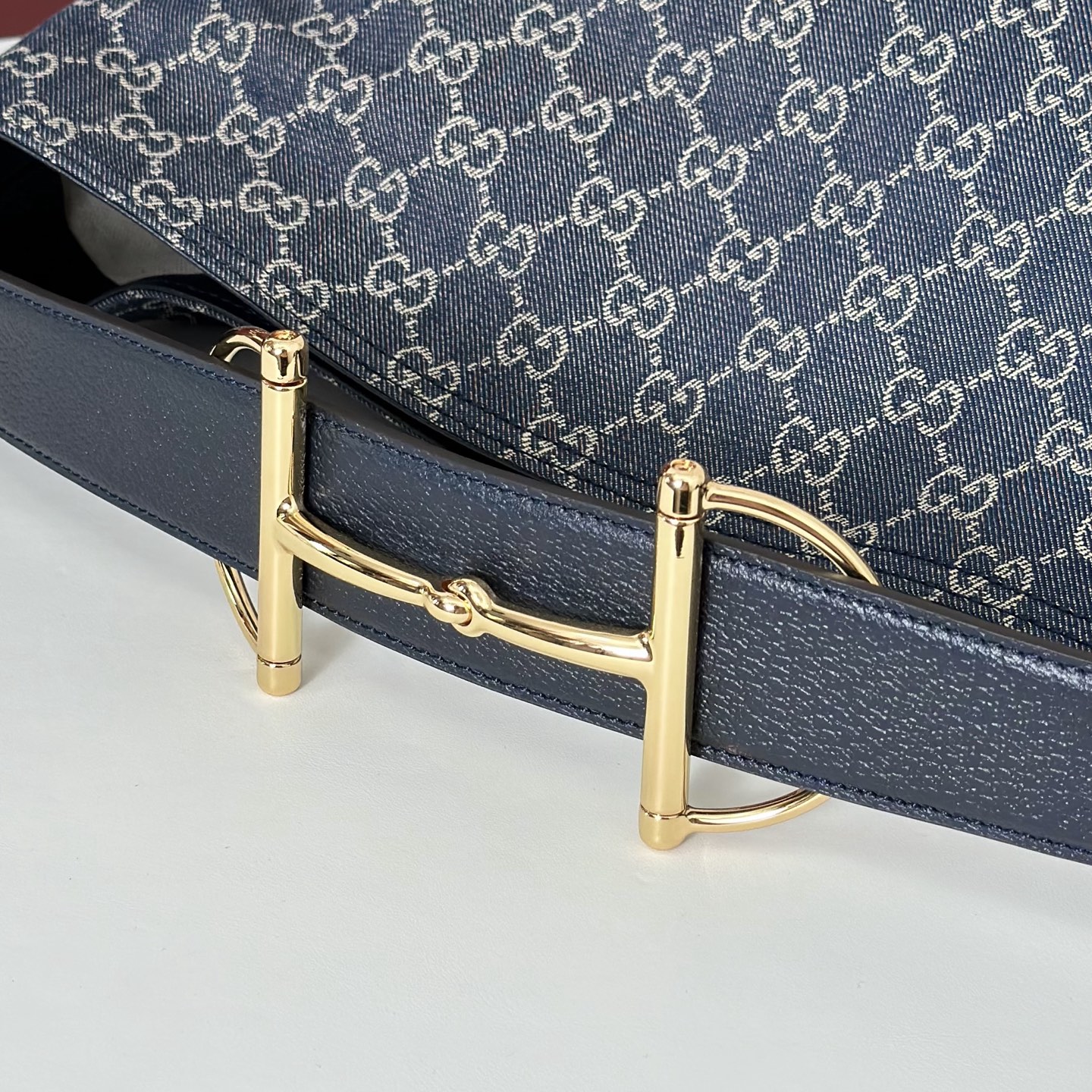 主體採用經典GG花紋帆布,質地堅韌耐磨,搭配細緻牛皮邊飾,整體更添高級層次。金色調五金件則為整體注入一抹溫潤亮點,讓整體設計更顯精緻與立體感。