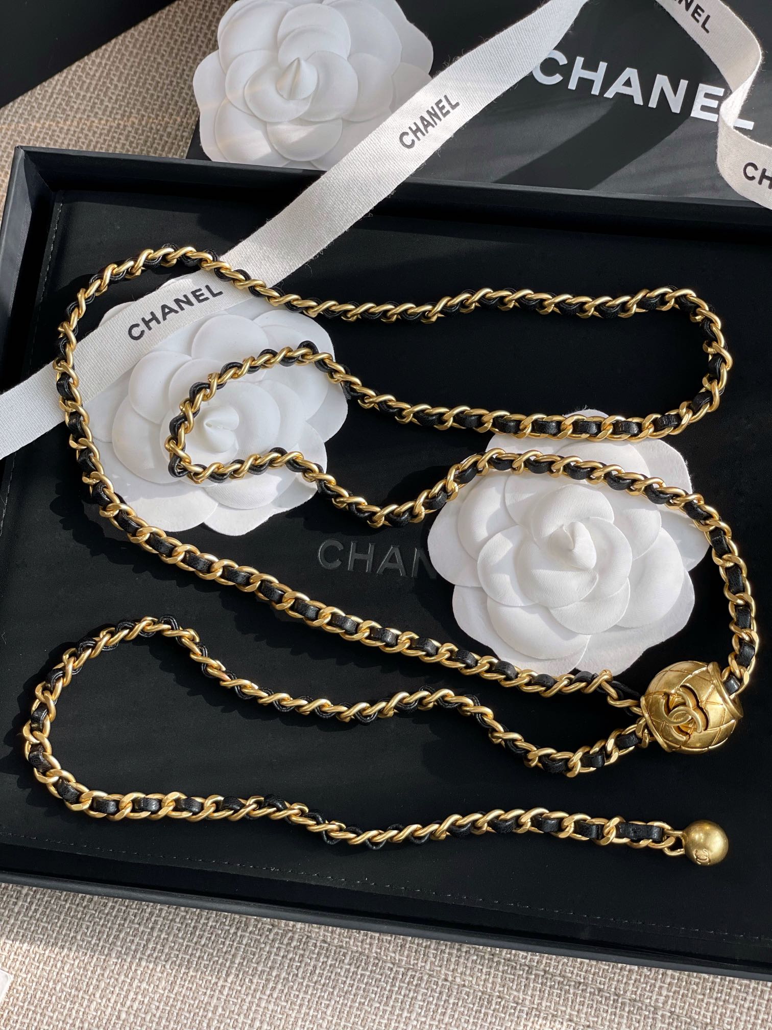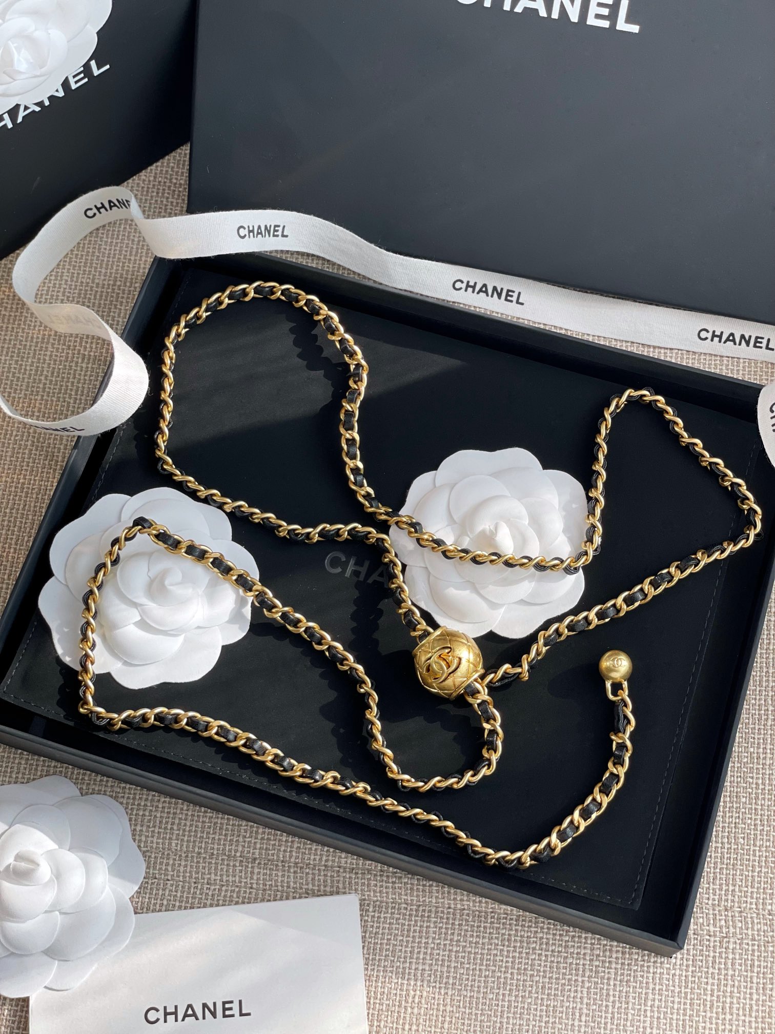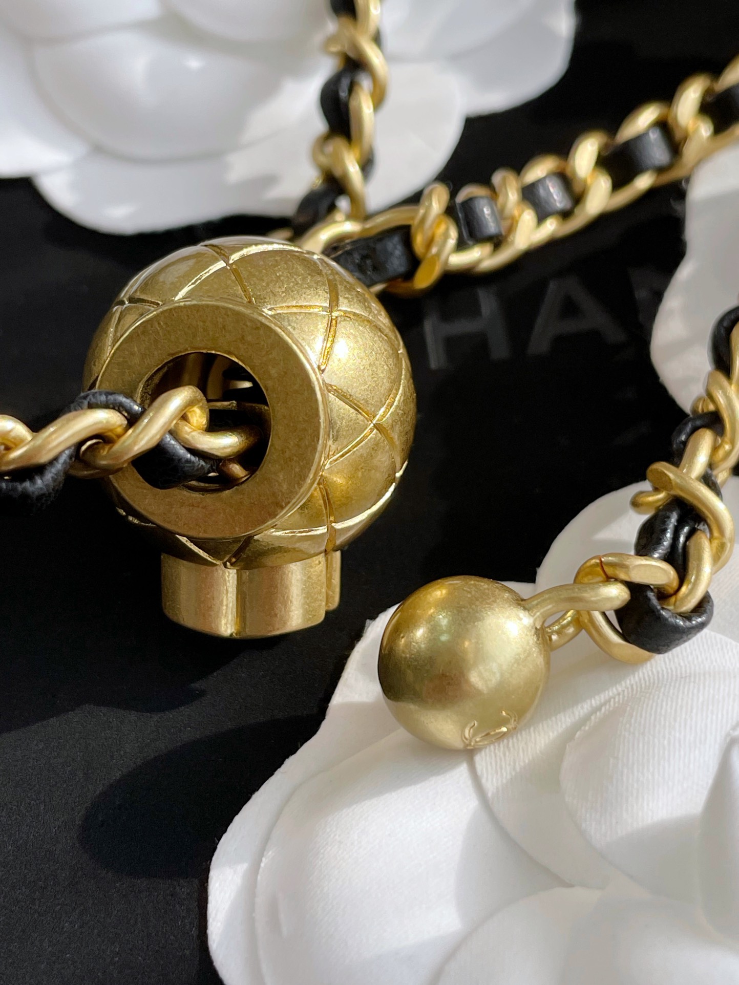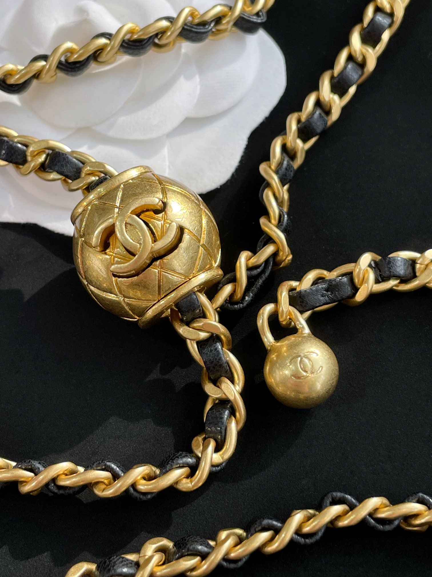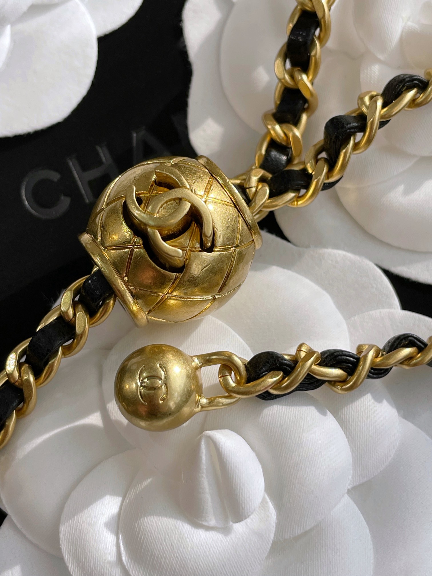 金球上的雙C標誌是調節按鈕,可自由調整長度,一條腰鍊即可變化多種造型——腰鍊、長鍊、短項鍊(繞兩圈)、斜背鏈、包包鏈,百搭又實用。