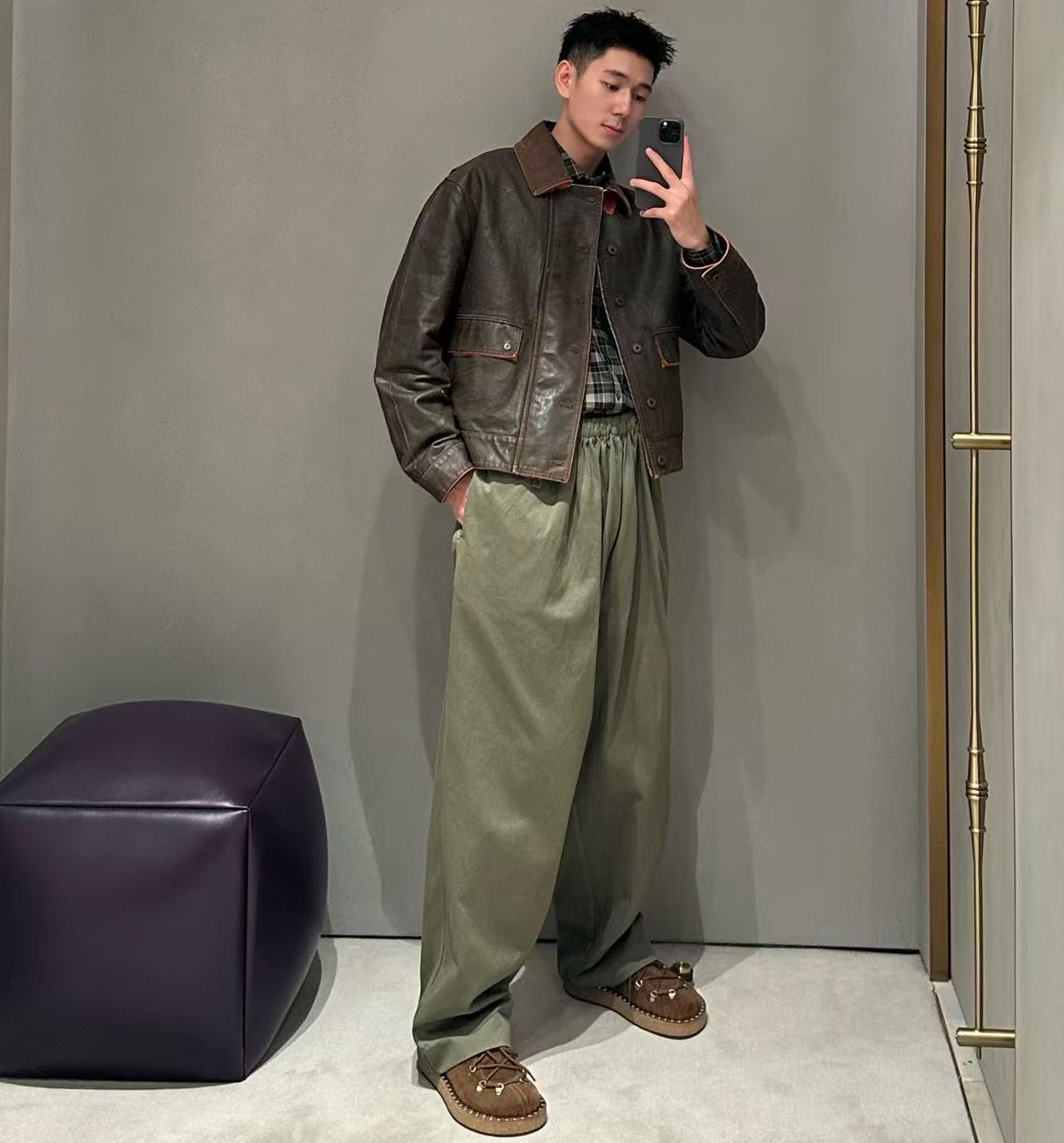 這件長褲的材質真的非常講究!它使用了高克重的棉質緞面材料,這種材質摸起來手感光滑、舒適,帶有一種高級的微光澤感,讓軍綠色看起來更有深度。