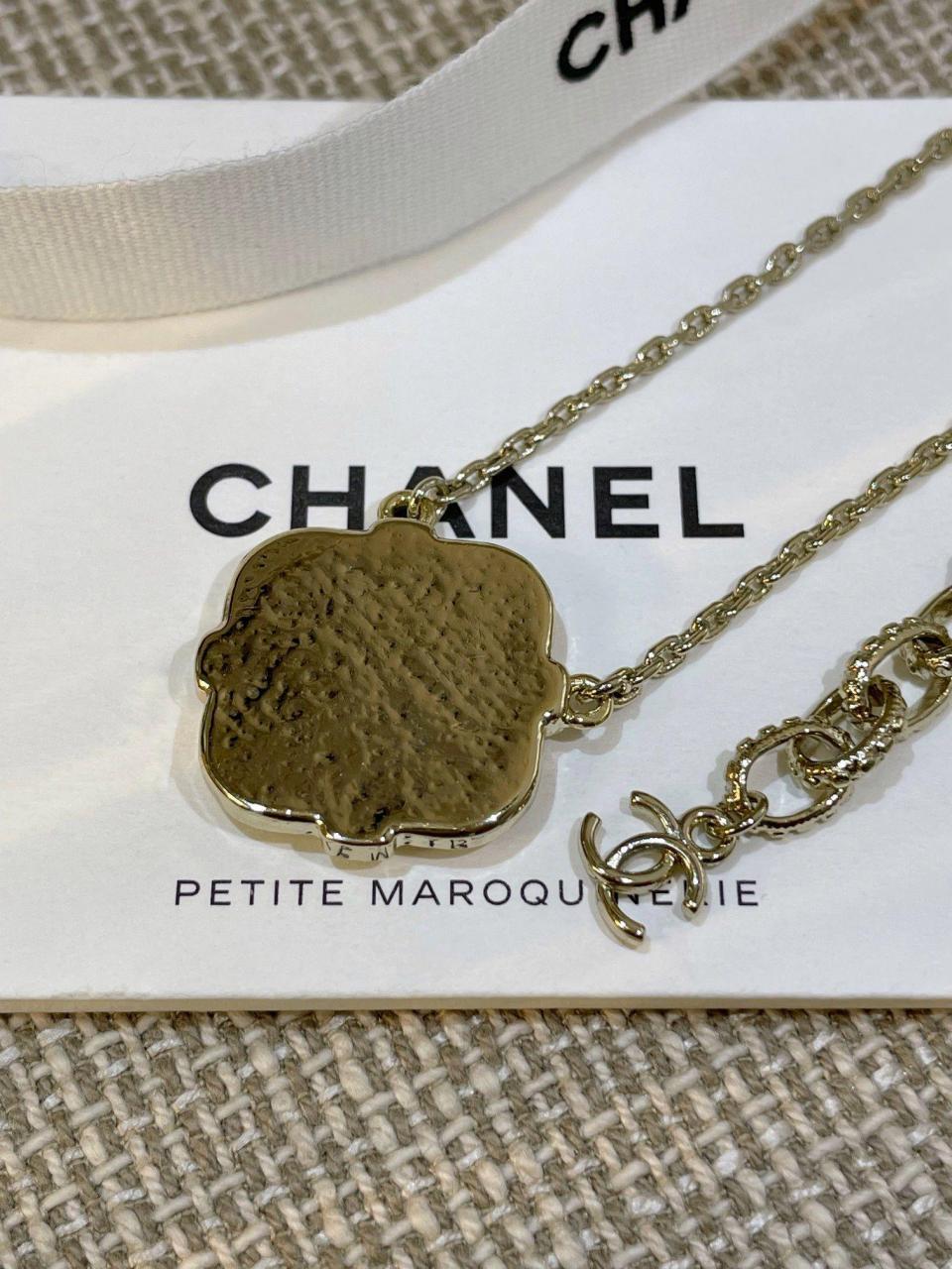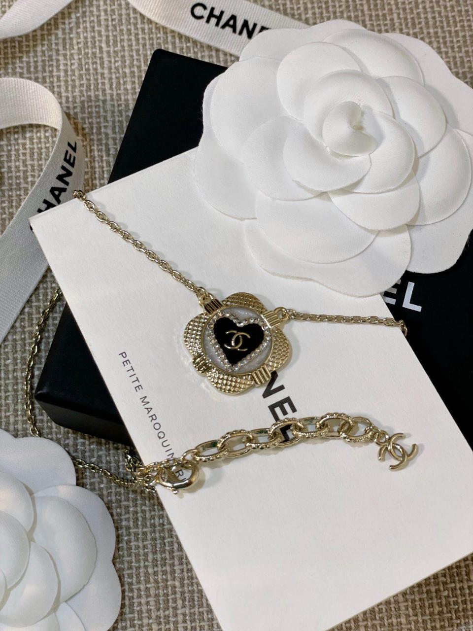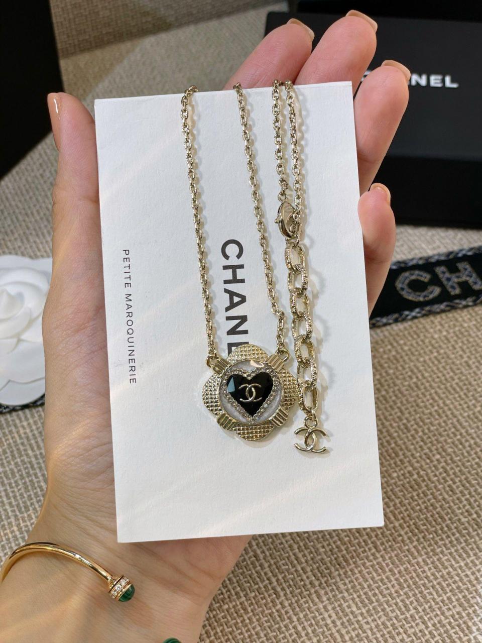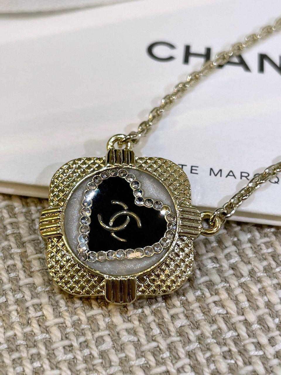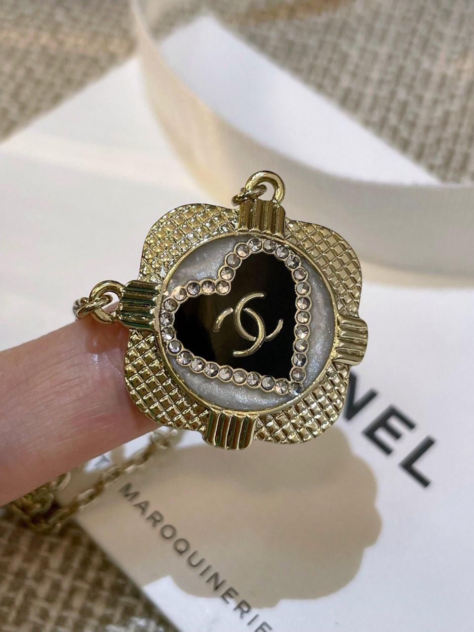 表面菱格的設計,中間底部由白色琺瑯和黑色琺瑯組成,白琺瑯是有加閃粉的,黑白中間再點綴一圈施華洛水鑽圍成愛心的形狀,再來就是經典的金屬小雙C,整個是在黑琺瑯裡邊固定住的,非常費工費時間,鏈條長短可調節尺寸,使得在時尚的同時不失經典的味道