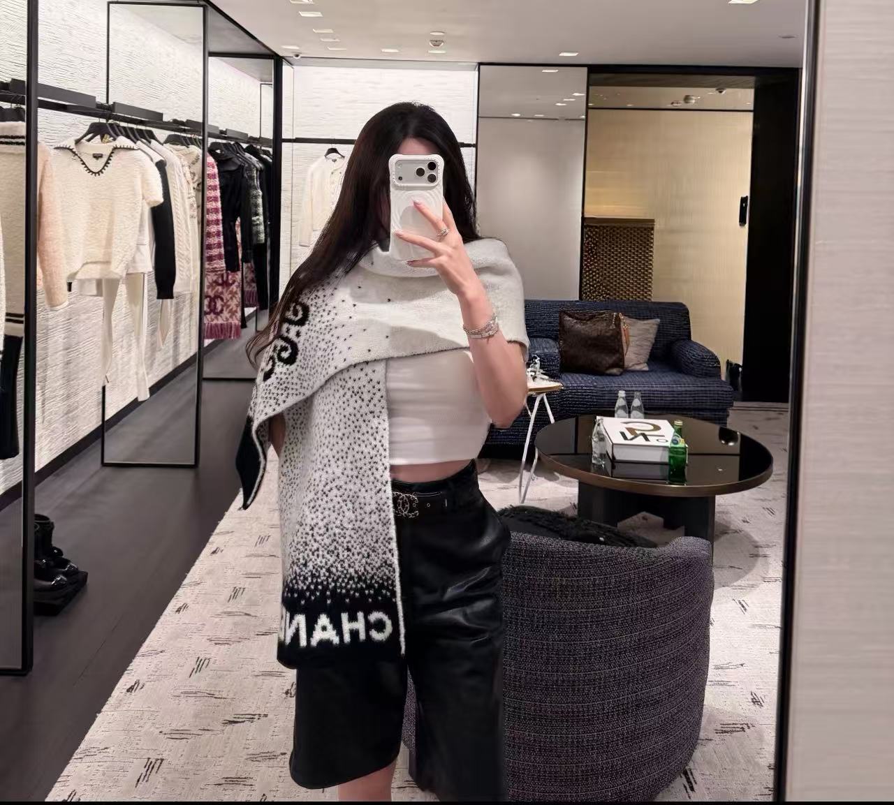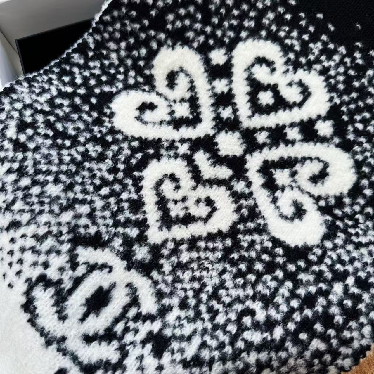 這條根本是「把雪山貴婦直接圍在脖子上」的夢幻單品,遠看就是黑白經典配色,近看才發現整條是立體7針拔花+凹凸格紋+漸變雙C若隱若現,隨便一圍整個氣場從台北變阿爾卑斯山頂,貴到讓路人自動幫你讓路~