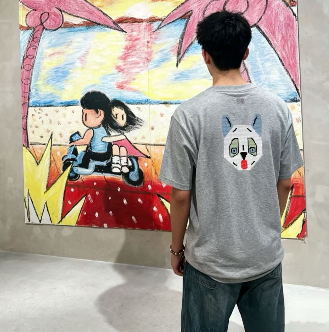 這件 T 恤最令人驚艷的是它對細節的處理,特別是貓咪圖案採用的米粒線條刺繡,讓圖案看起來像是手繪筆觸,充滿了生動的藝術氣息和極致的細膩感。
