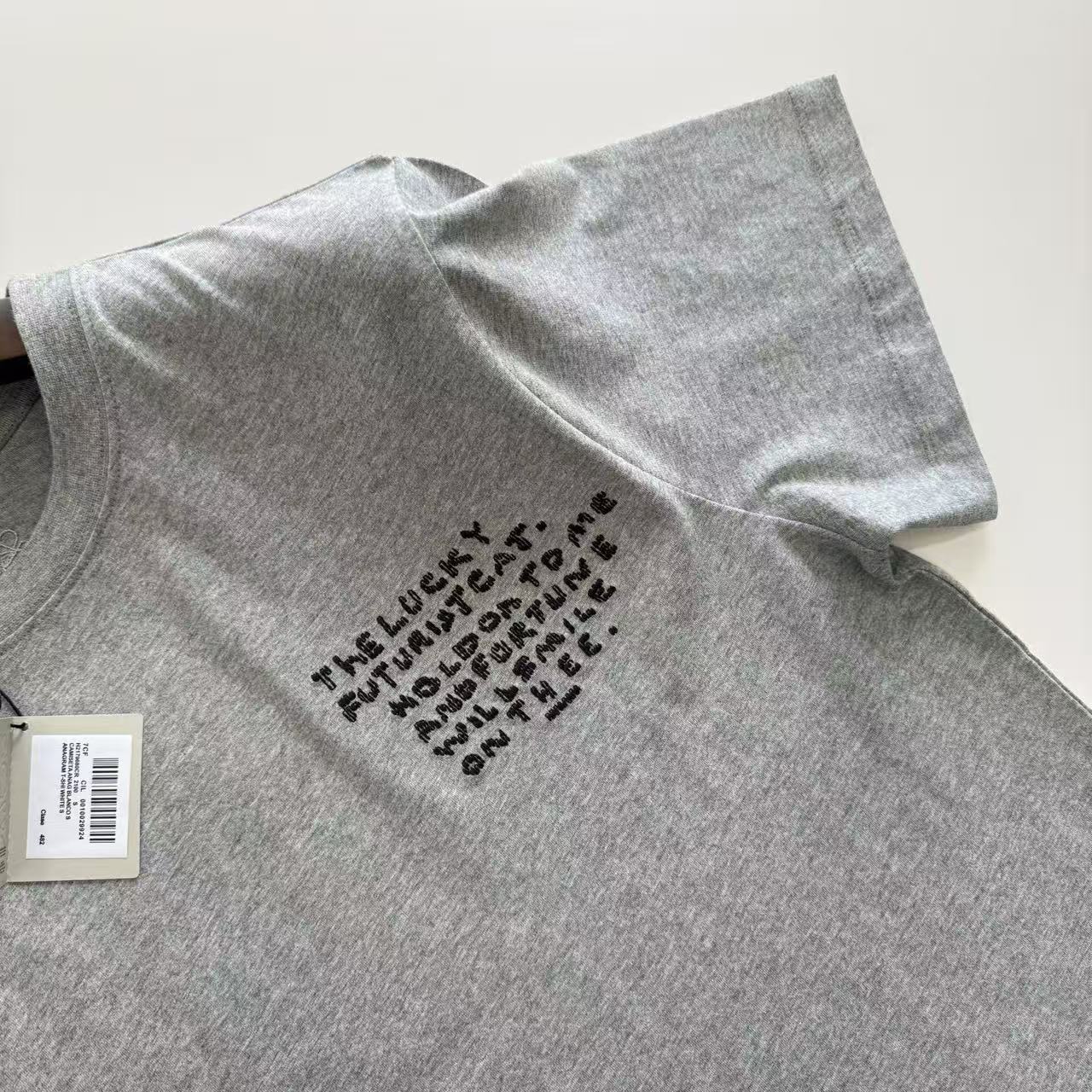 Lucky Cat 米粒線條刺繡: 貓咪圖案是這件 T 恤的靈魂。它採用特製極細繡線與高密度針法,核心技術是超細線跡精密排列,每公分需達到 12-15 針才能形成飽滿線條。最特別的是,邊緣呈現出「手工感的微波動效果」,讓貓咪圖案栩栩如生,充滿藝術筆觸。