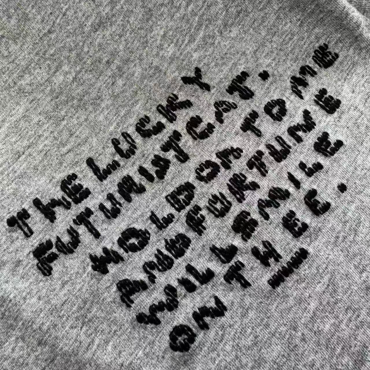 這件 T 恤將兩項高難度刺繡工藝應用在不同圖案上,讓視覺層次感極佳: