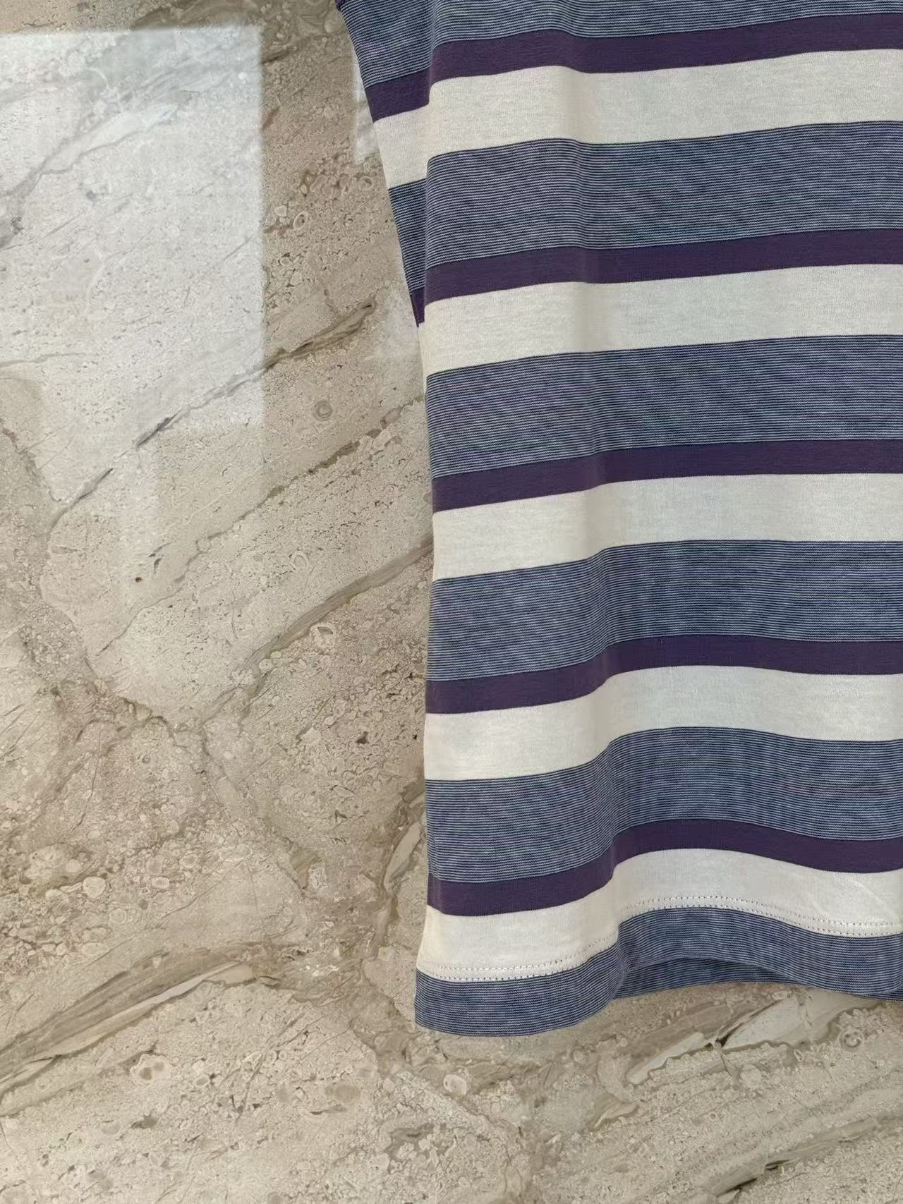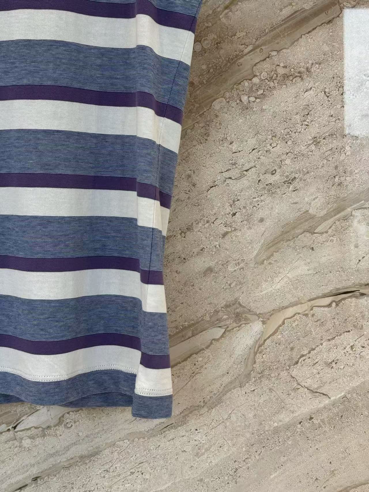 莫蘭迪紫藍白撞色設計: 以細膩的條紋比例配置,創造出溫潤且具層次感的色彩律動,襯托膚色更顯白皙。