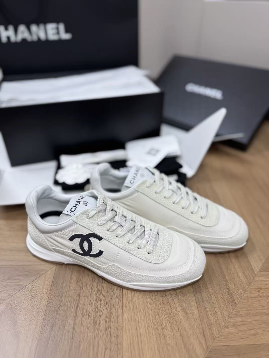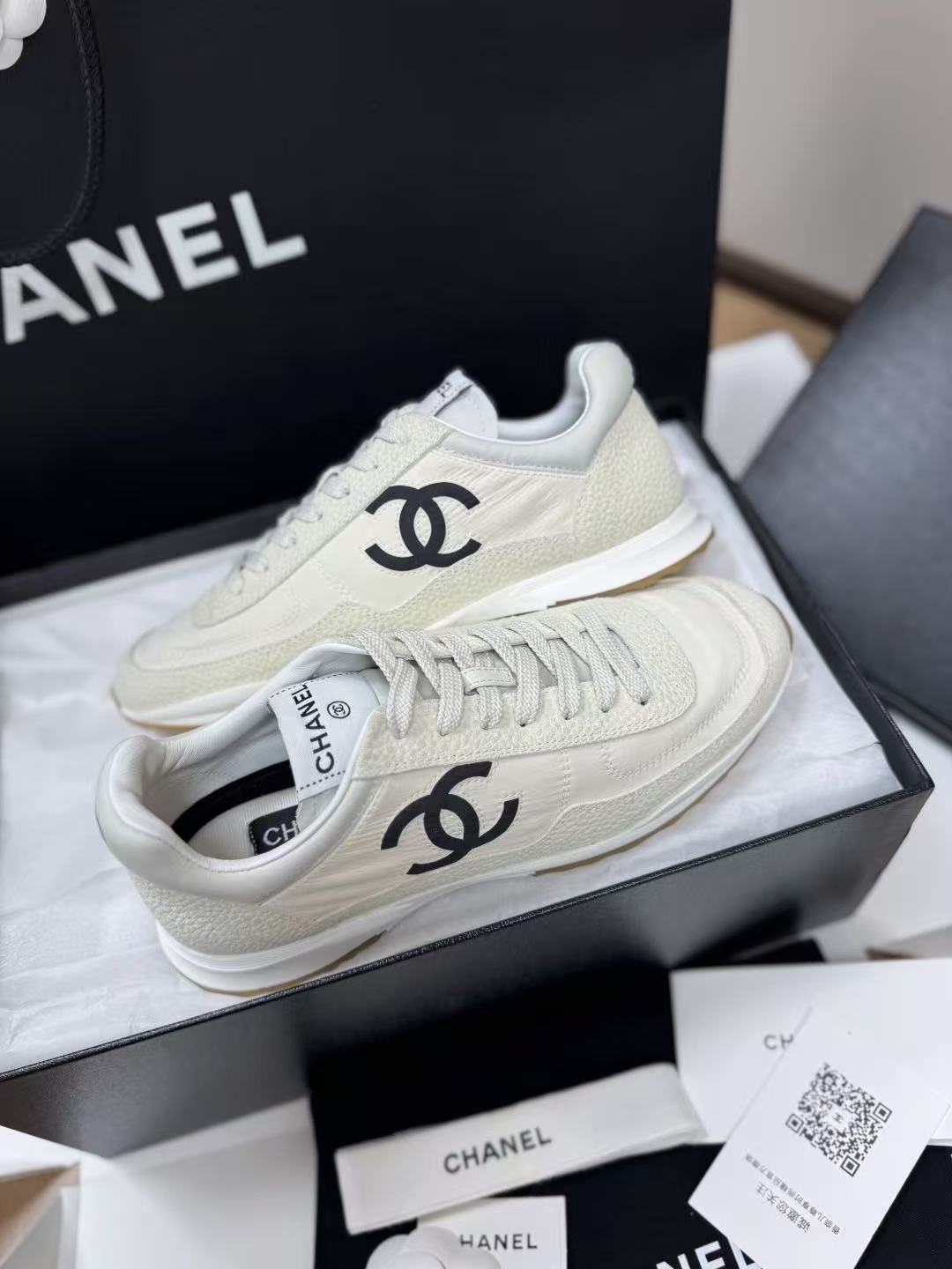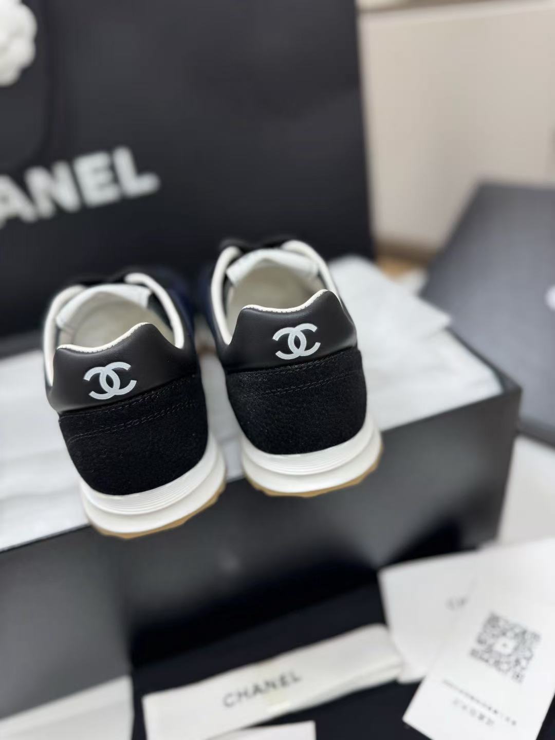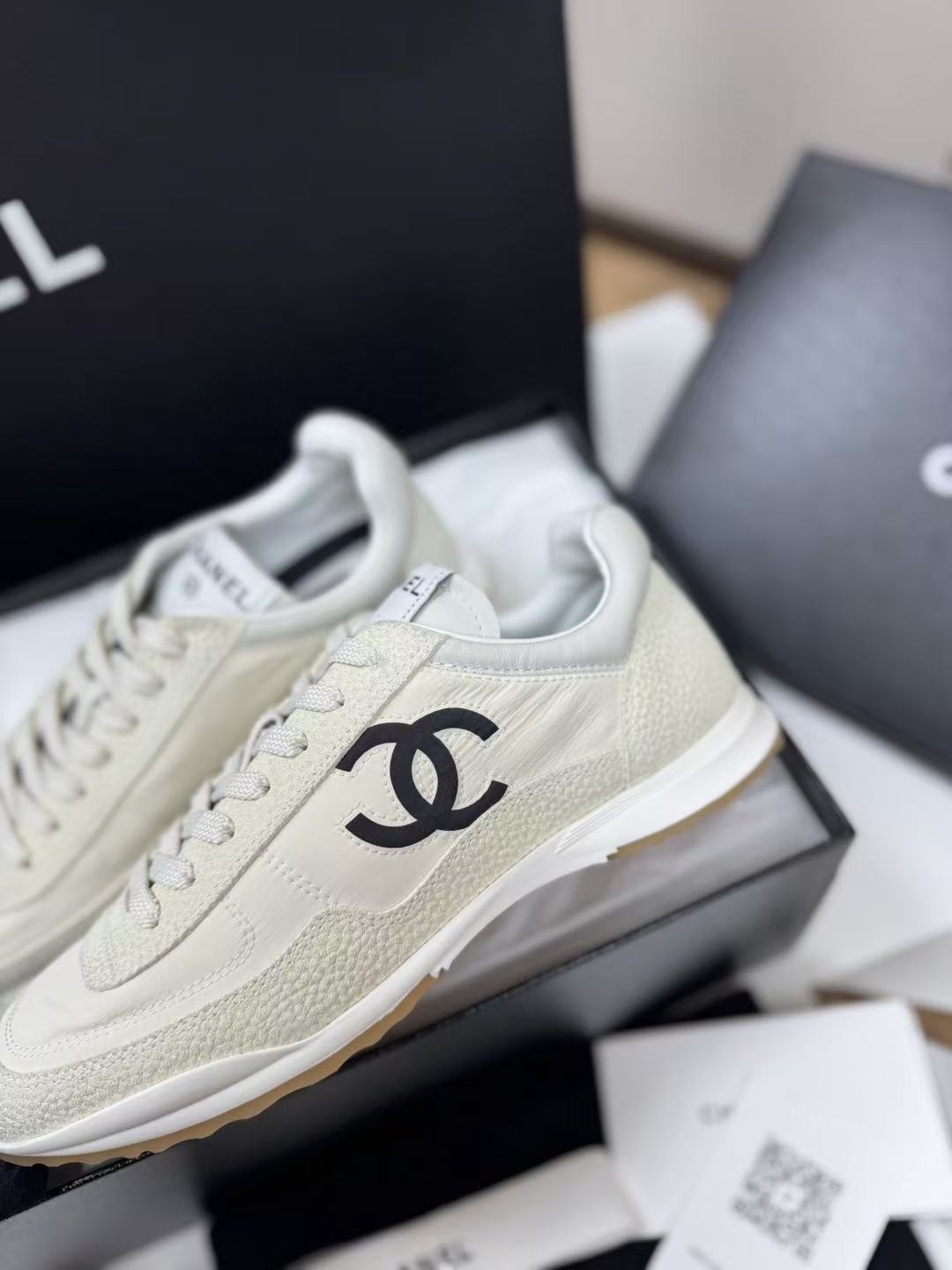 設計核心聚焦於鞋側那枚辨識度極高的經典 雙 C Logo,低調嵌入整體的黑白層次中,散發出一種不經意的法式高級感。這不僅是一雙休閒鞋,更是將運動機能與精品工藝推向平衡的年度力作。