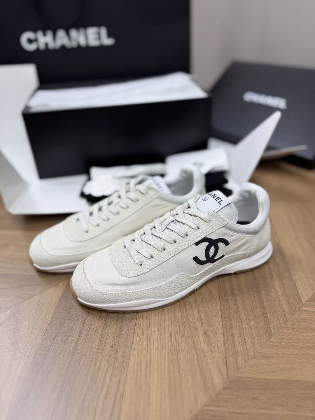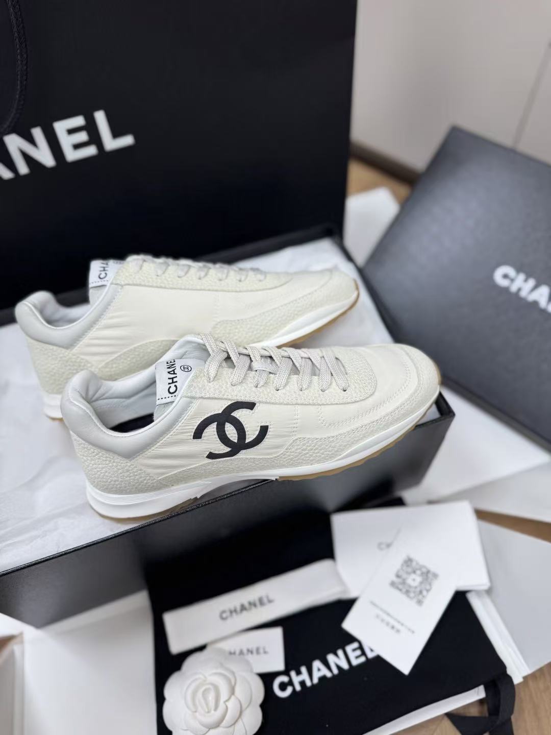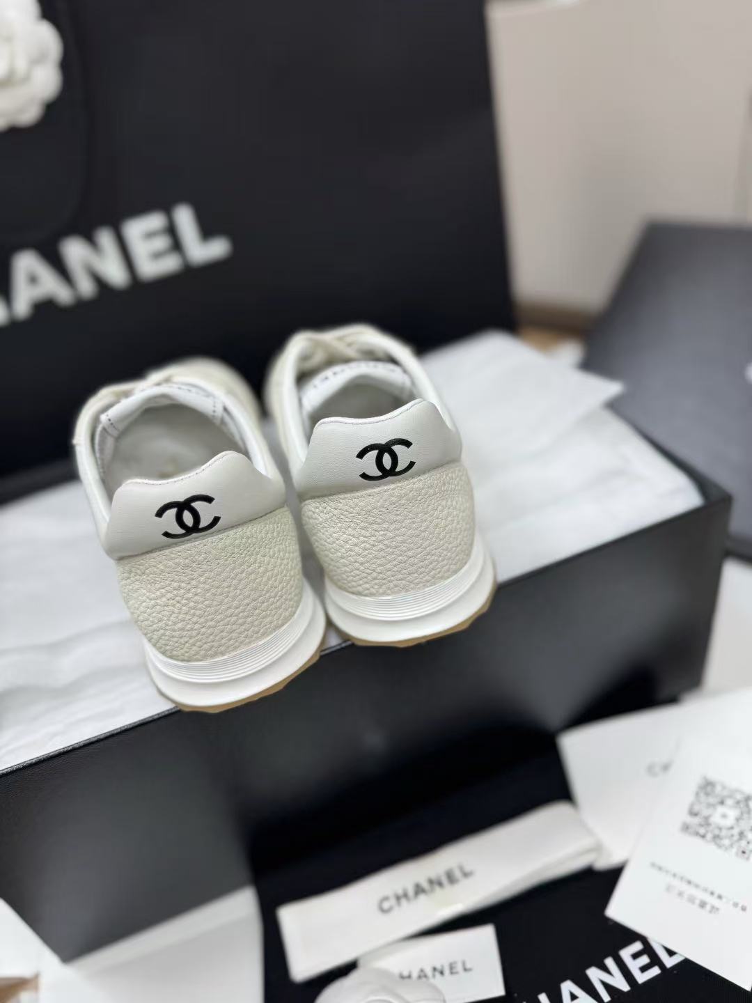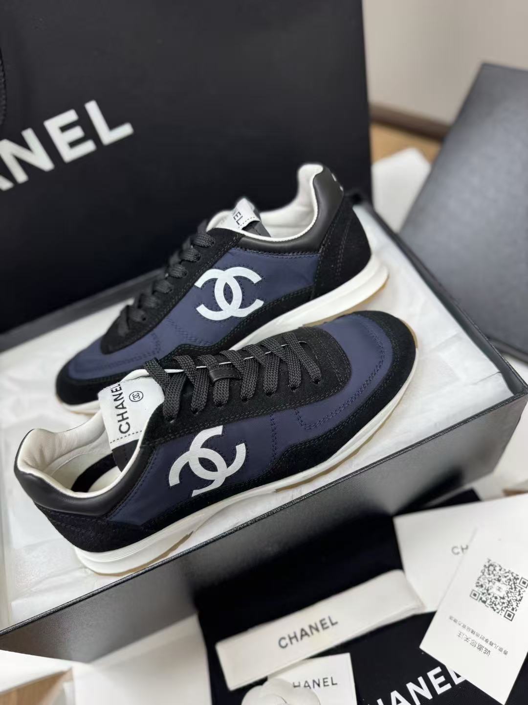 設計核心聚焦於鞋側那枚辨識度極高的經典 雙 C Logo,低調嵌入整體的黑白層次中,散發出一種不經意的法式高級感。這不僅是一雙休閒鞋,更是將運動機能與精品工藝推向平衡的年度力作。