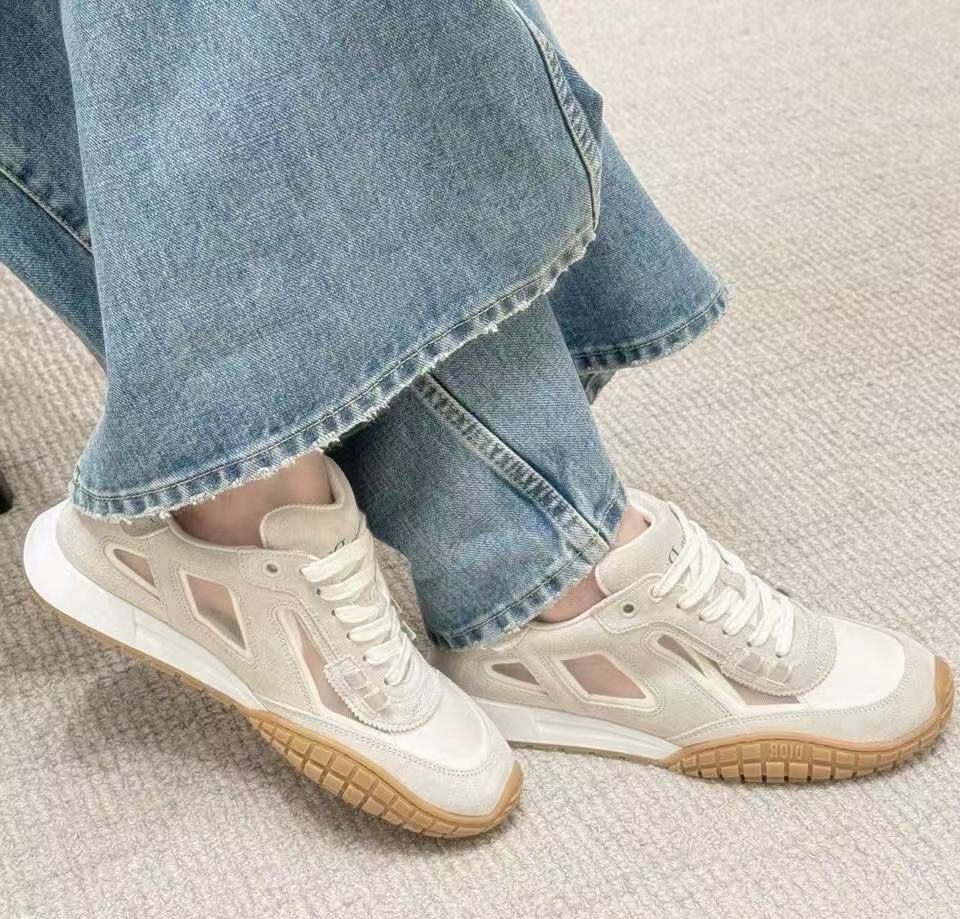 設計師大膽運用透明網眼織物打造鞋面側邊,營造出若隱若現的透視效果,打破了傳統運動鞋的封閉感,賦予雙足前衛且輕盈的視覺語彙。