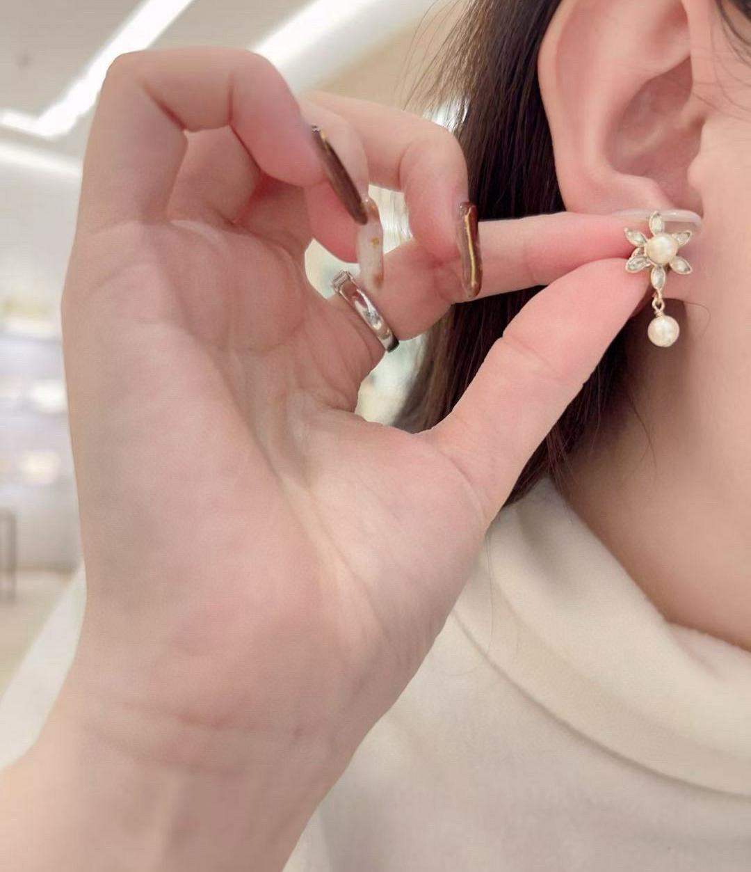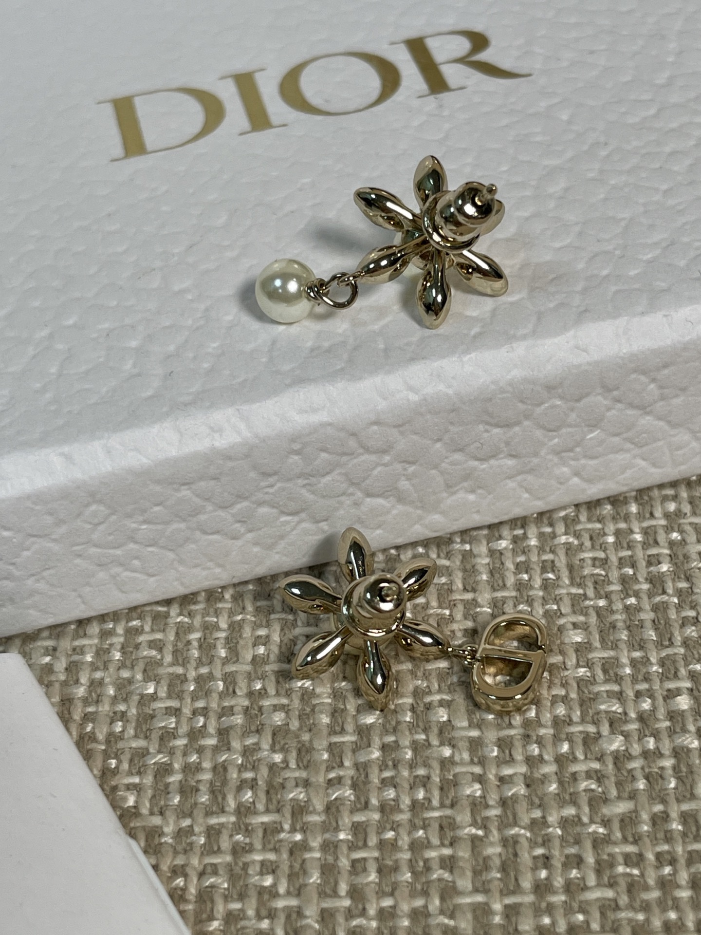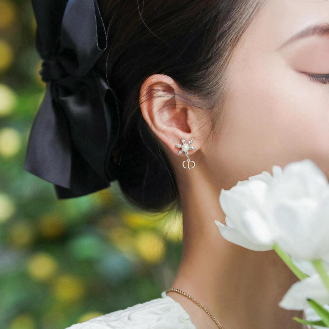 設計:不對稱雙耳設計,一邊為CD字樣搭配珍珠,另一邊為花朵+小吊珠