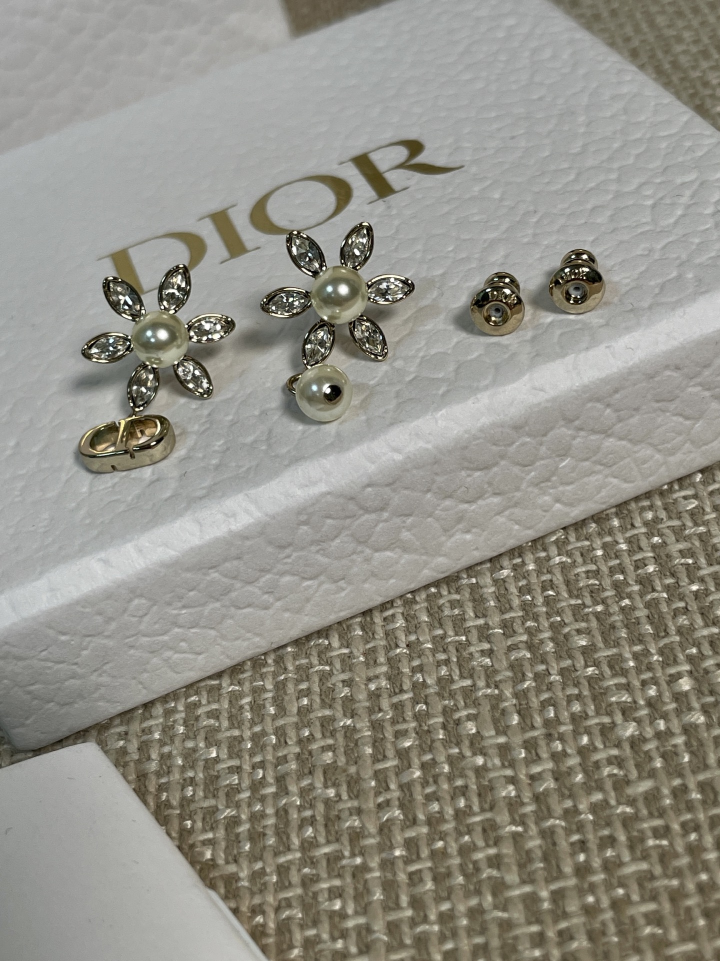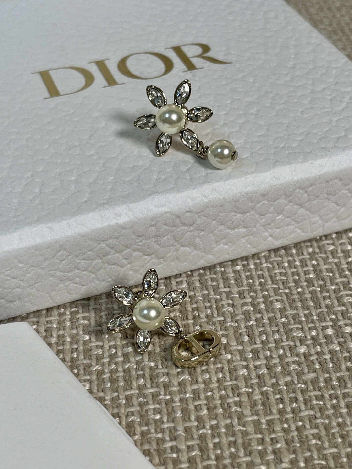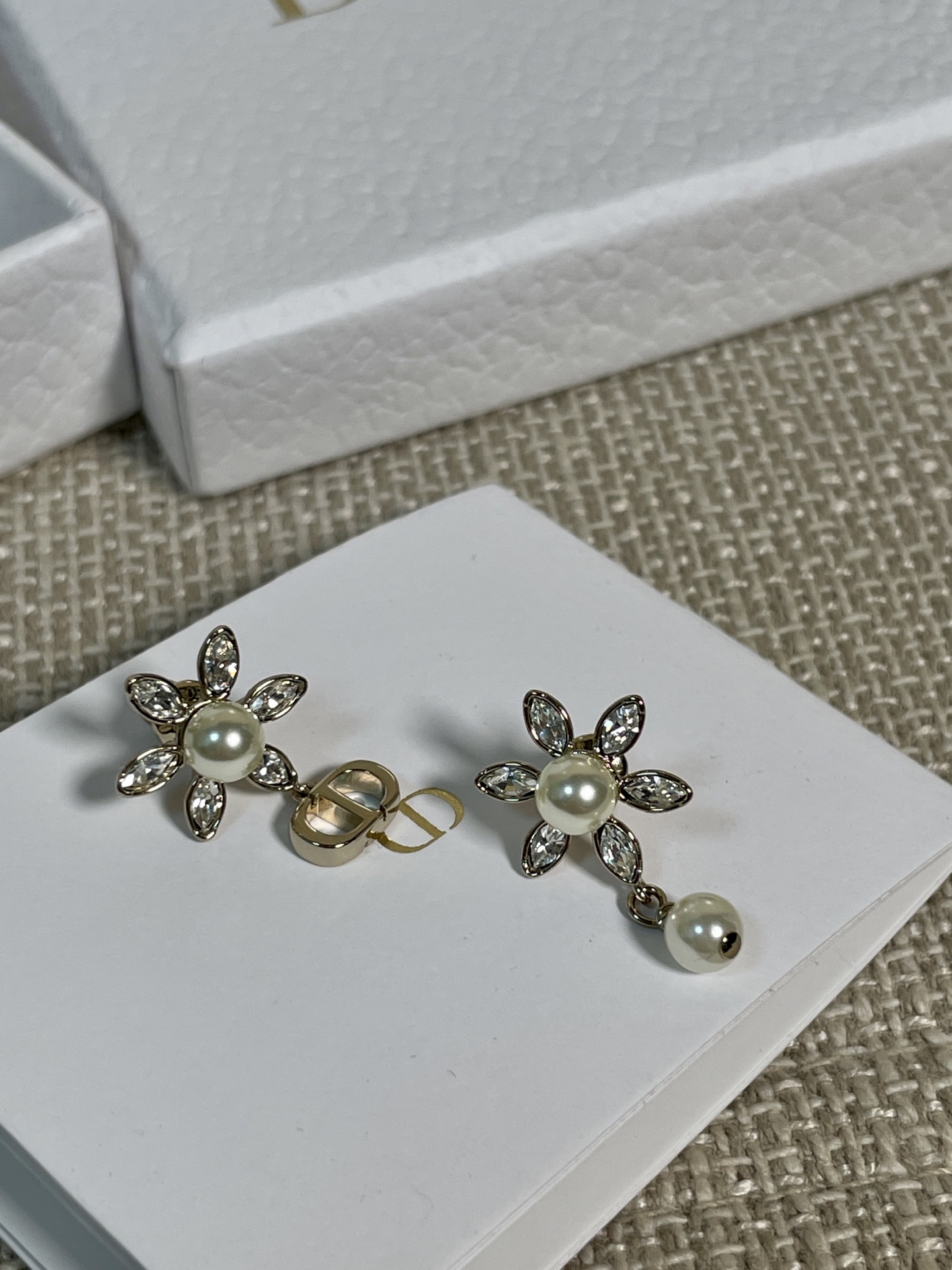 設計:不對稱雙耳設計,一邊為CD字樣搭配珍珠,另一邊為花朵+小吊珠