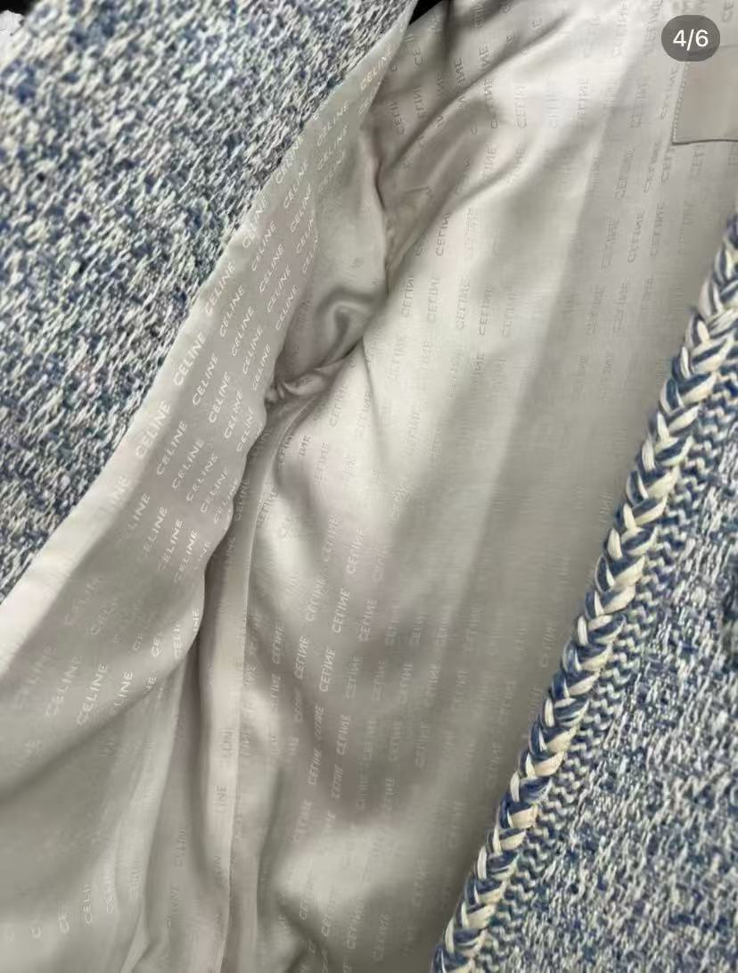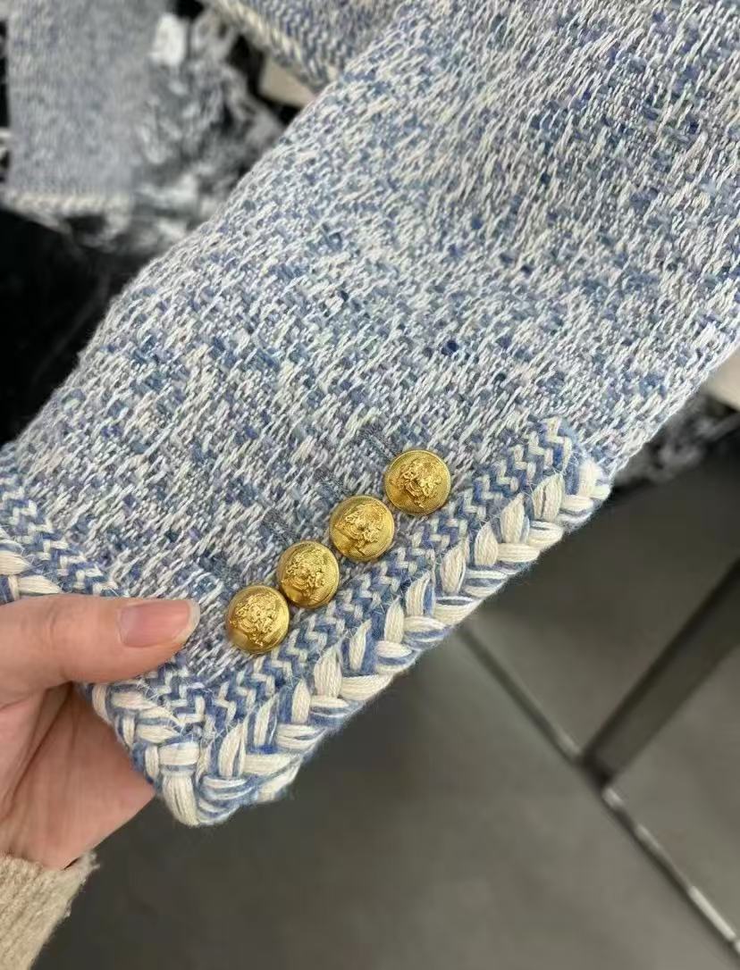 粗花呢質感: 採用藍色粗花呢材料,這種經典材質讓外套充滿了復古的高級感與優雅的貴氣。