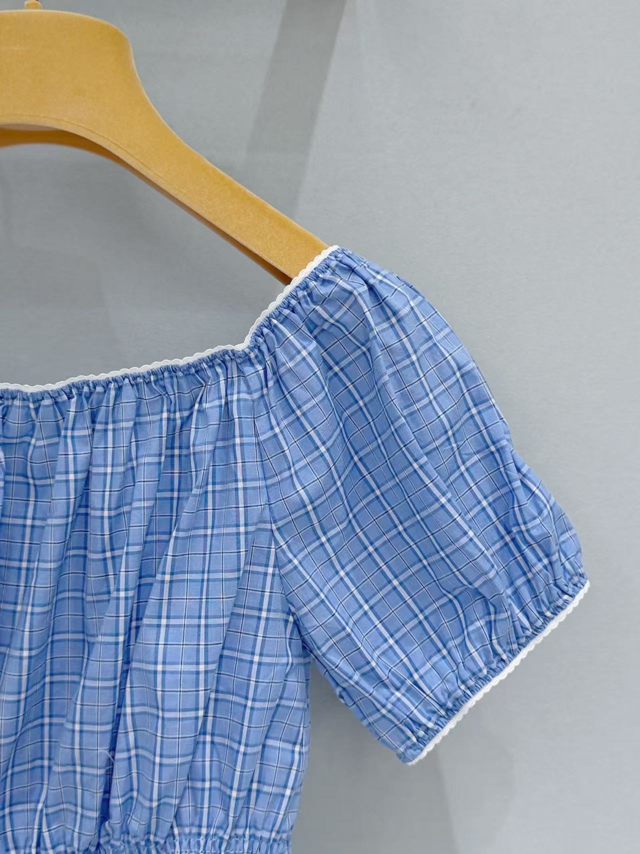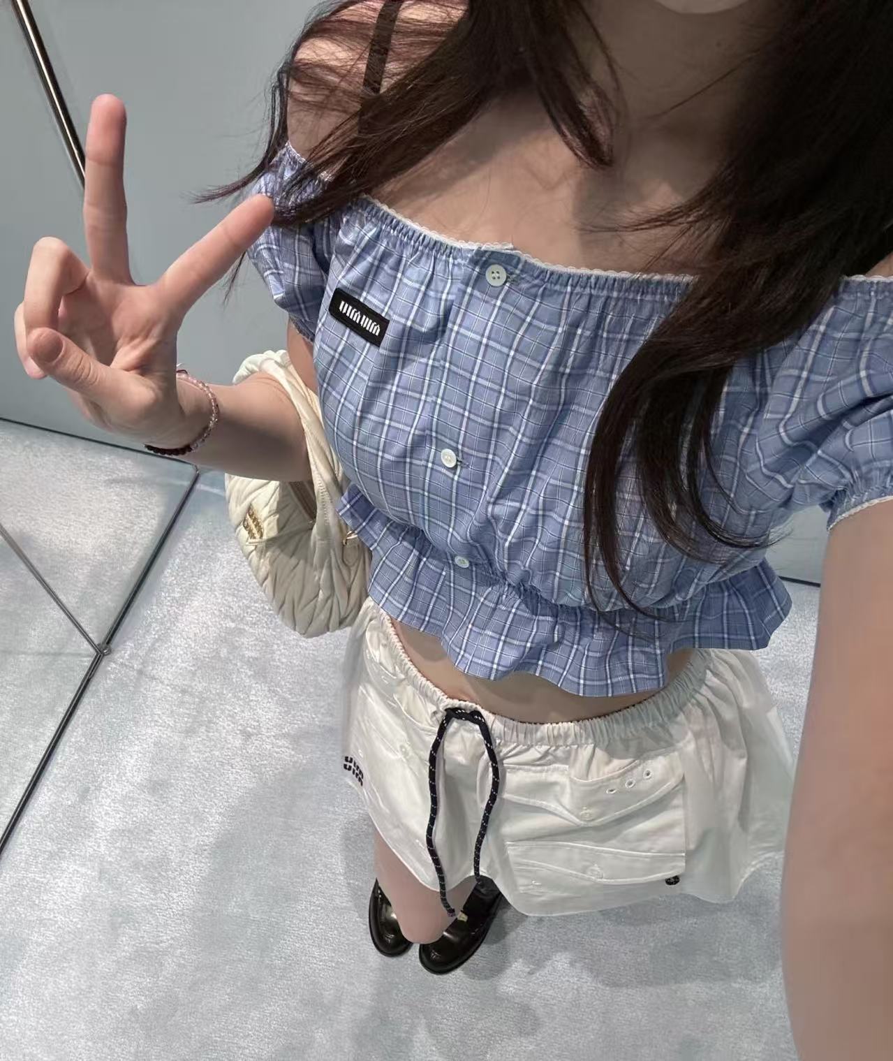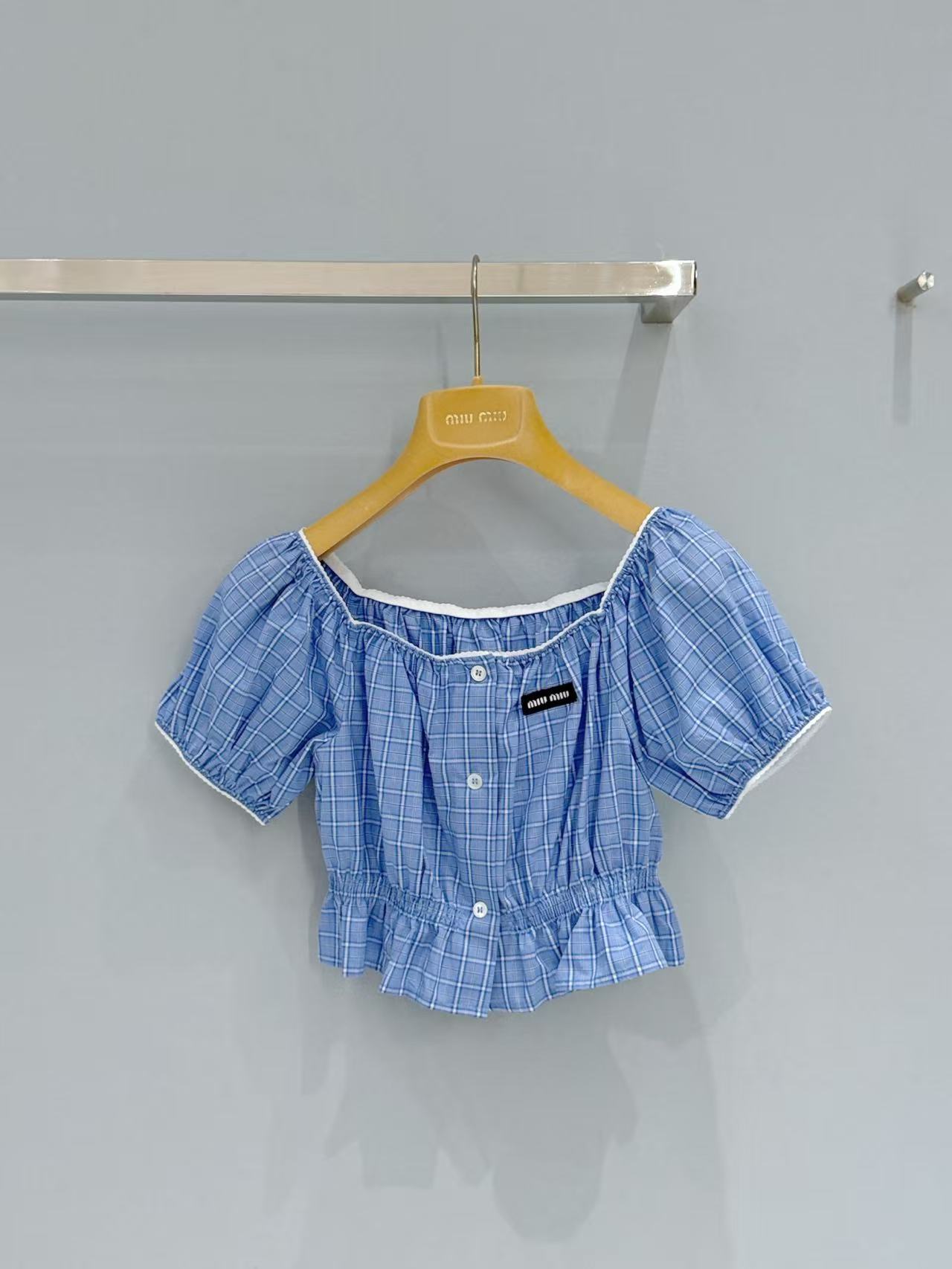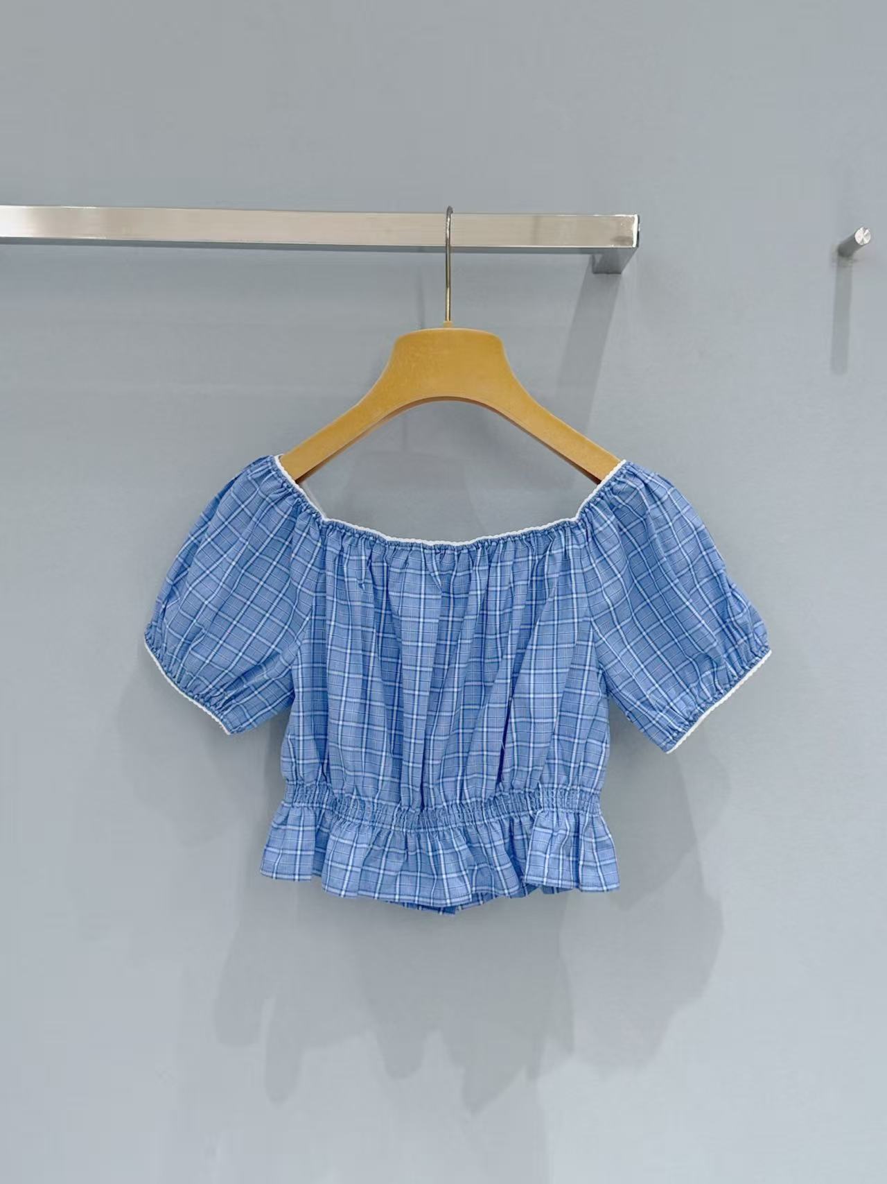 2026早春 Miu家 藍白格紋收腰泡泡袖上衣