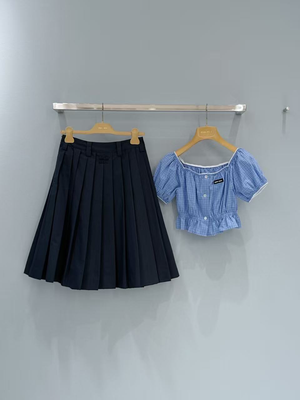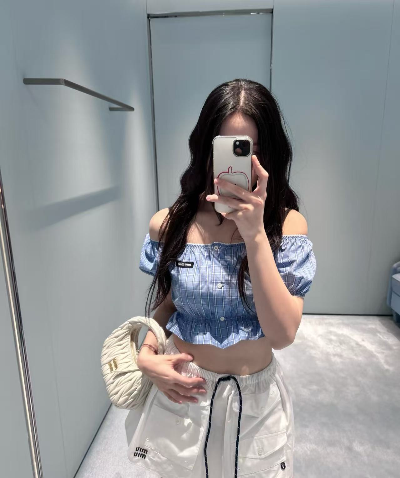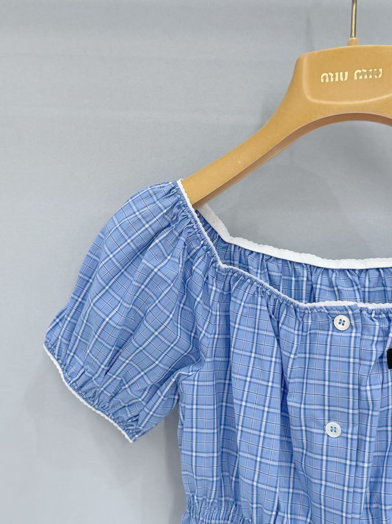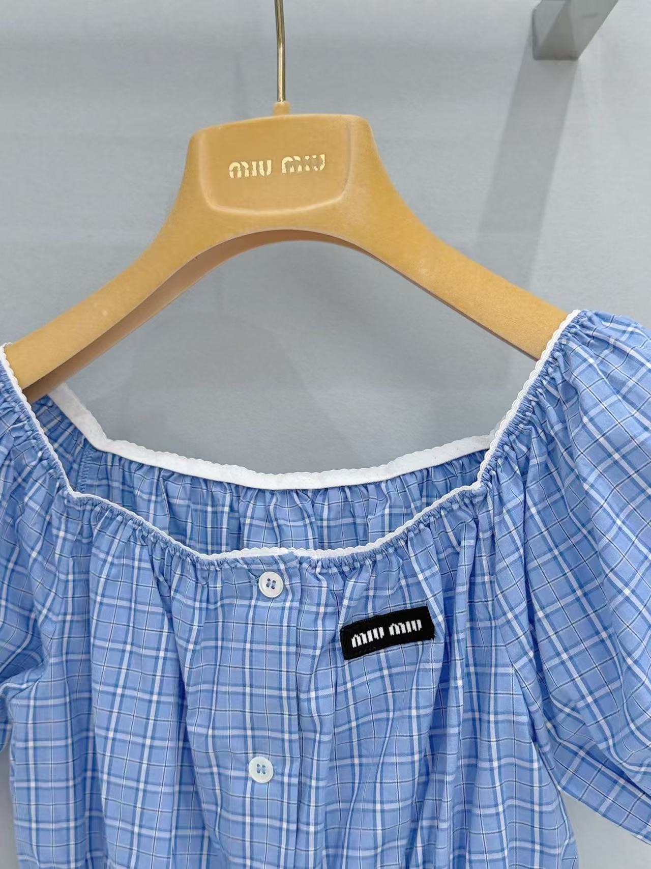 2026早春 Miu家 藍白格紋收腰泡泡袖上衣