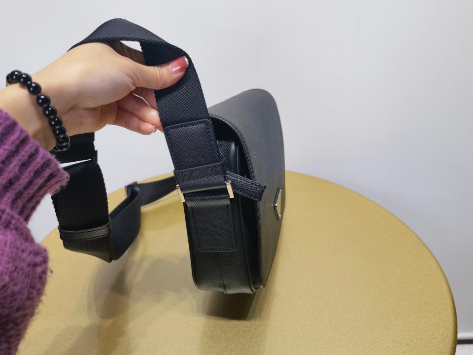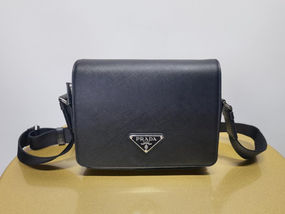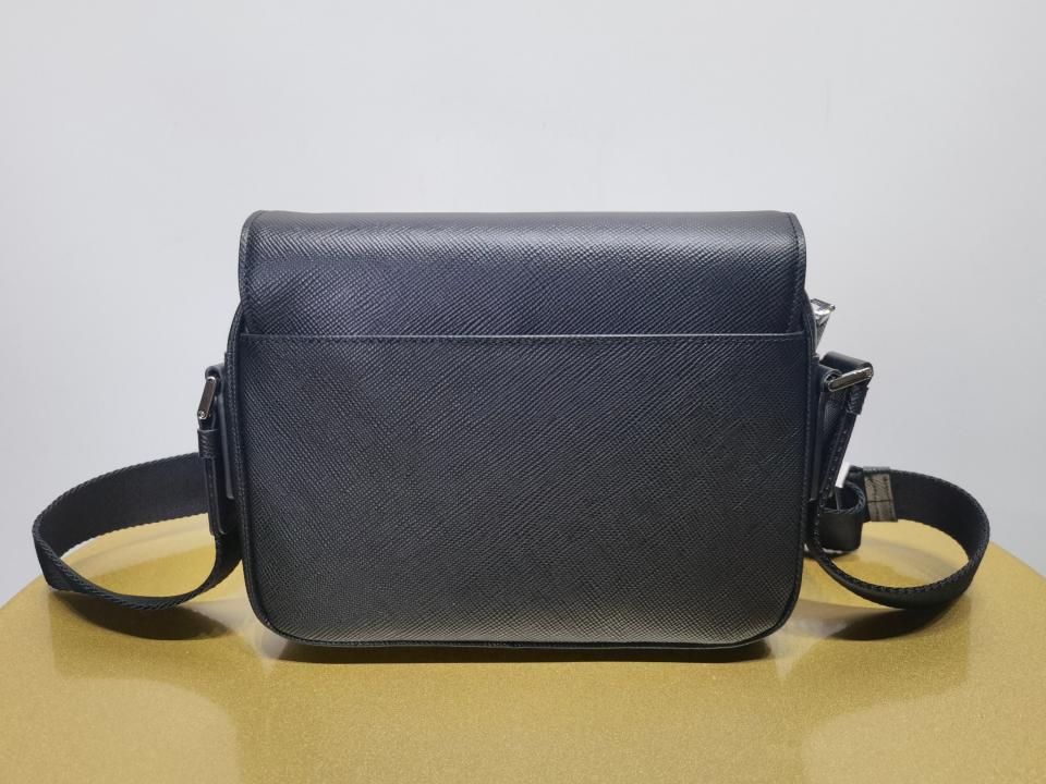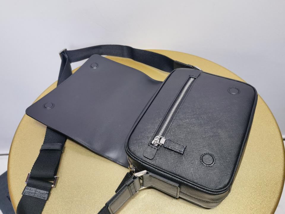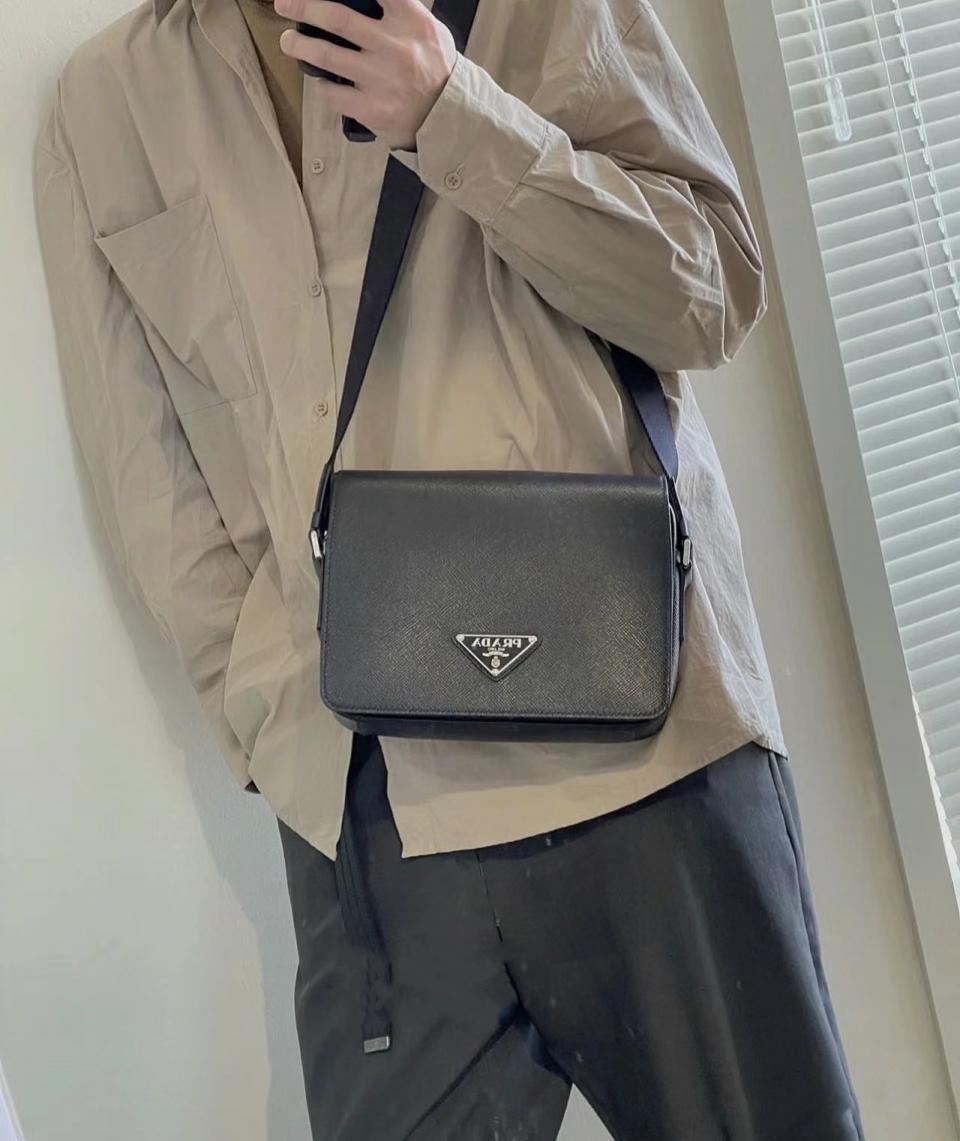 尺寸大小非常適合男士日常需求,不再煩惱包包太大,這款單肩包演繹精美的結構式廓形.並採用粗十字紋牛皮與羊皮的 搭配,正面三角形琺瑯徽標,內部徽標銘牌