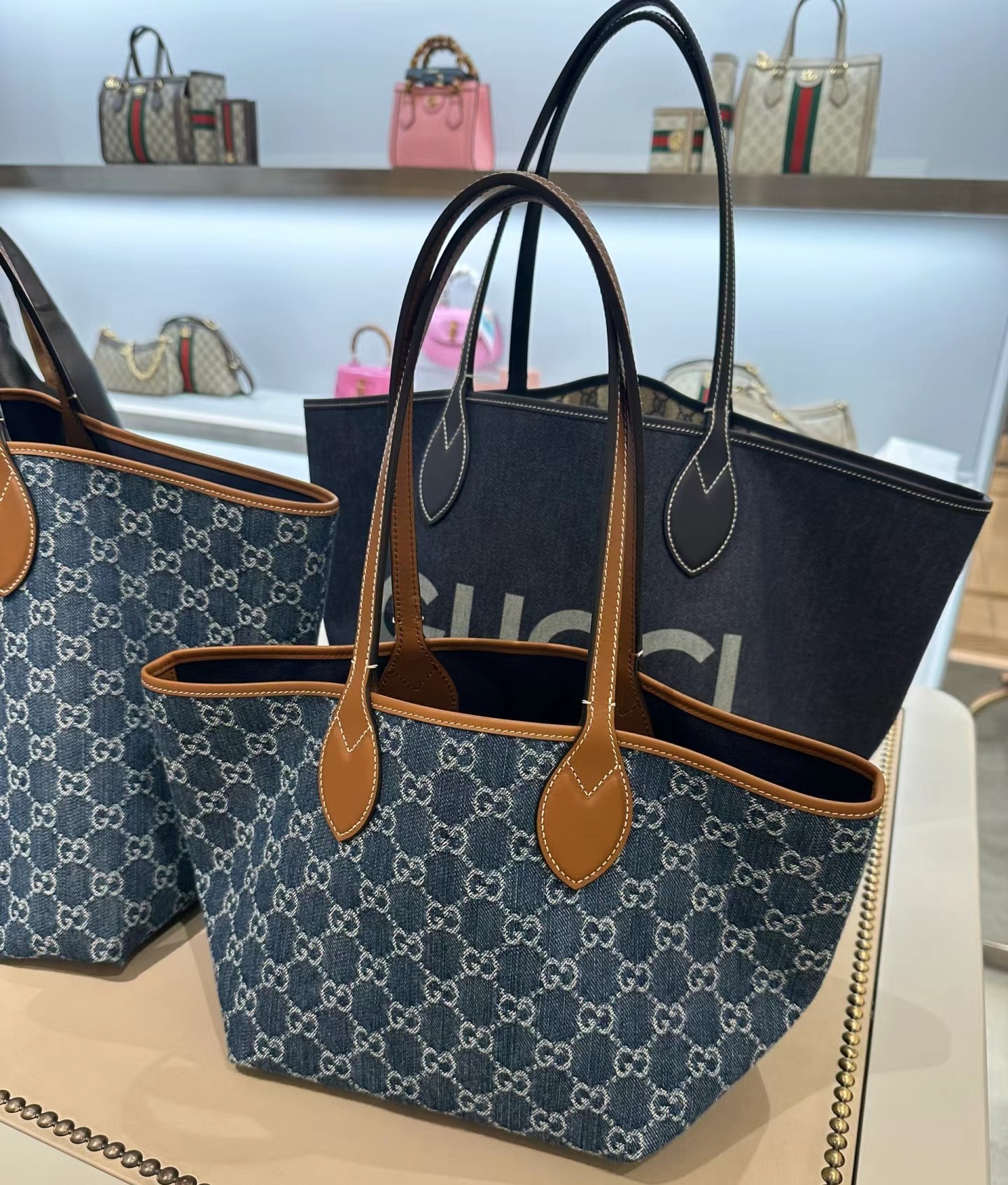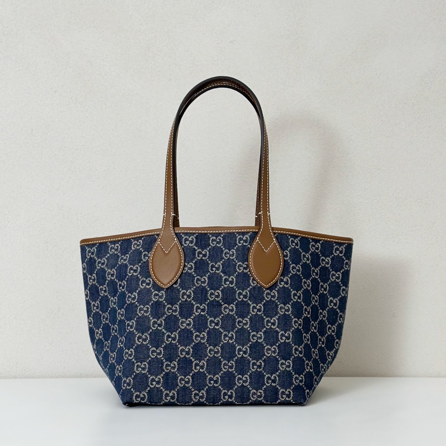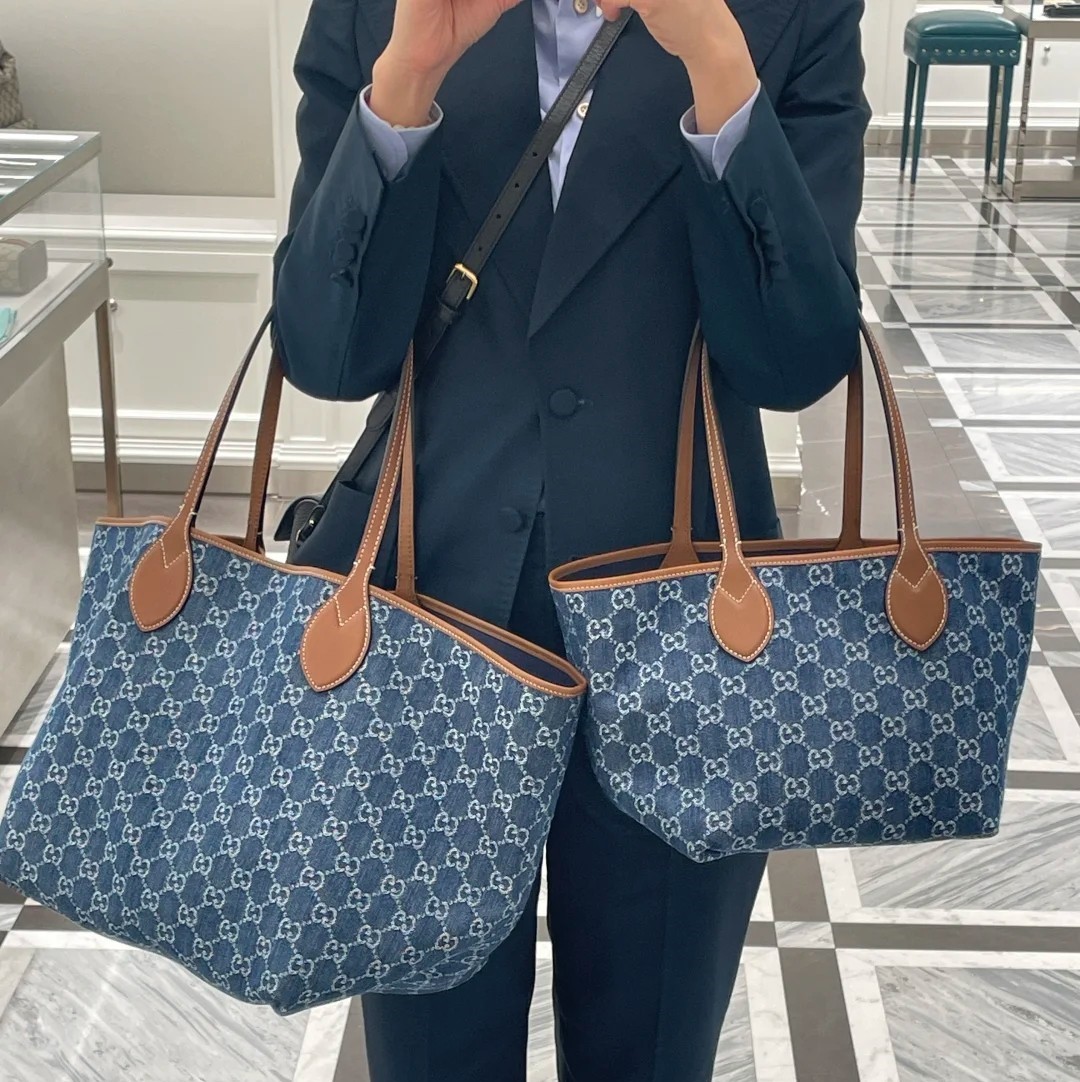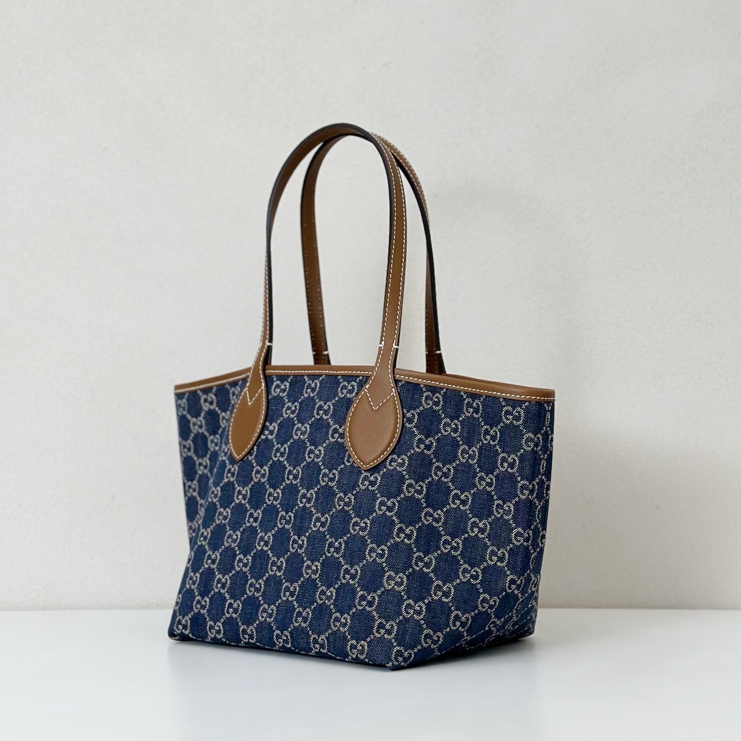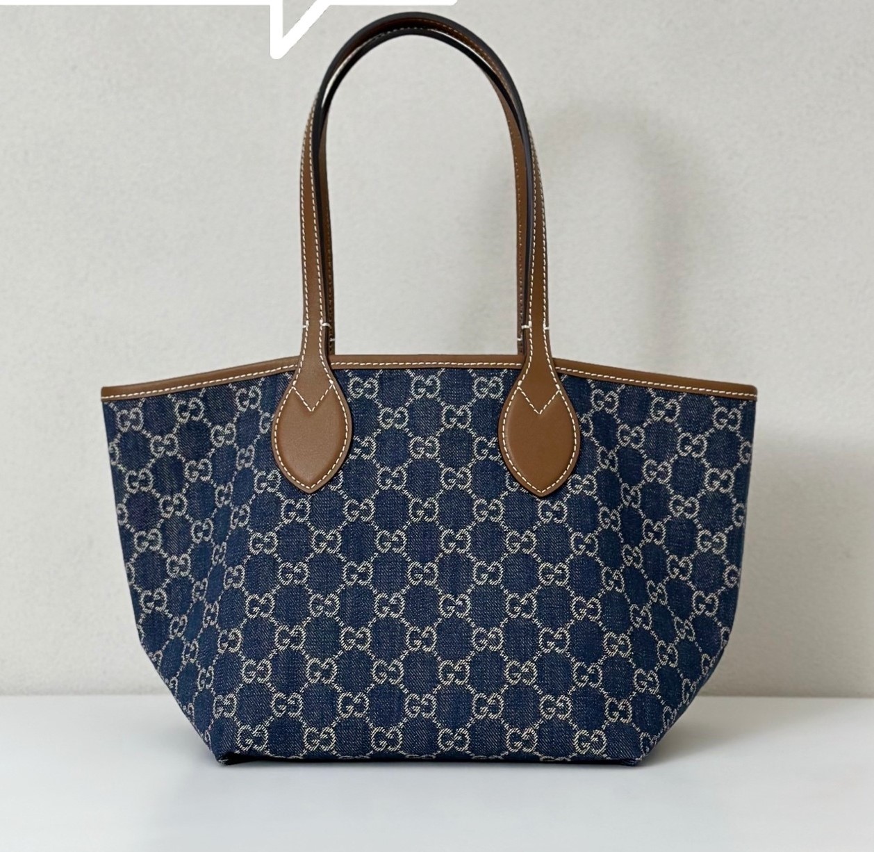 以經典藍色 GG 牛仔圖紋為基底,搭配棕色牛皮提把與飾邊,整體散發低調又帶點復古休閒的質感,無論日常出門、假日旅行還是約會逛街都能輕鬆駕馭。