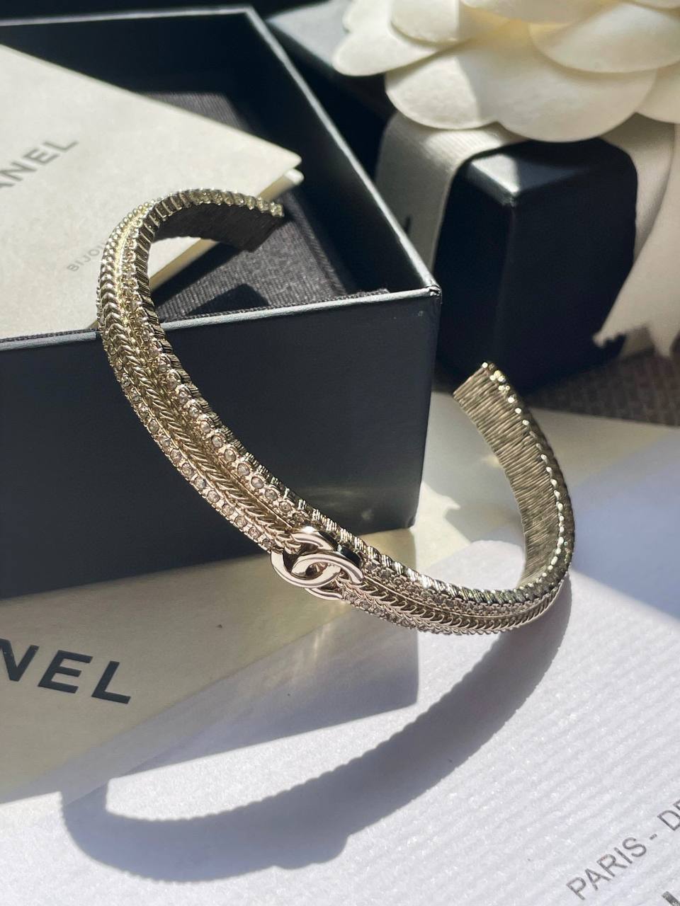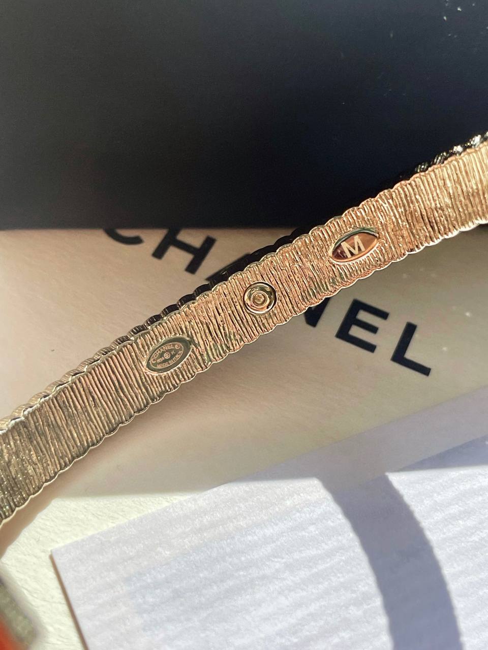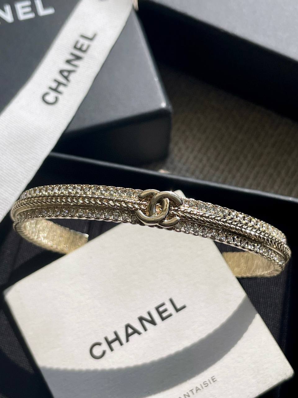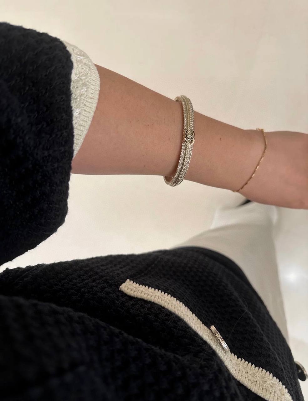 這一季的必入單品!簡約大方日常款,上邊顆顆施華洛世奇水晶,中間立體細膩的鏈條⛓️紋路+雙c logo設計!背面,側面純手工拉絲工藝,超級重工精緻❗️絕對是低調中帶著華麗麗的女神範,無法抵抗