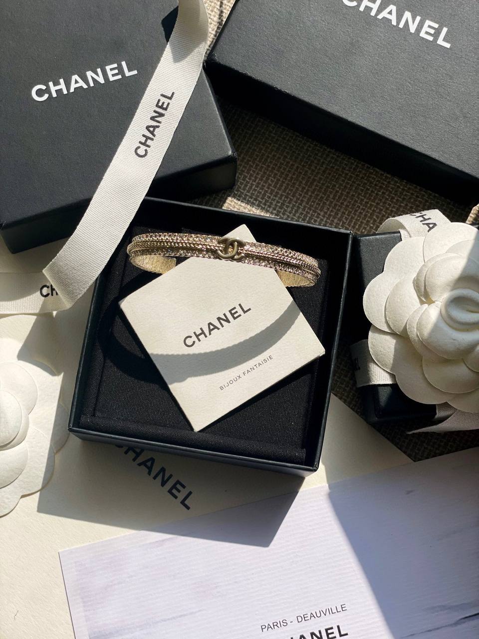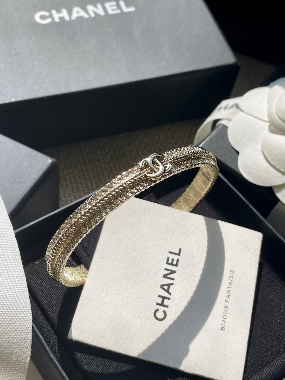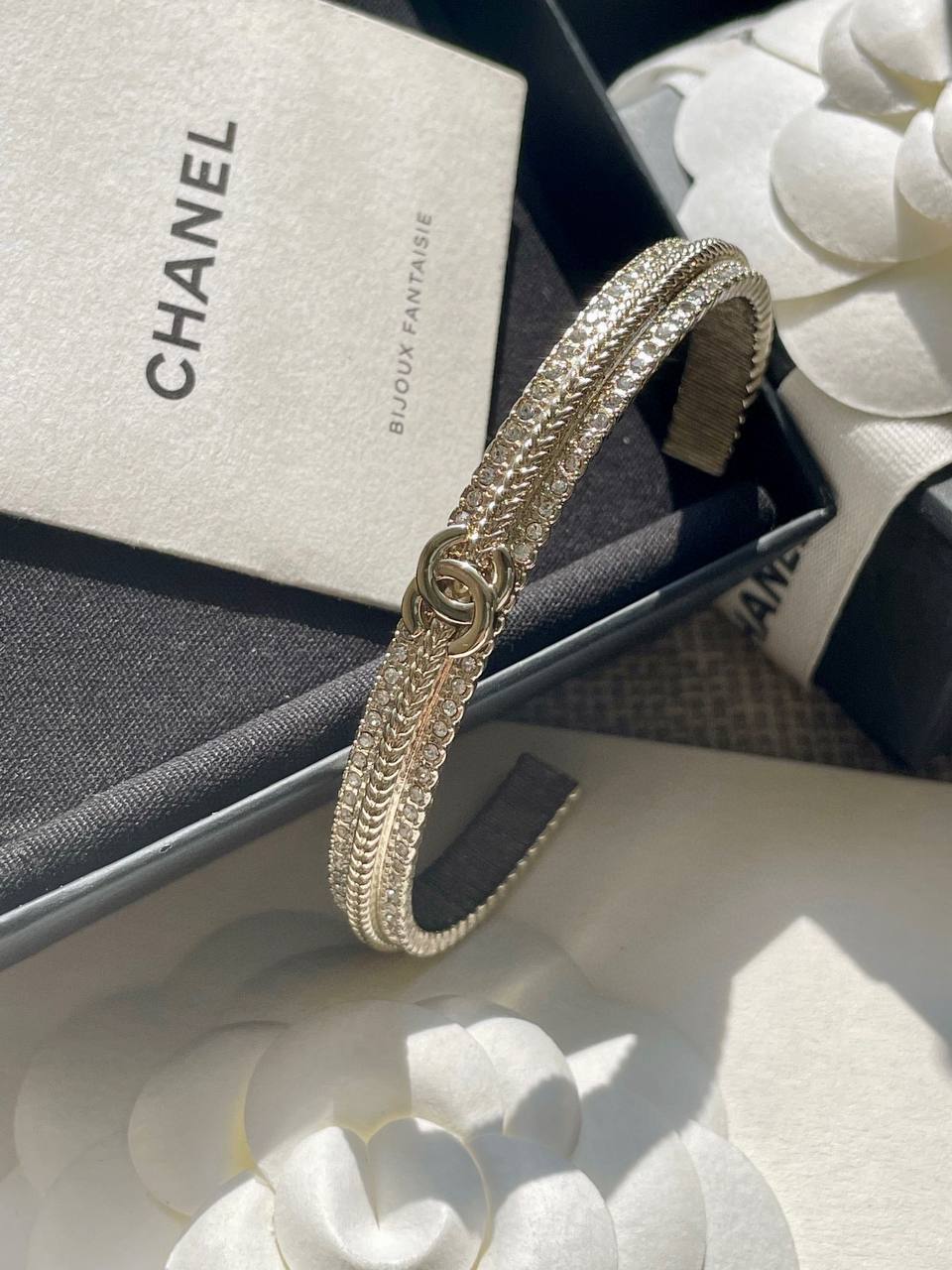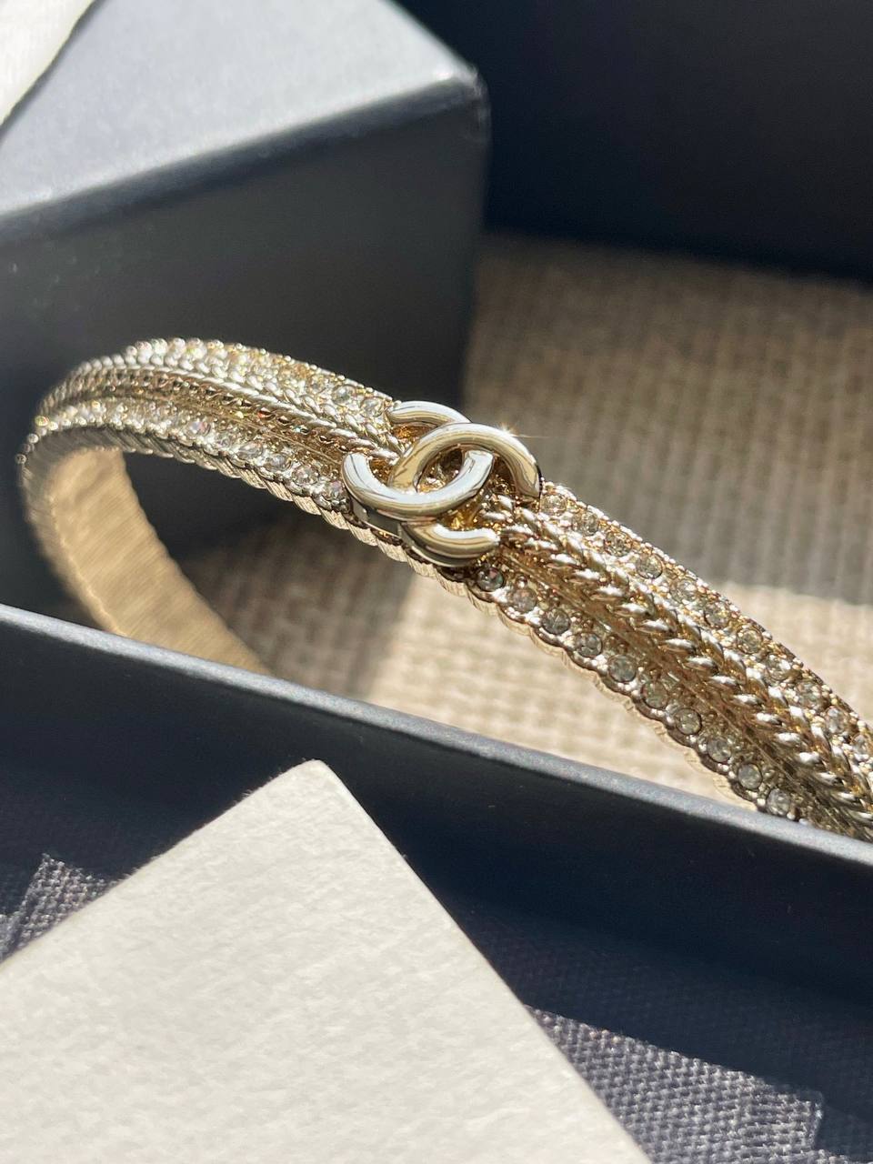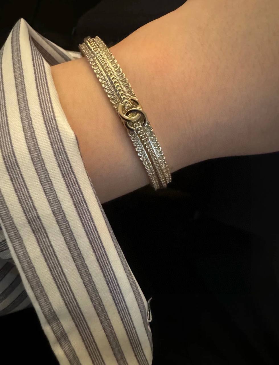 這一季的必入單品!簡約大方日常款,上邊顆顆施華洛世奇水晶,中間立體細膩的鏈條⛓️紋路+雙c logo設計!背面,側面純手工拉絲工藝,超級重工精緻❗️絕對是低調中帶著華麗麗的女神範,無法抵抗