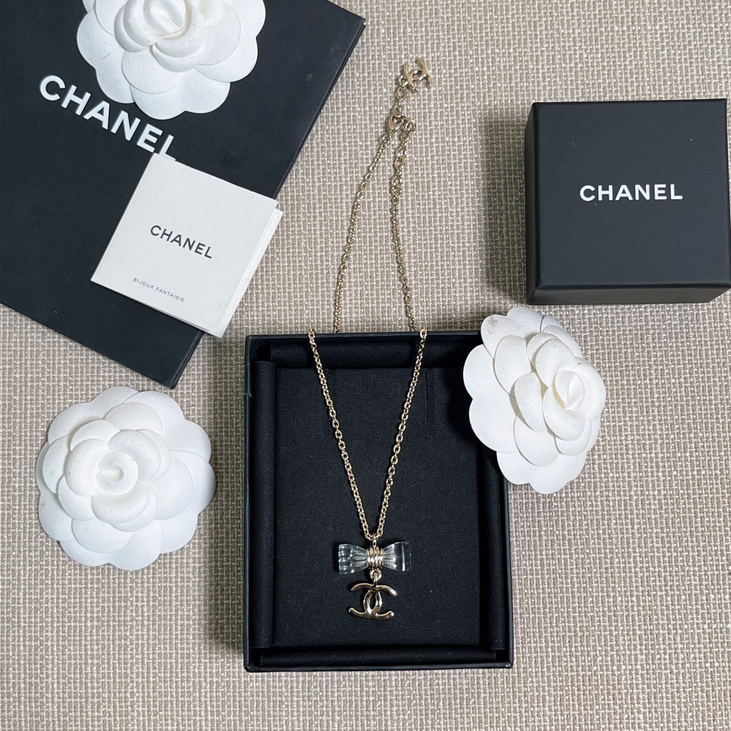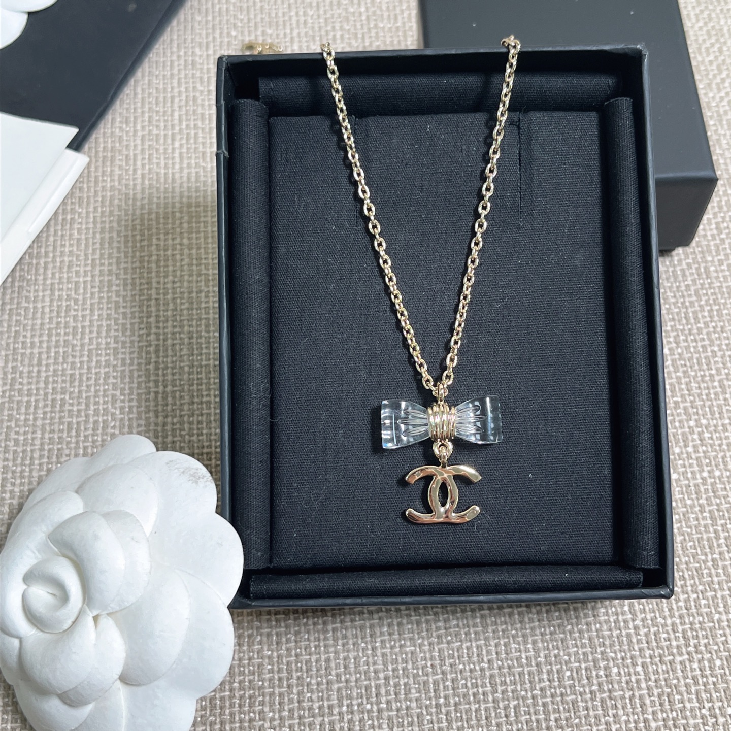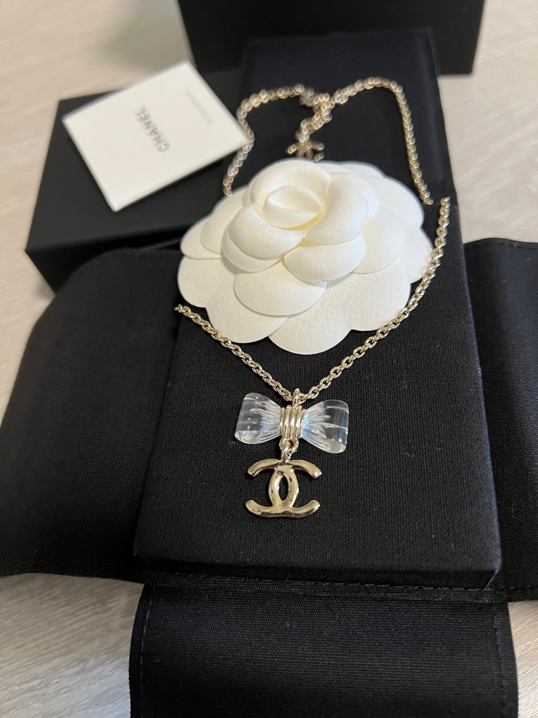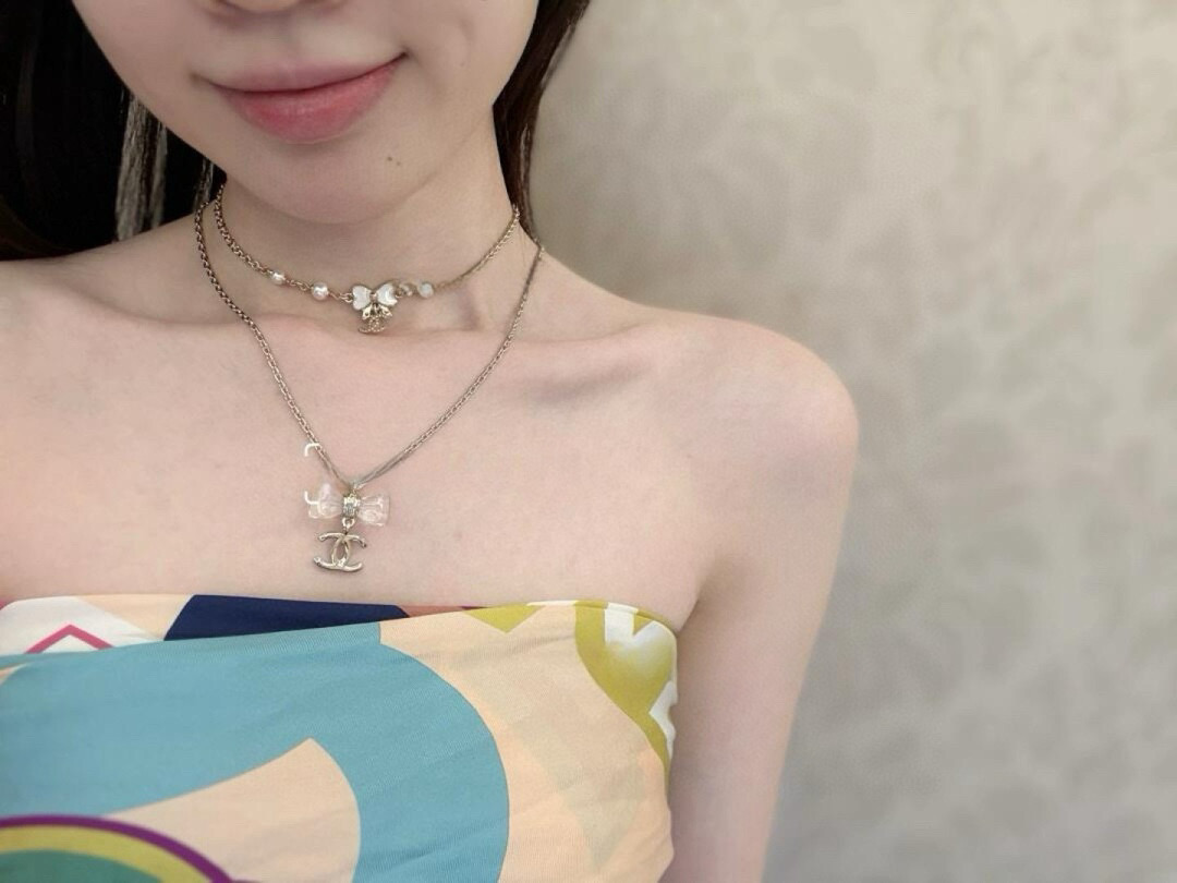 《尺寸規格》項鍊長度約38cm(另有延長鏈 6cm)蝴蝶結吊墜寬度約 2.5cm,雙C吊墜寬度約 1.6cm