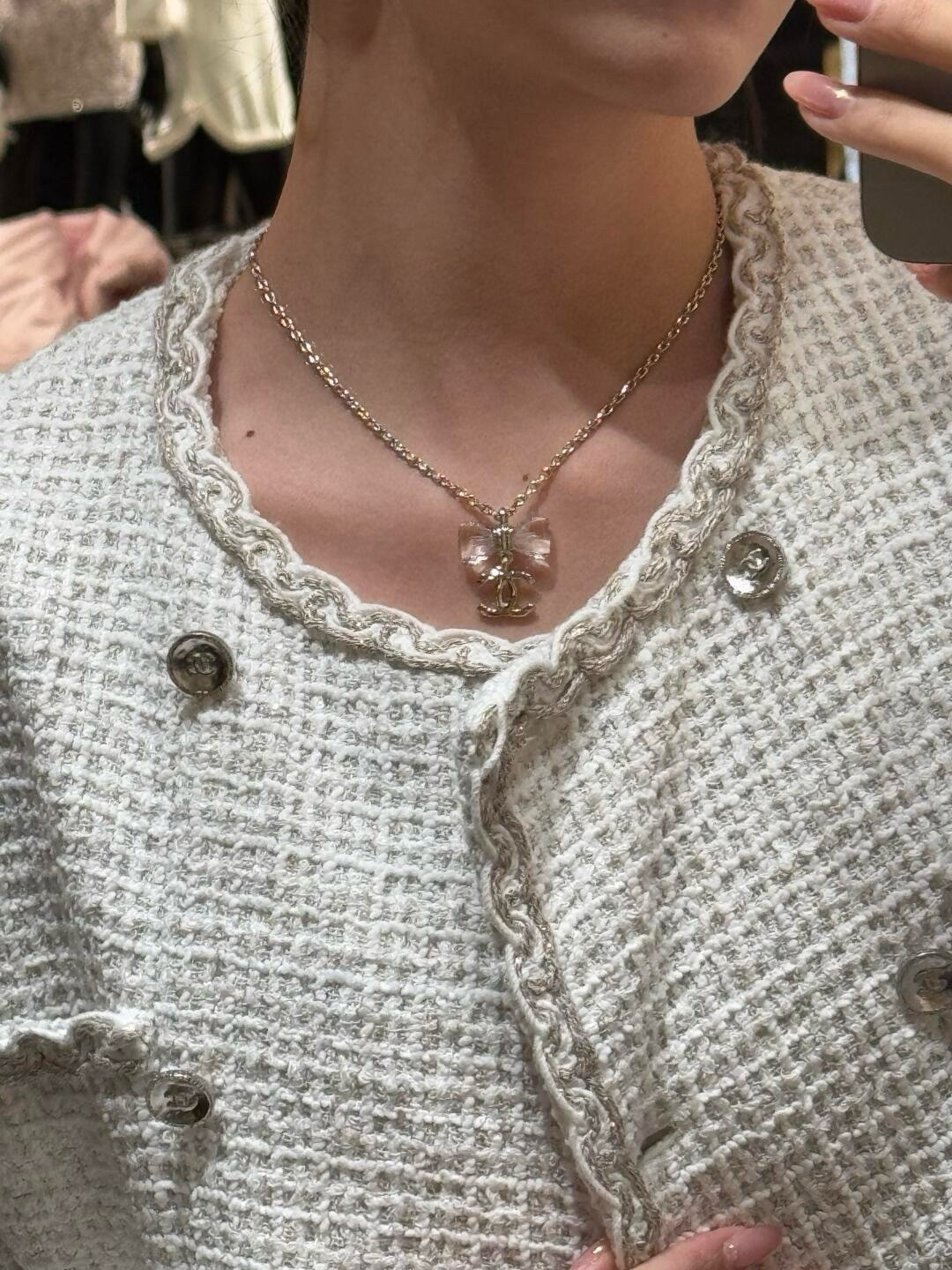 獨家定制亞克力蝴蝶結吊墜,經過弧度與凹槽細節的精密雕刻,營造出宛如水晶的夢幻光澤,低調卻吸睛!