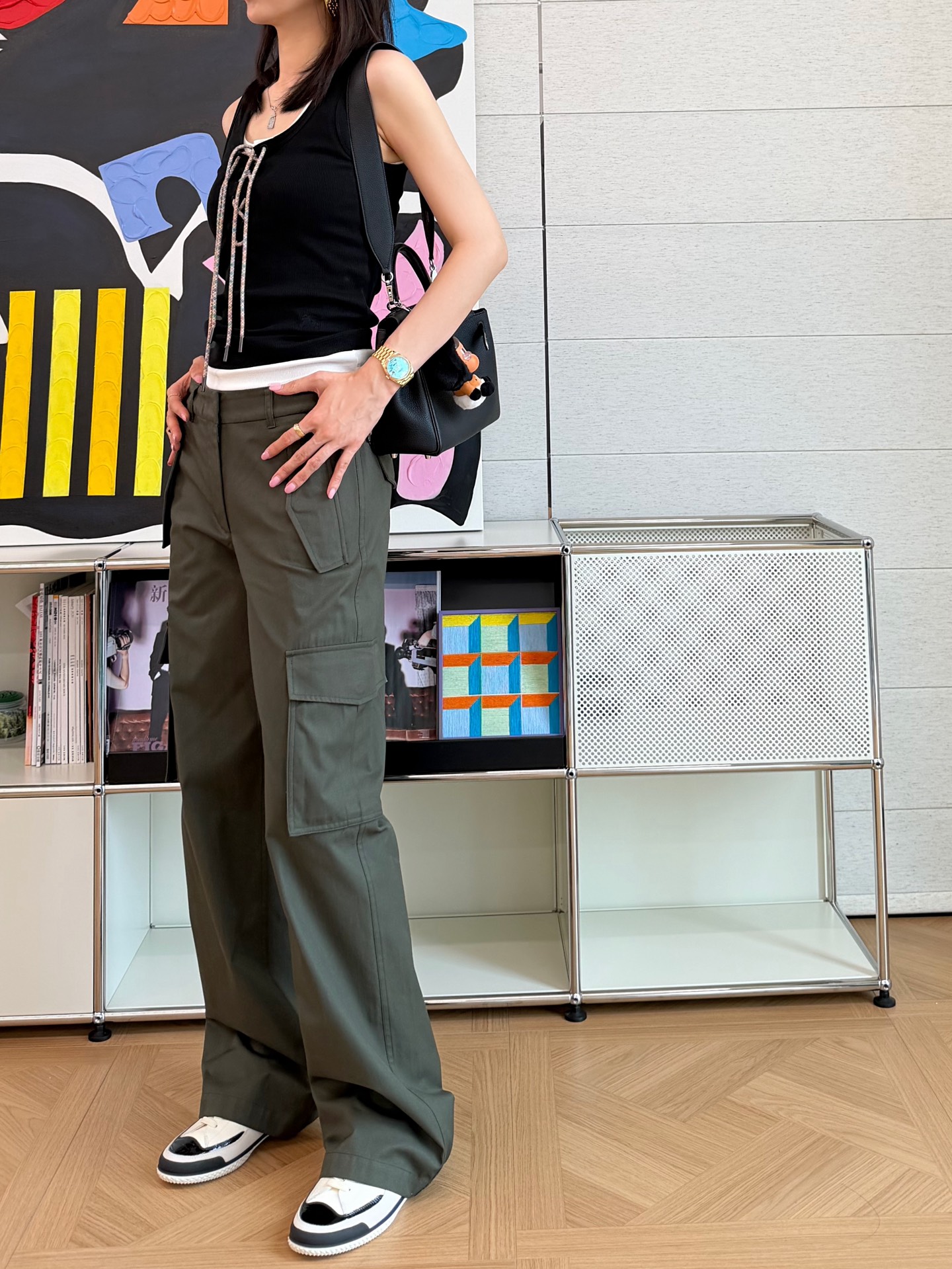 這款橄欖綠工裝寬褲可以說是今年春夏非常值得關注的一條單品。