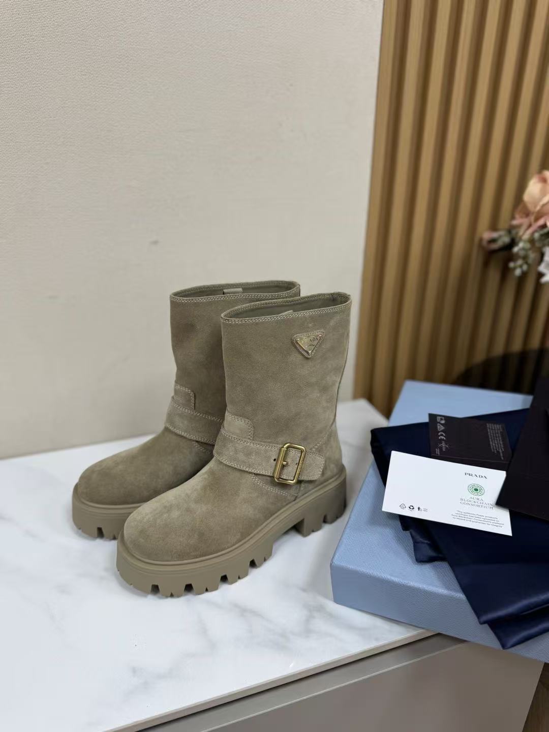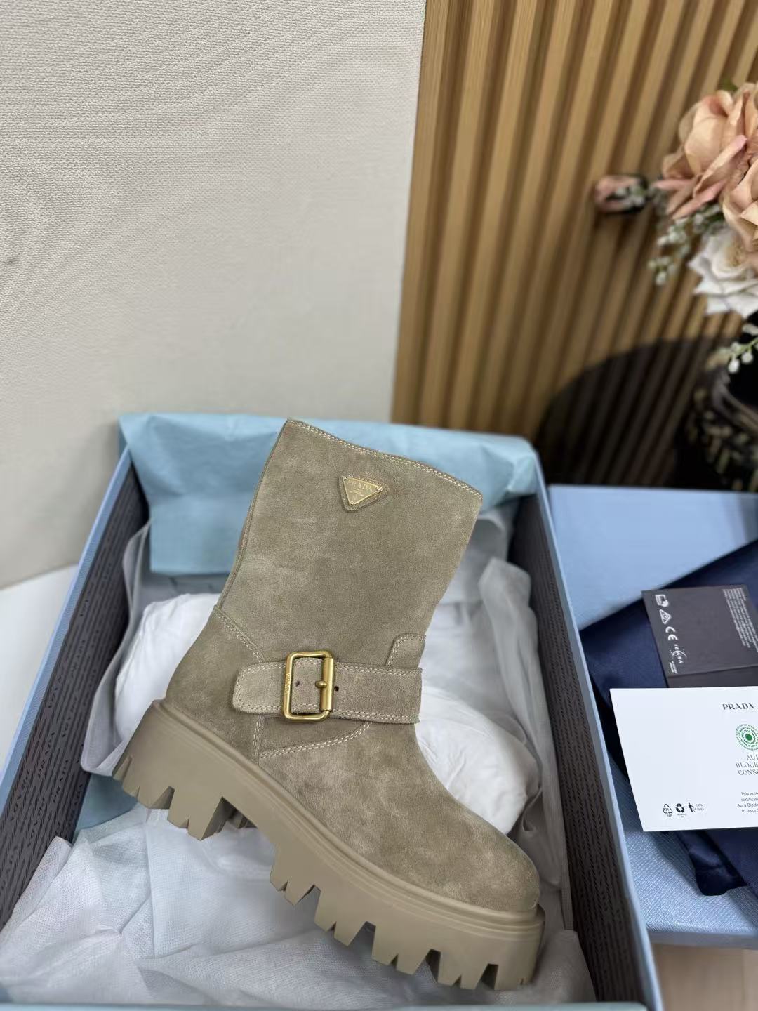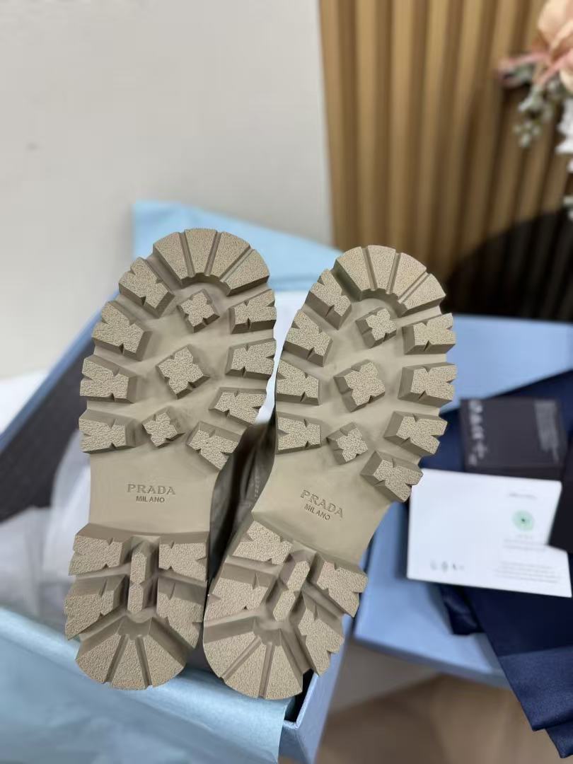 這款短靴以復古麂皮鞋面為基調,觸感細膩,搭配雕刻式金屬三角徽標與珐琅金屬搭扣,低調中透著高級光澤,機車風個性直接拉滿!靴筒高度19cm精準卡在腳踝上方,修飾小腿線條不顯壯;5cm厚底穩健有力,鞋底燙印徽標細節滿分,走路有型又不累。版型數據百分百還原,精準到毫米,無論是搭配裙裝還是褲裝,都能輕鬆打造從優雅到帥氣的多元風格!