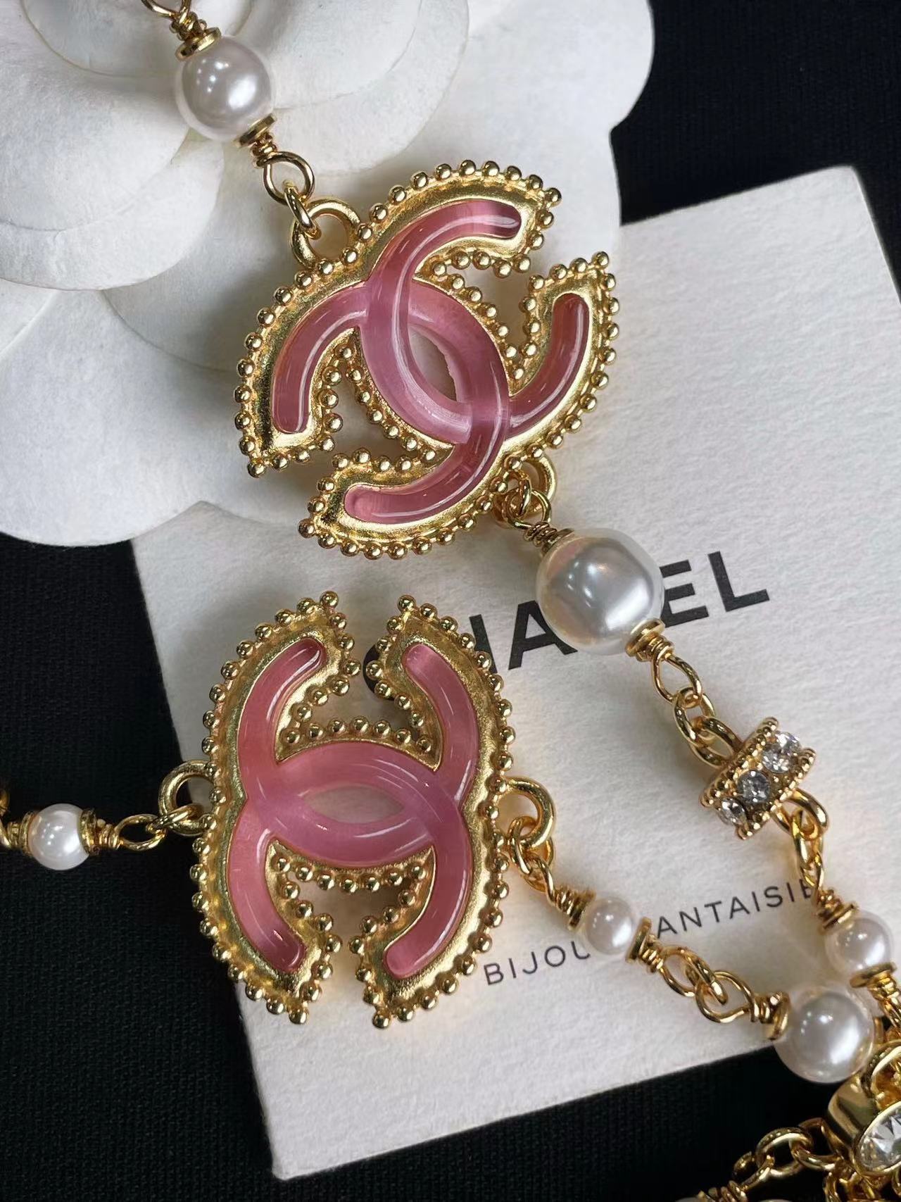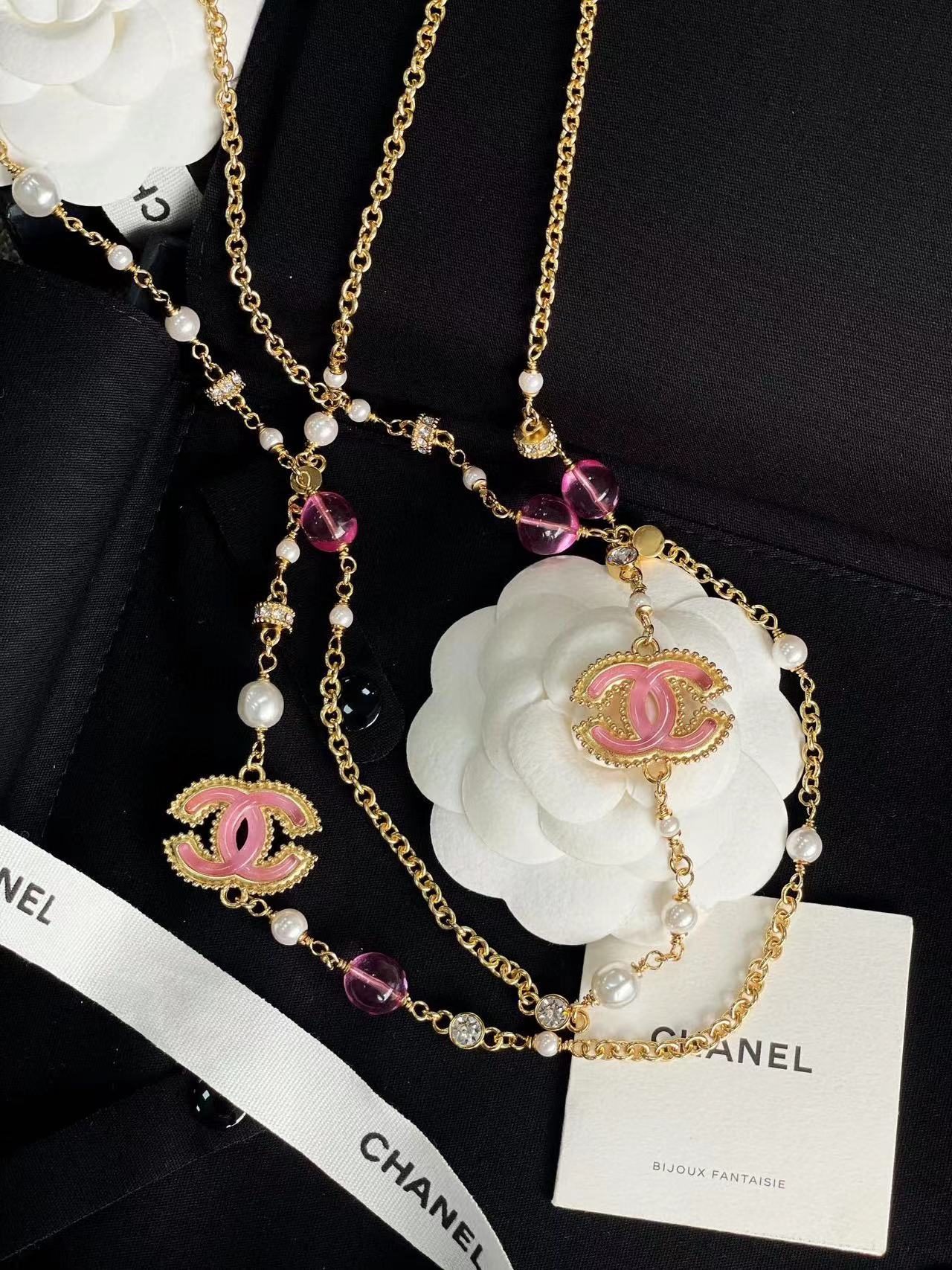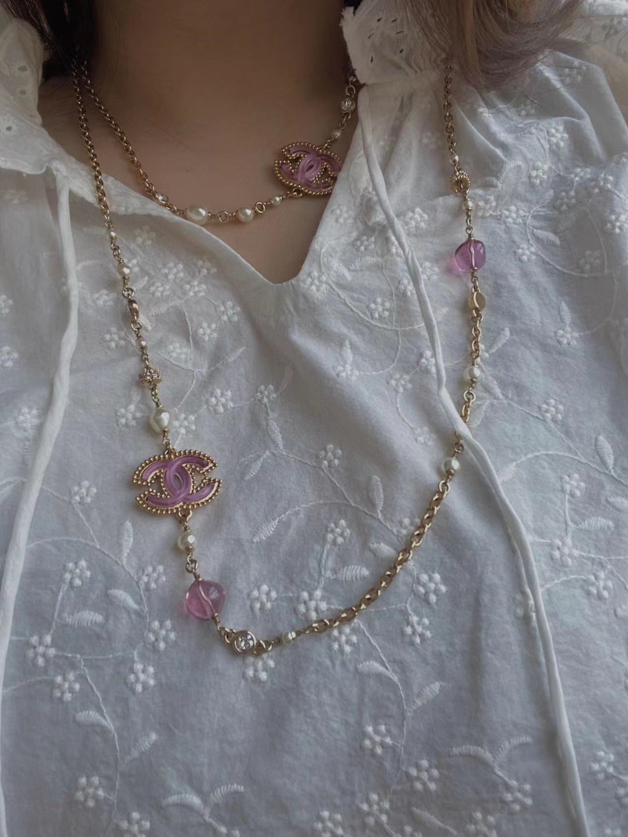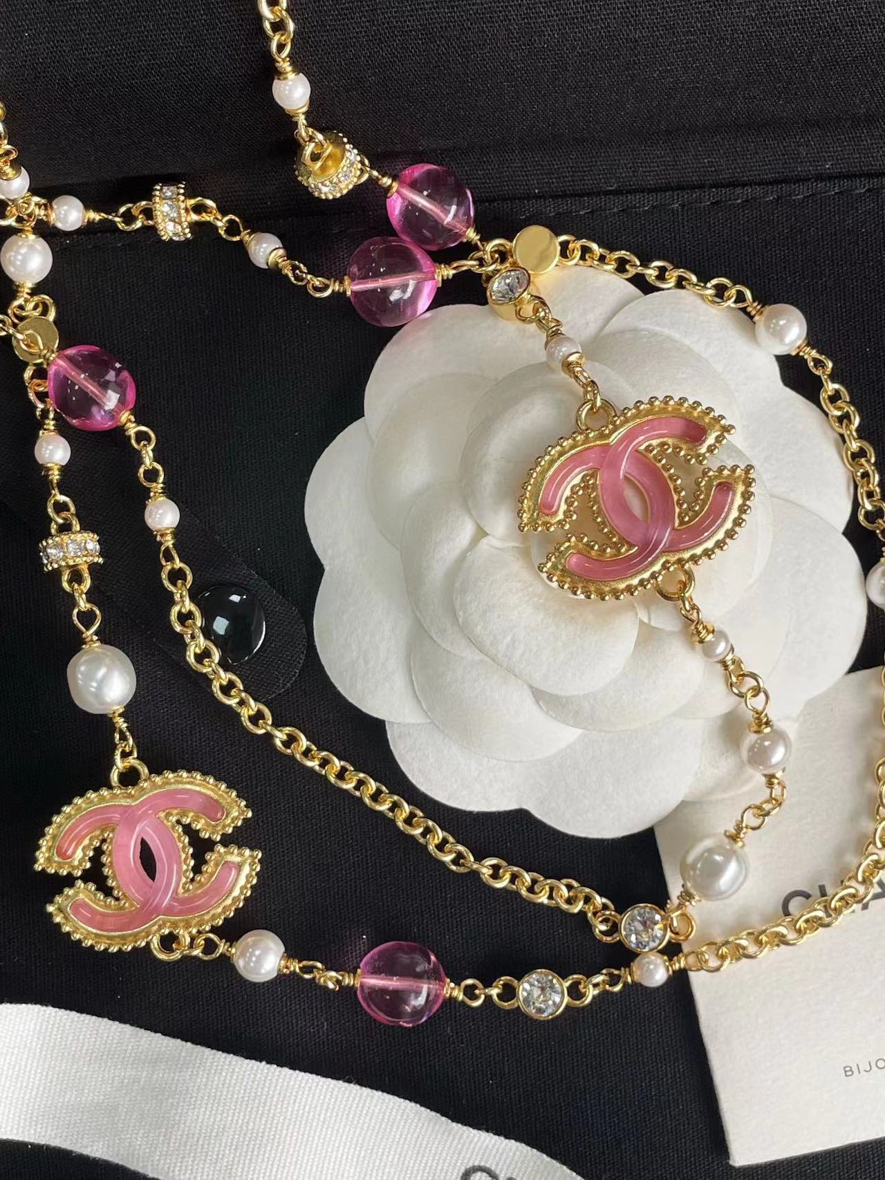 2024春夏 C家粉色水晶琉璃雙C珍珠長鏈