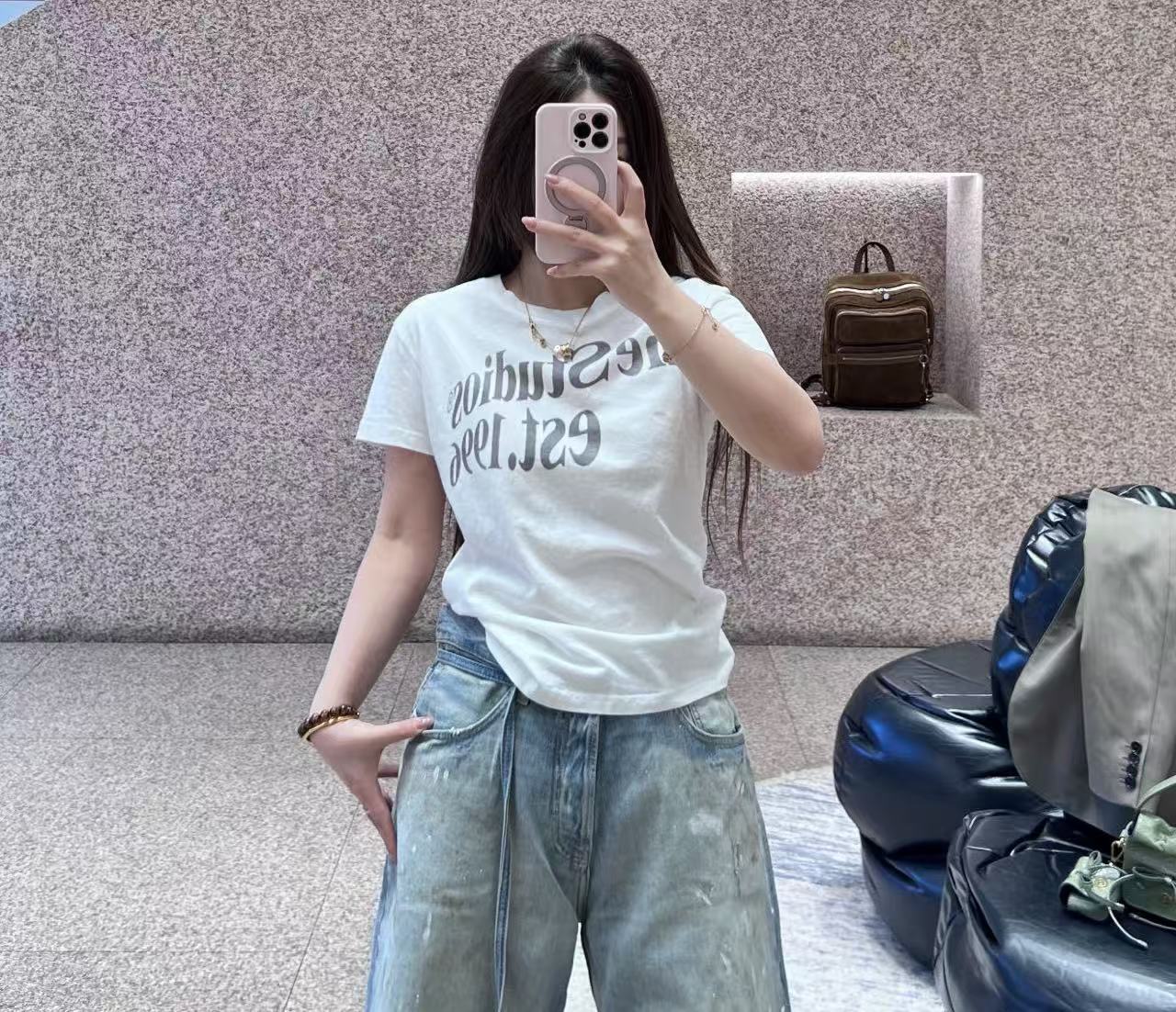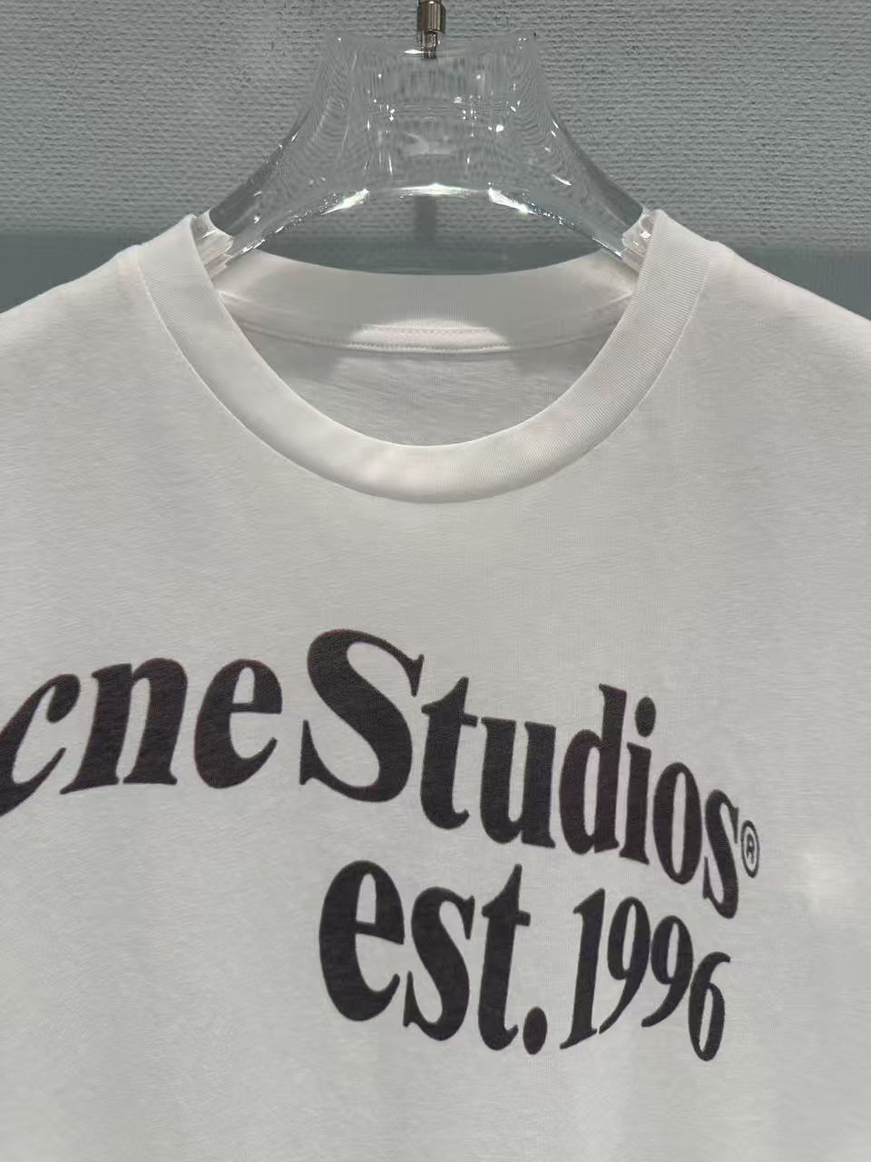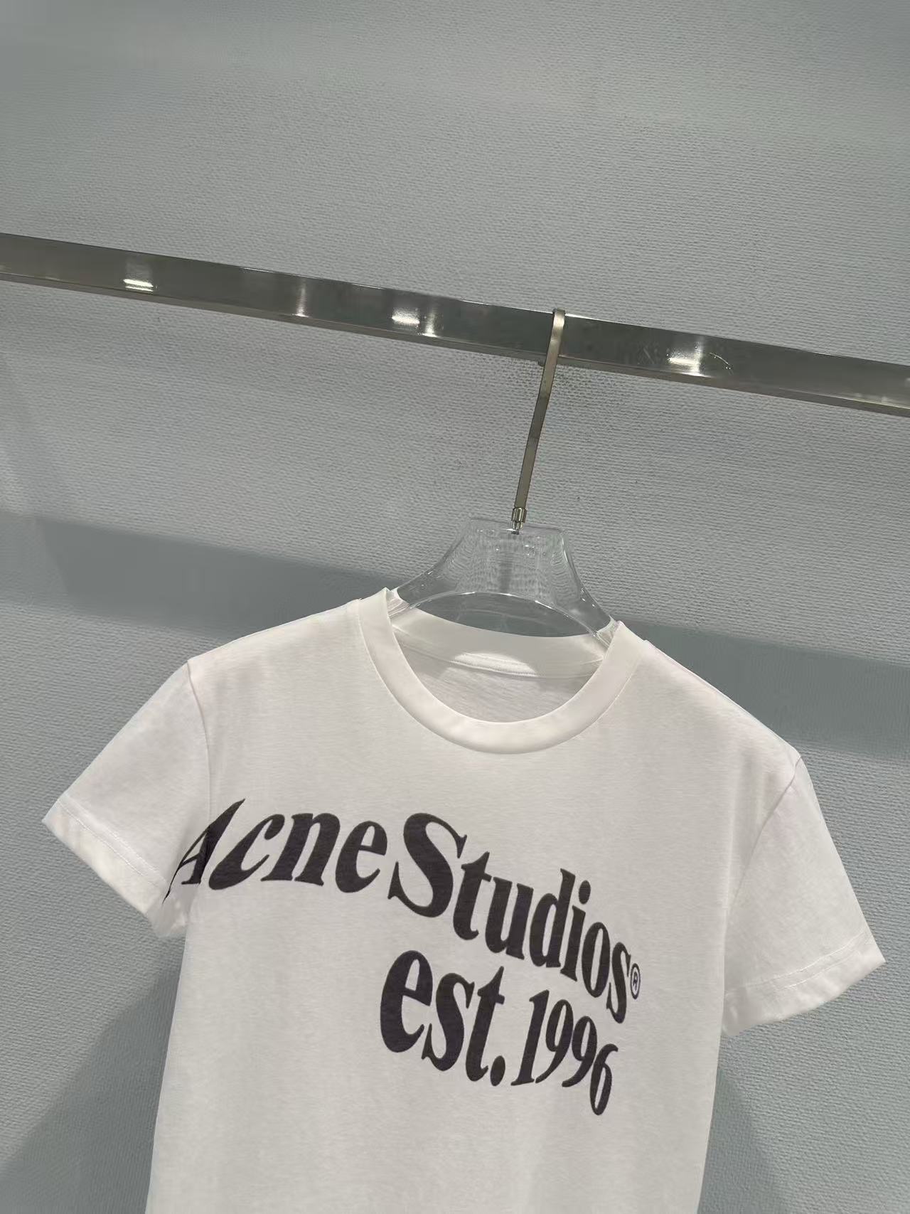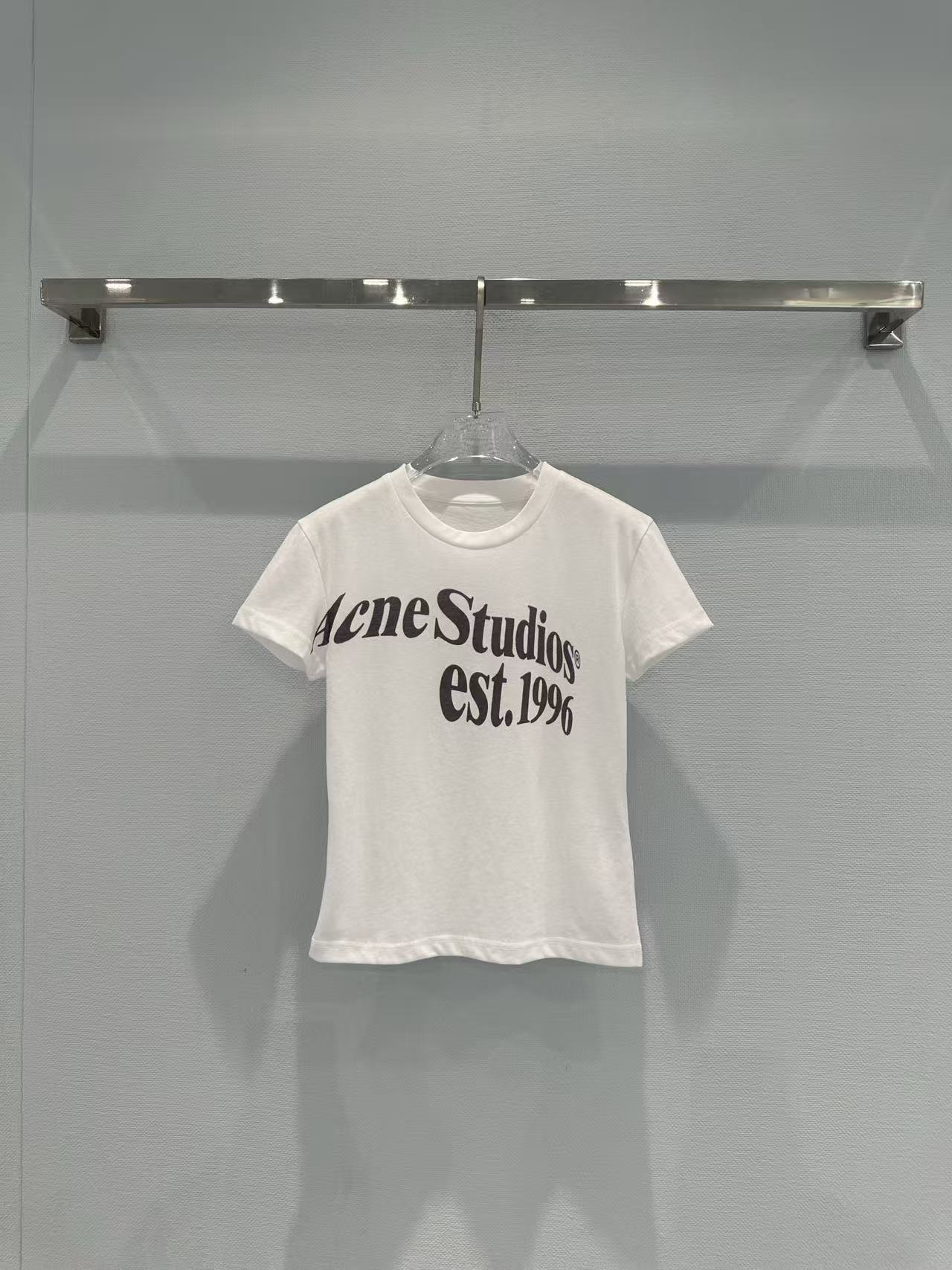 這次分享的 2026 春夏新品印花 T 恤,完美詮釋了何謂低調的高級感。設計焦點在於胸前洗鍊的 "Acne Studios est. 1996" 字體,捨棄了繁雜的圖騰,改以純粹的文字排版點亮視覺,在極簡中展現出不容忽視的品牌辨識度。