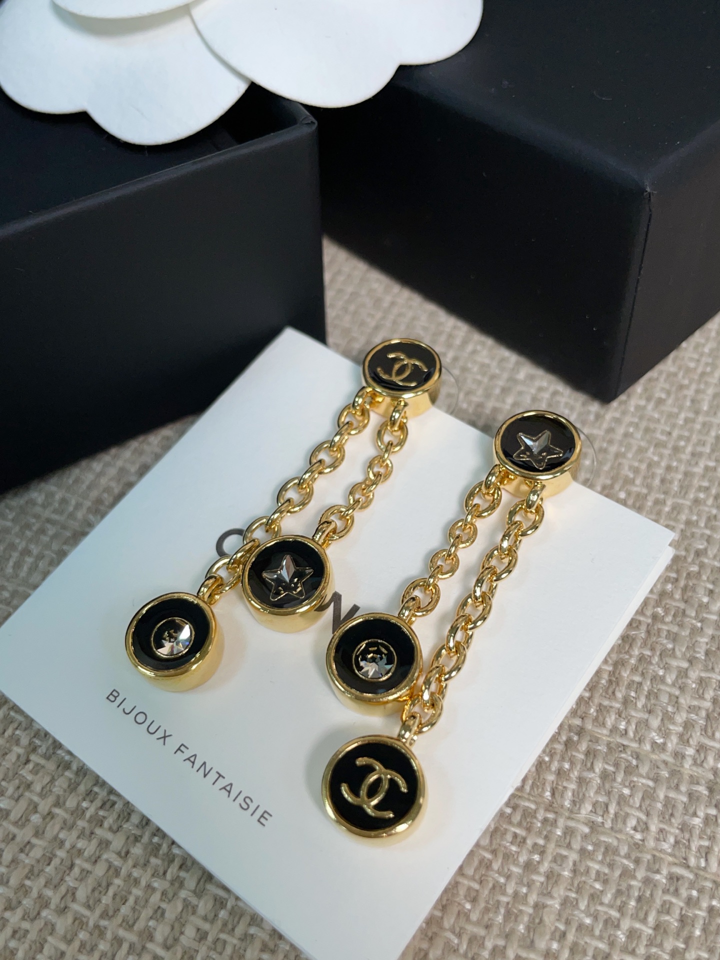 這款耳環最迷人的地方在於它的細節層次——金邊圓形與黑色樹脂的搭配非常和諧,閃爍著微光的流蘇在移動間輕盈搖曳,