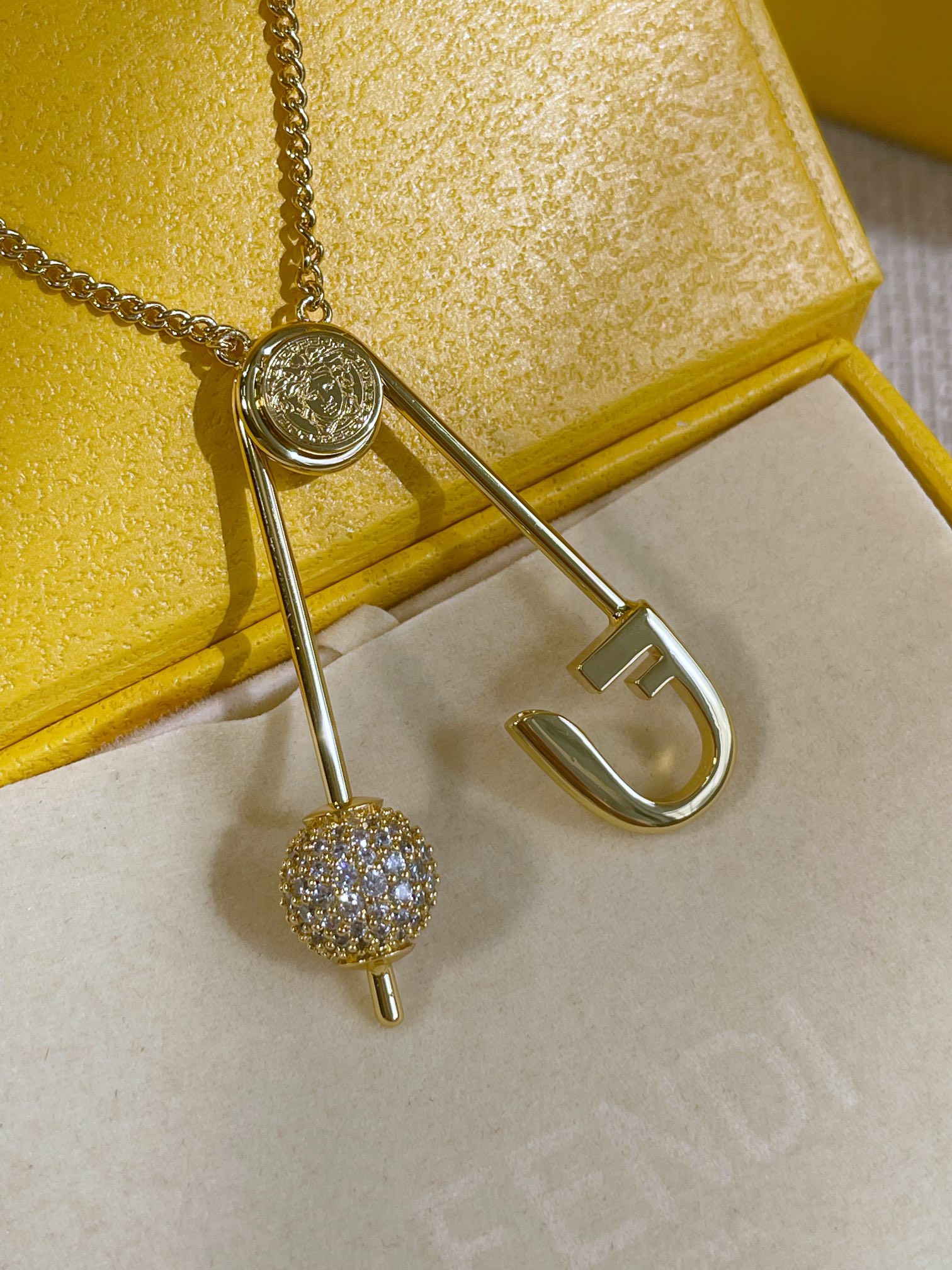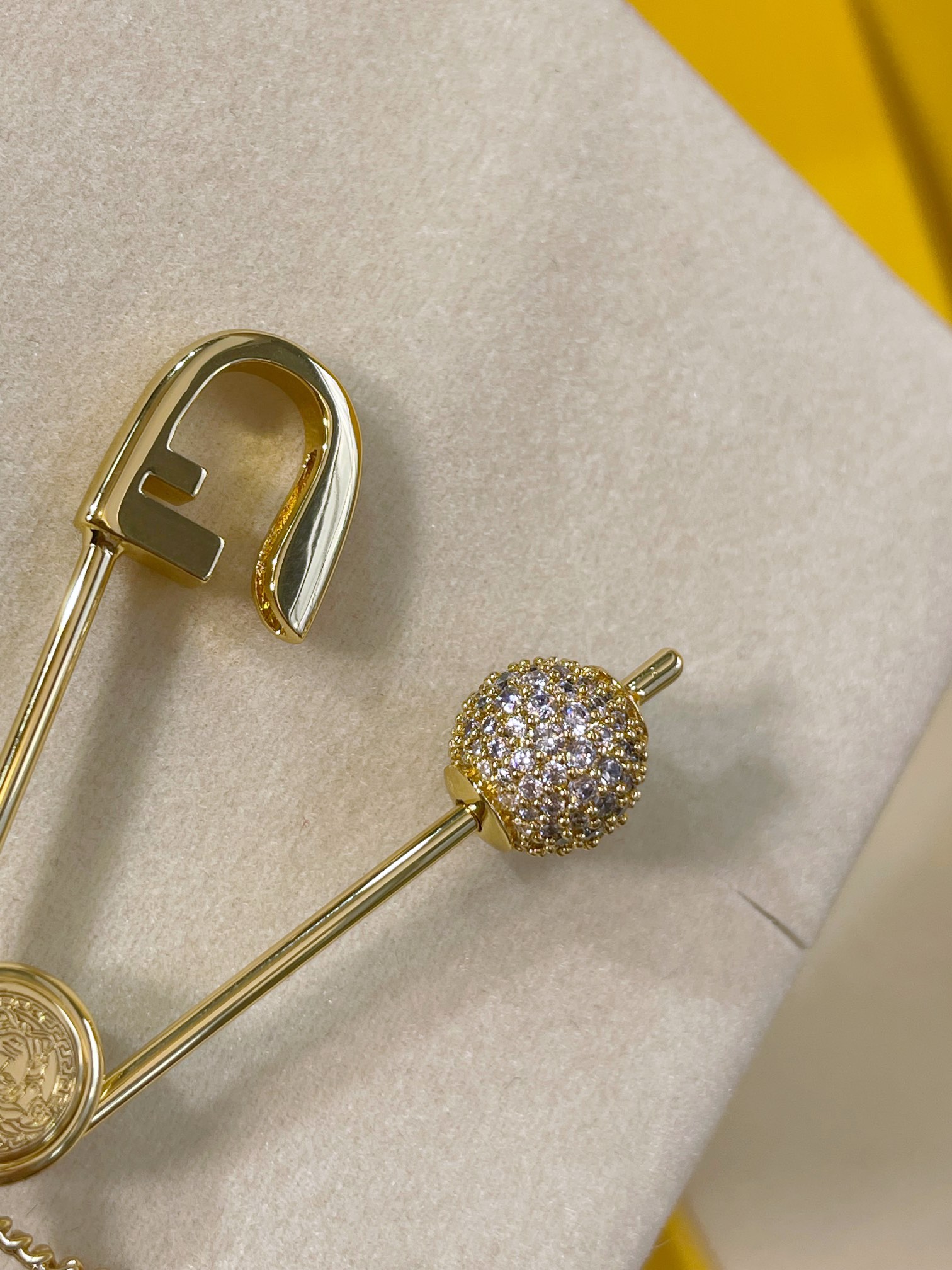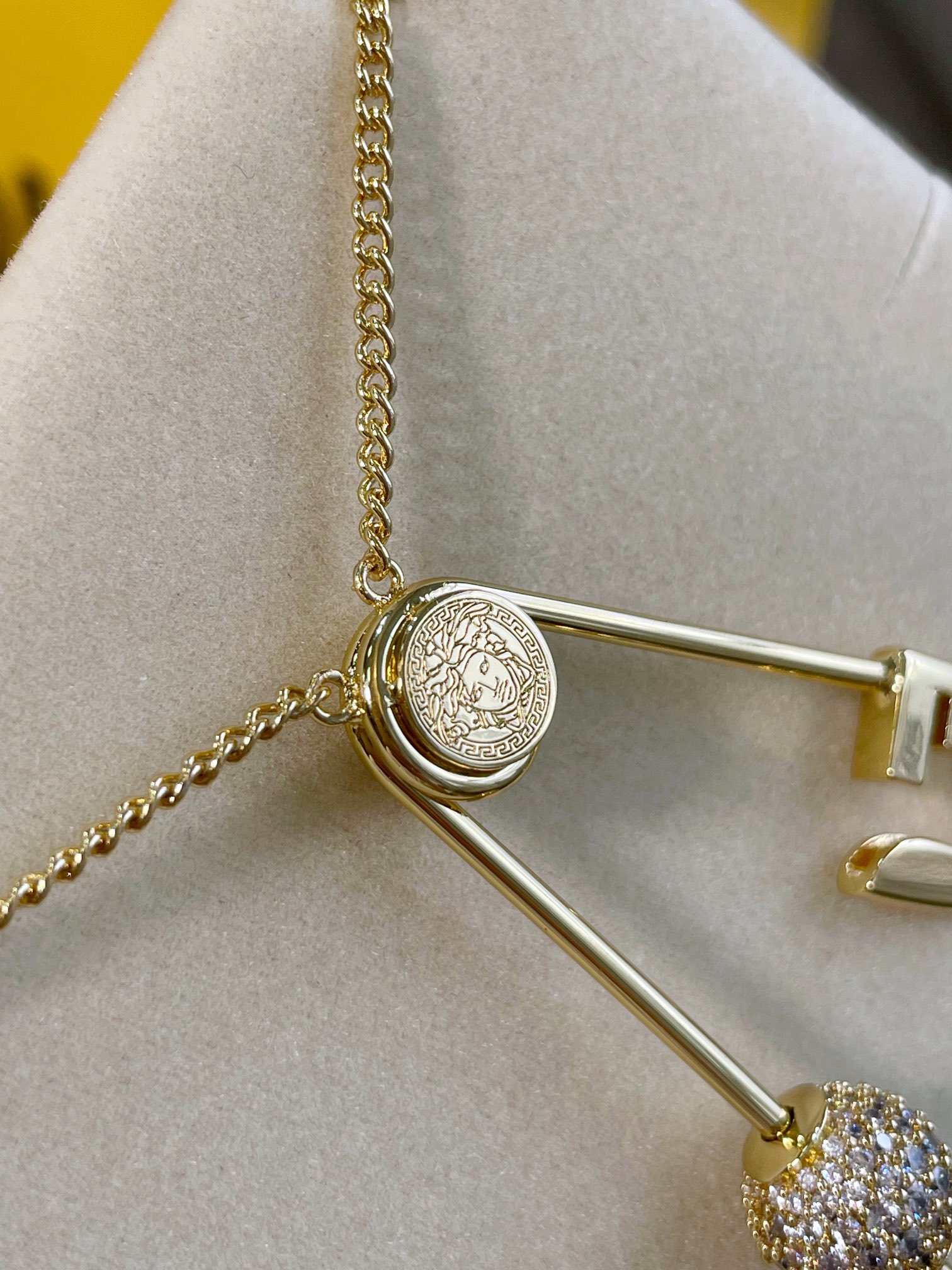 Vers與F家攜手合作的最新聯名配飾,將經典古典主義與時裝巧妙結合。簡約又經典,別針造型的吊墜,搭配閃耀的高碳鑽,低調中帶著奢華感。