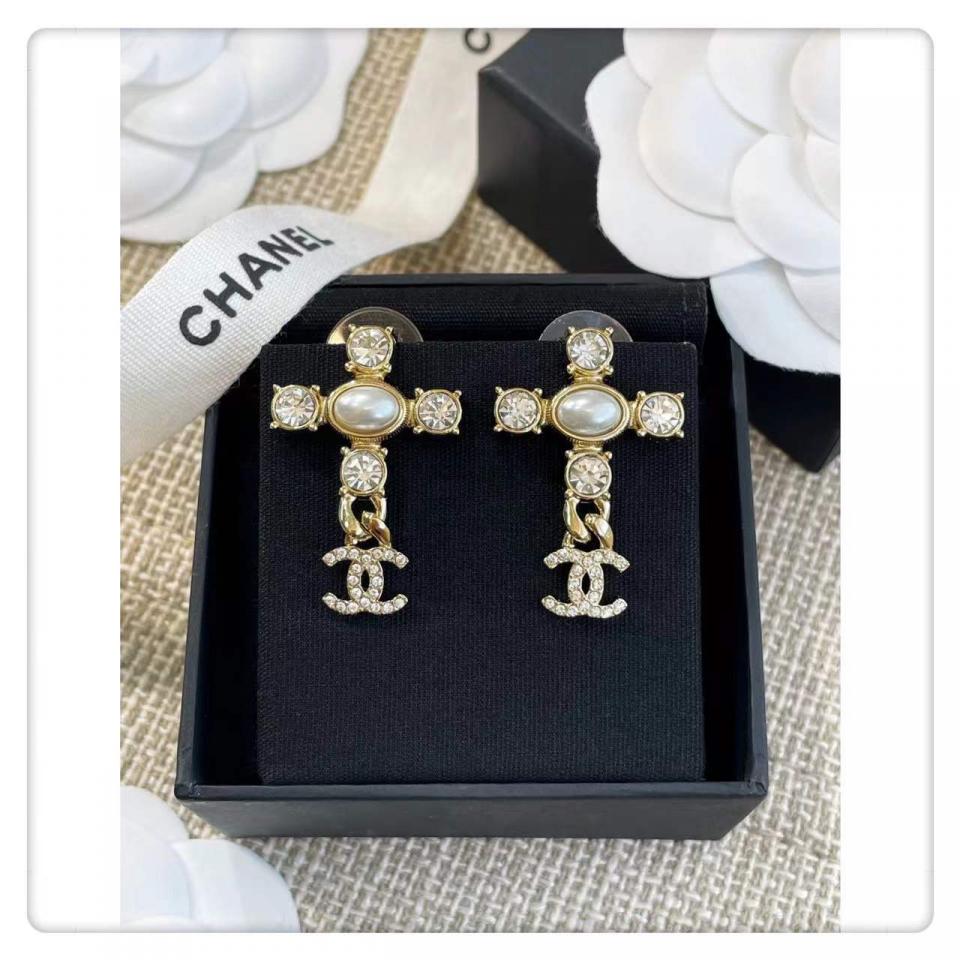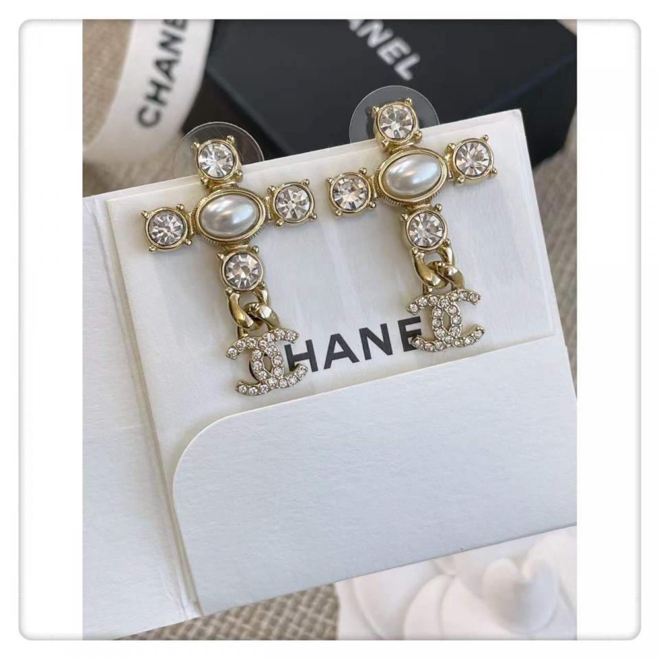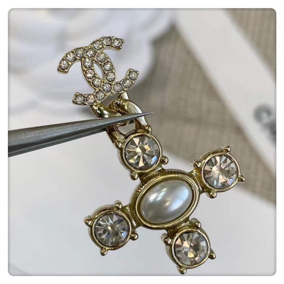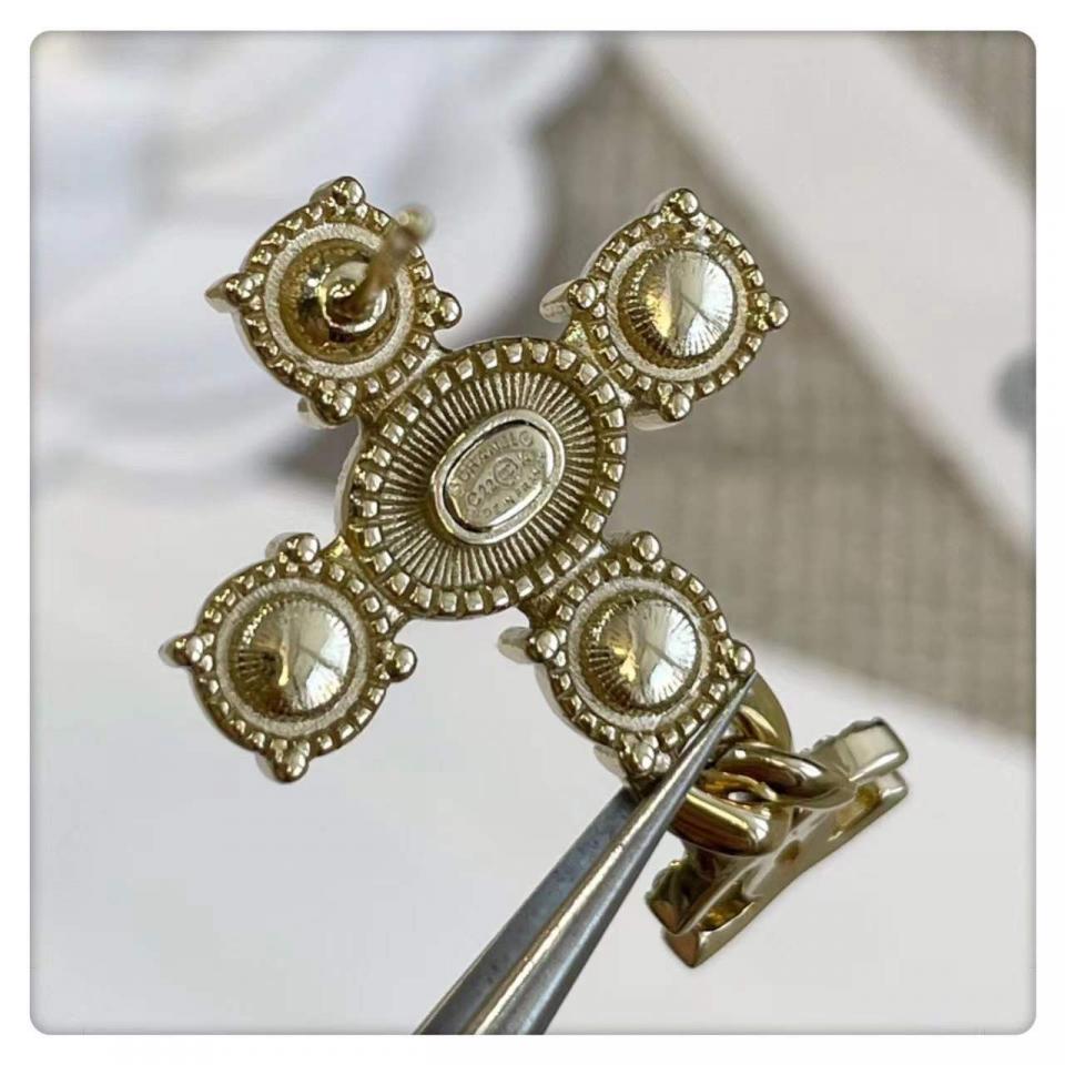 非常有創意的設計,十字架造型+鏈條經典小雙C,四顆施華洛圓鑽水晶,中間施華洛橢圓珍珠為中心,背面五金十字架是有手工拉絲紋路,雙C光面的,做工非常精緻細膩!上耳時尚大氣,也很適合日常通勤百搭款!