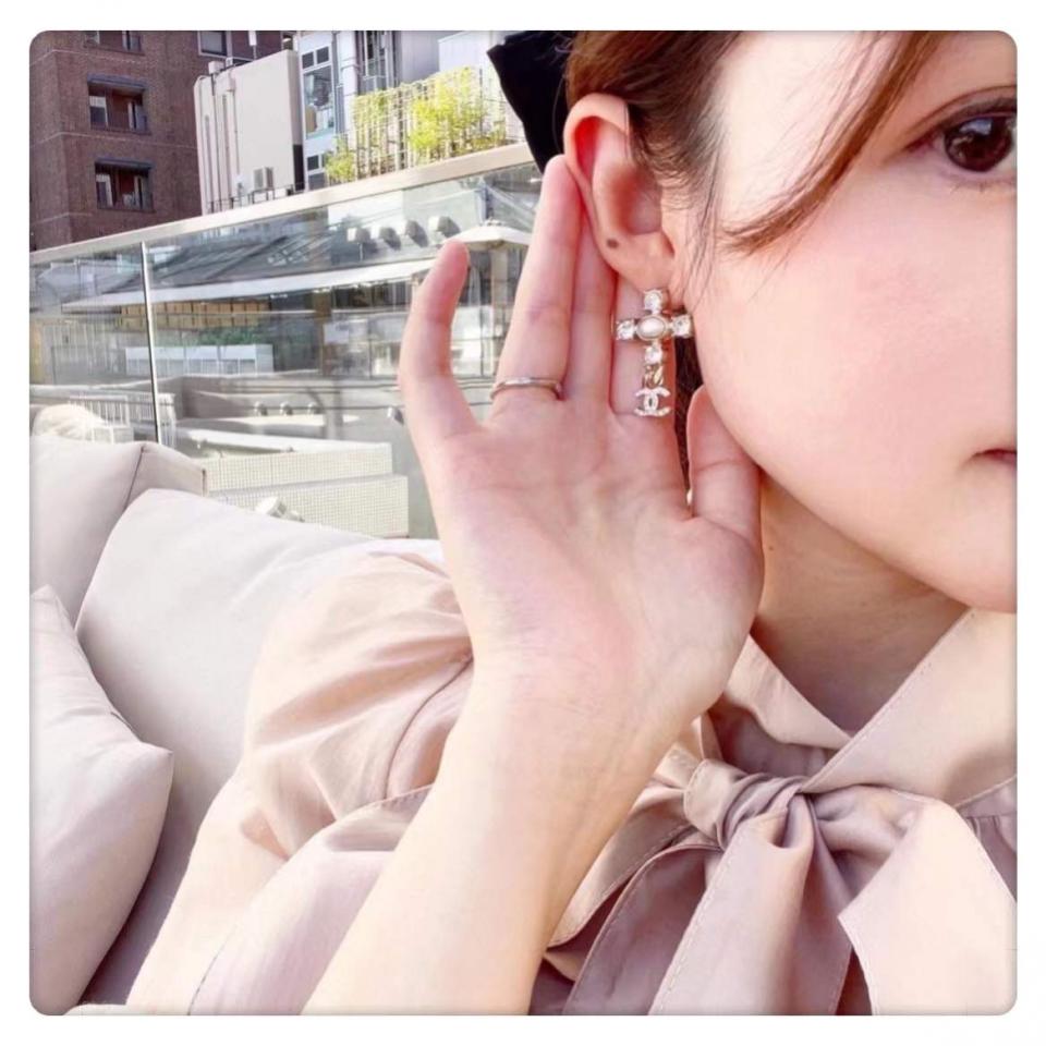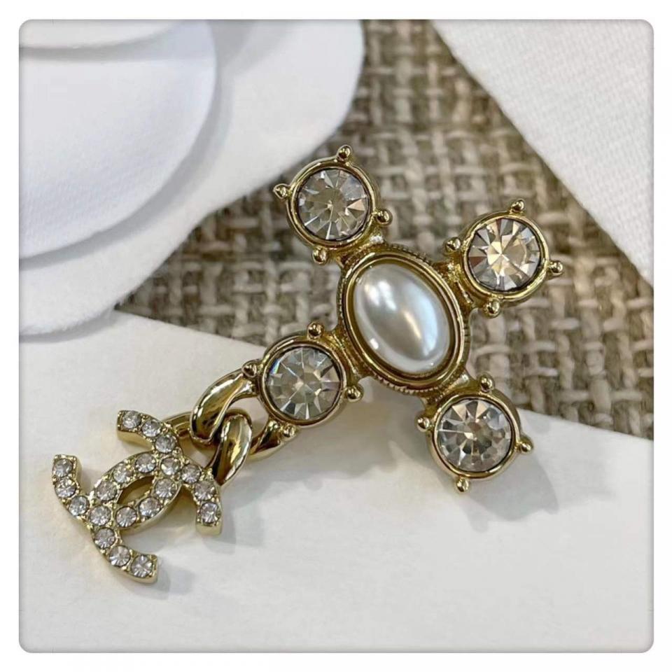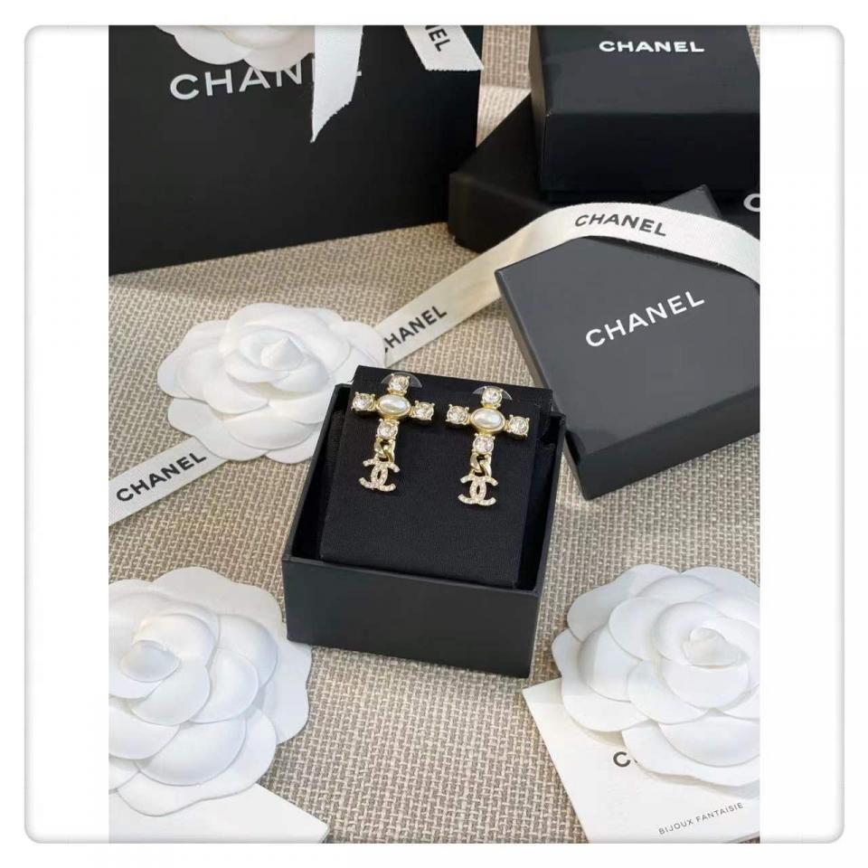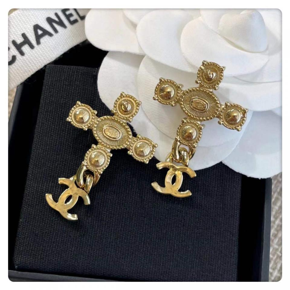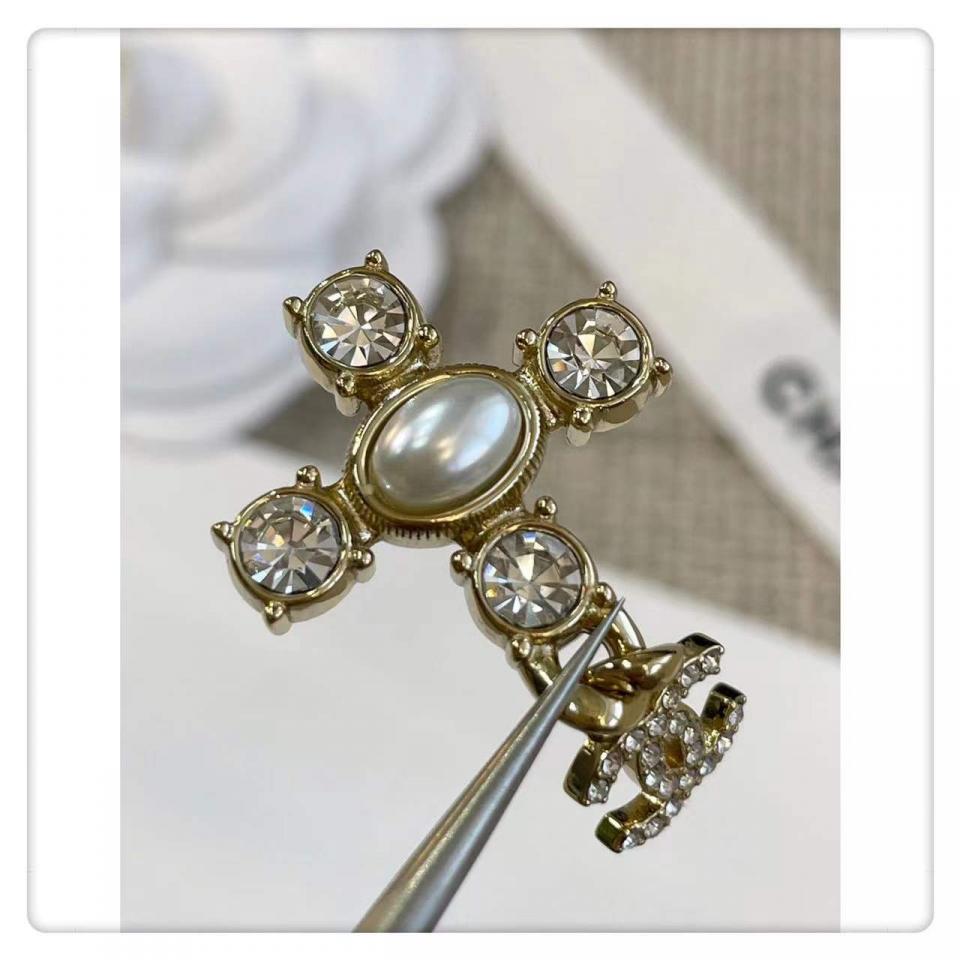 非常有創意的設計,十字架造型+鏈條經典小雙C,四顆施華洛圓鑽水晶,中間施華洛橢圓珍珠為中心,背面五金十字架是有手工拉絲紋路,雙C光面的,做工非常精緻細膩!上耳時尚大氣,也很適合日常通勤百搭款!
