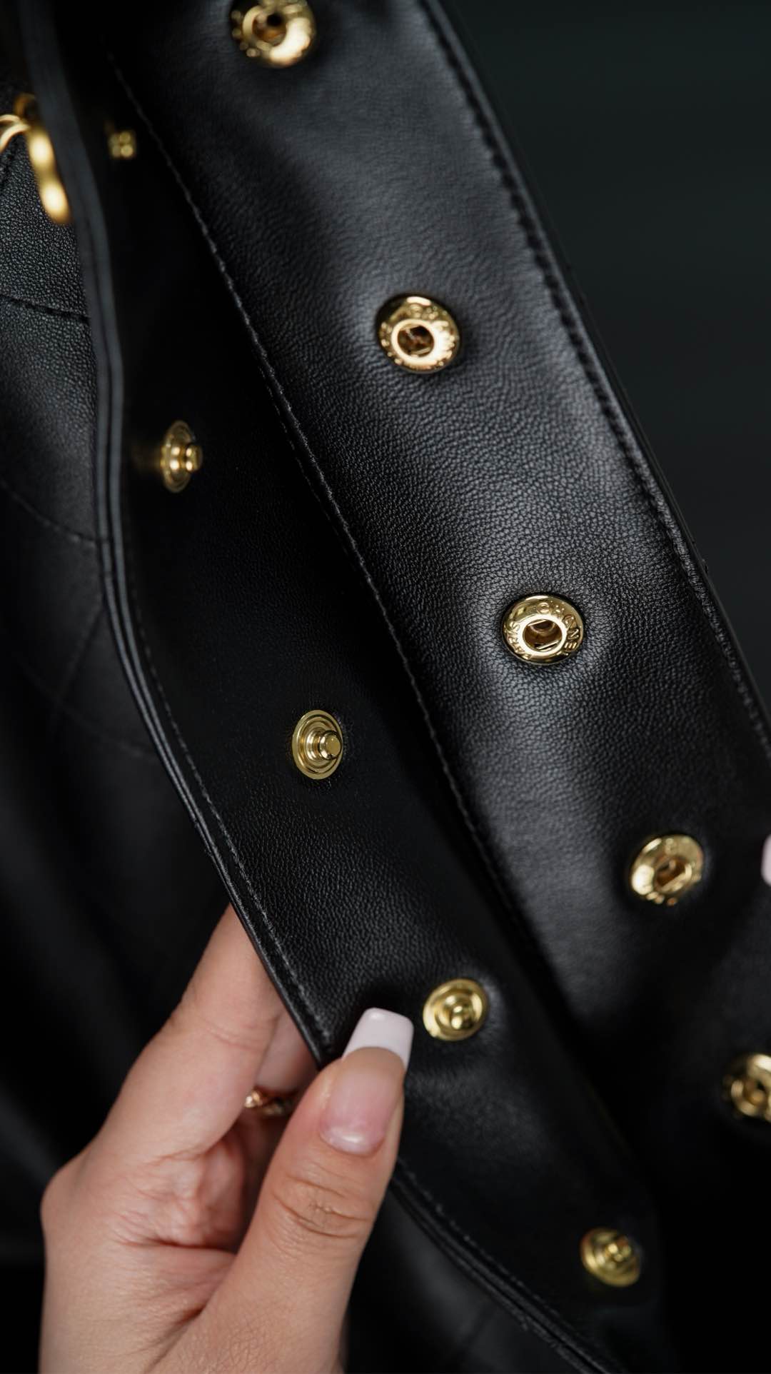這款25P金幣Hobo水桶包,以濃郁復古氛圍結合現代感剪裁,完美詮釋「時髦、鬆弛與氣場兼具」的穿搭哲學。黑金配色低調卻極具質感,讓人一眼著迷,輕鬆打造酷感女伶的風格穿搭。