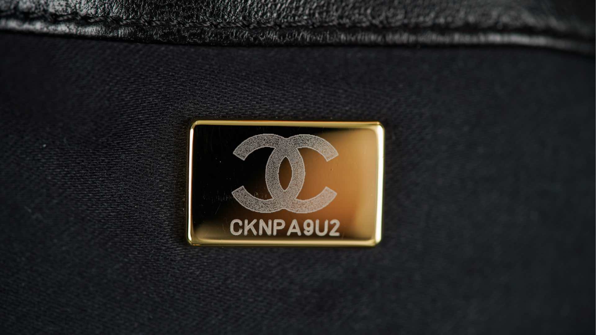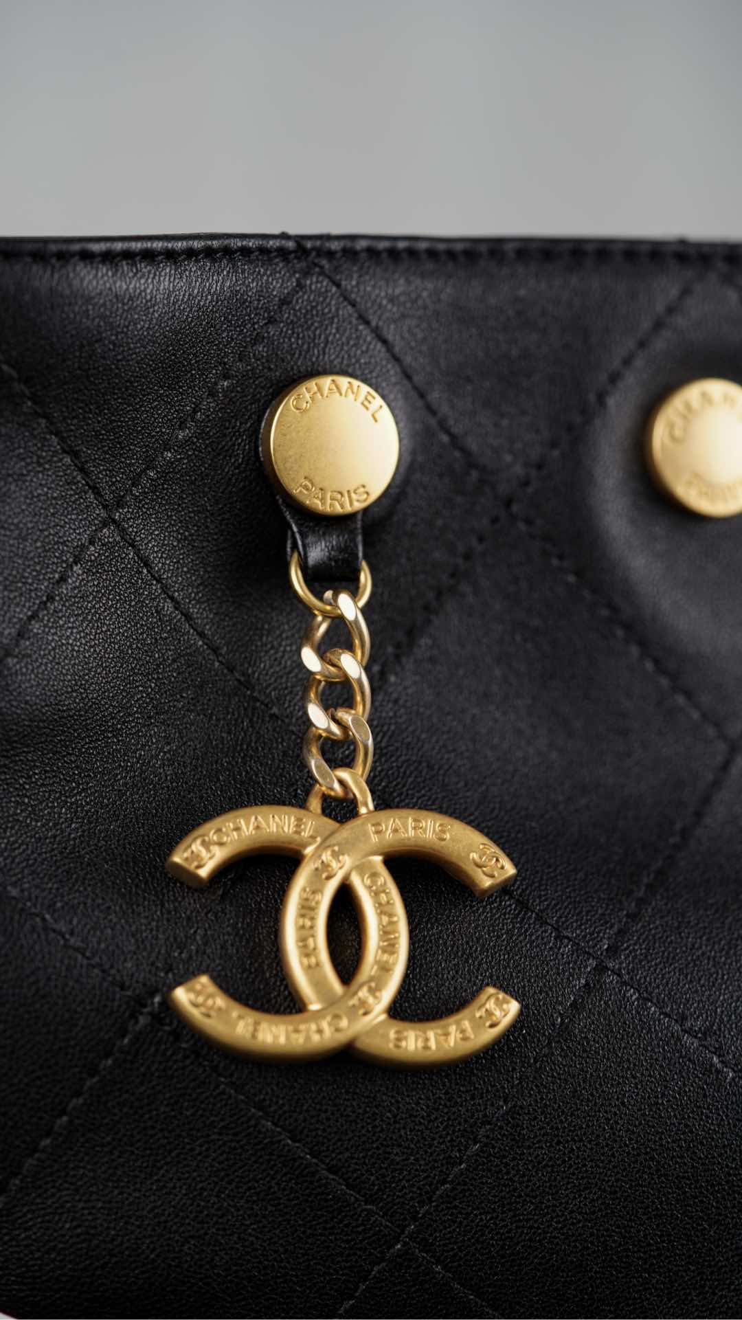 整體五金設計採用復古砂金處理,雙C金幣吊墜與滿版 Logo 字樣展現出極高完成度的細節工藝。按扣式的五排開合設計不僅外型吸睛,也大大提升使用上的安全性。
