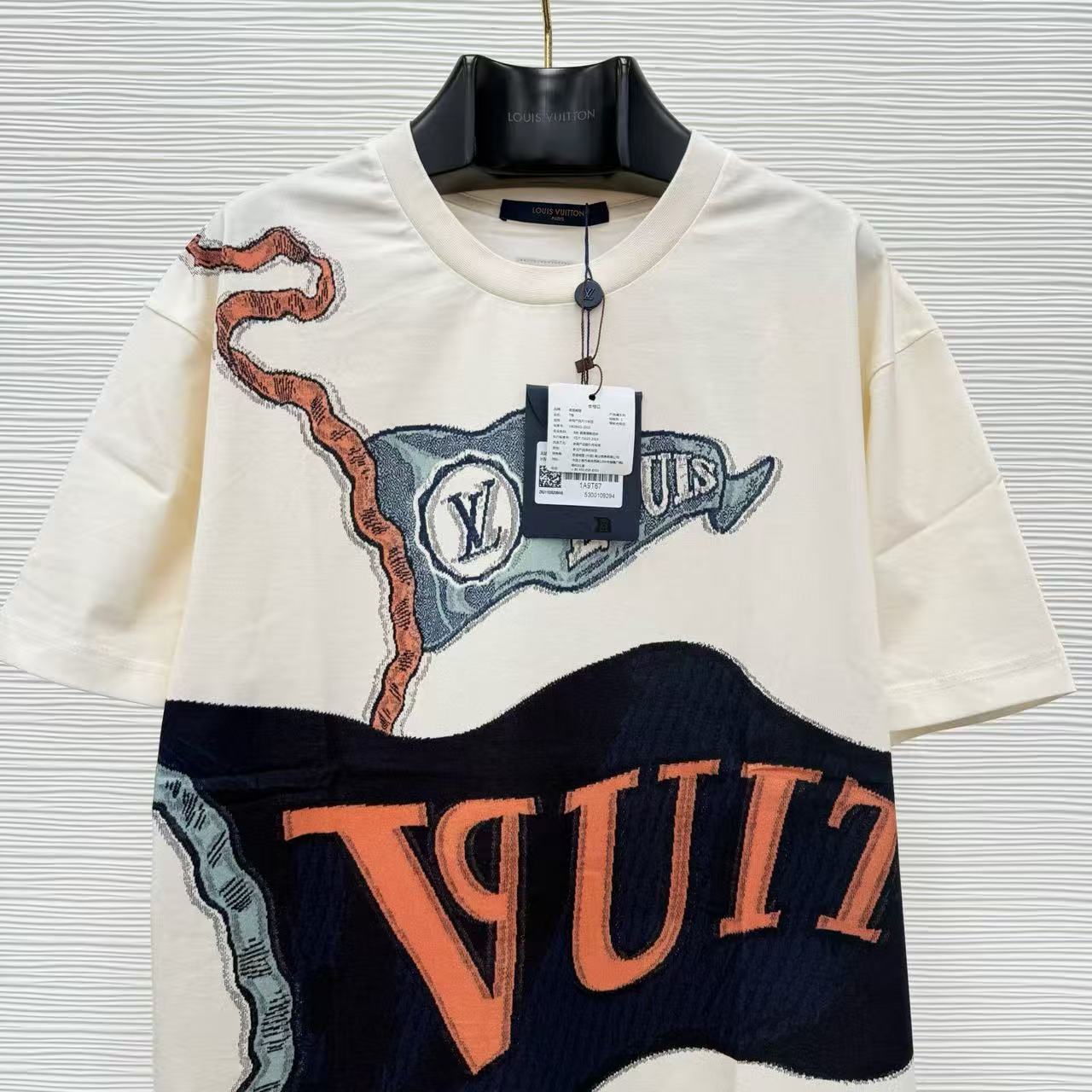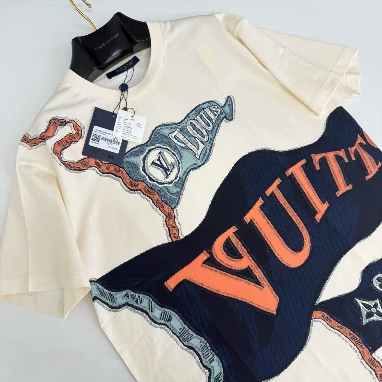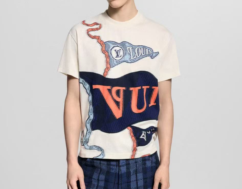 正面圖案: T 恤的正面飾有三面精緻的藍色旗幟提花針織圖案,上面巧妙地飾有 LV 家族的經典簽名,讓圖案看起來立體且充滿質感,遠比普通印花來得高級。