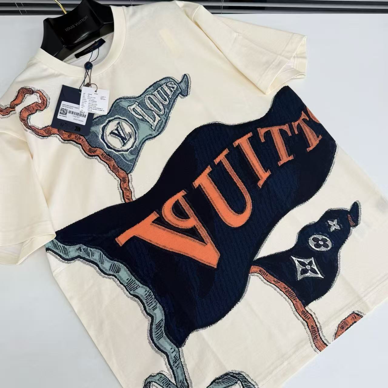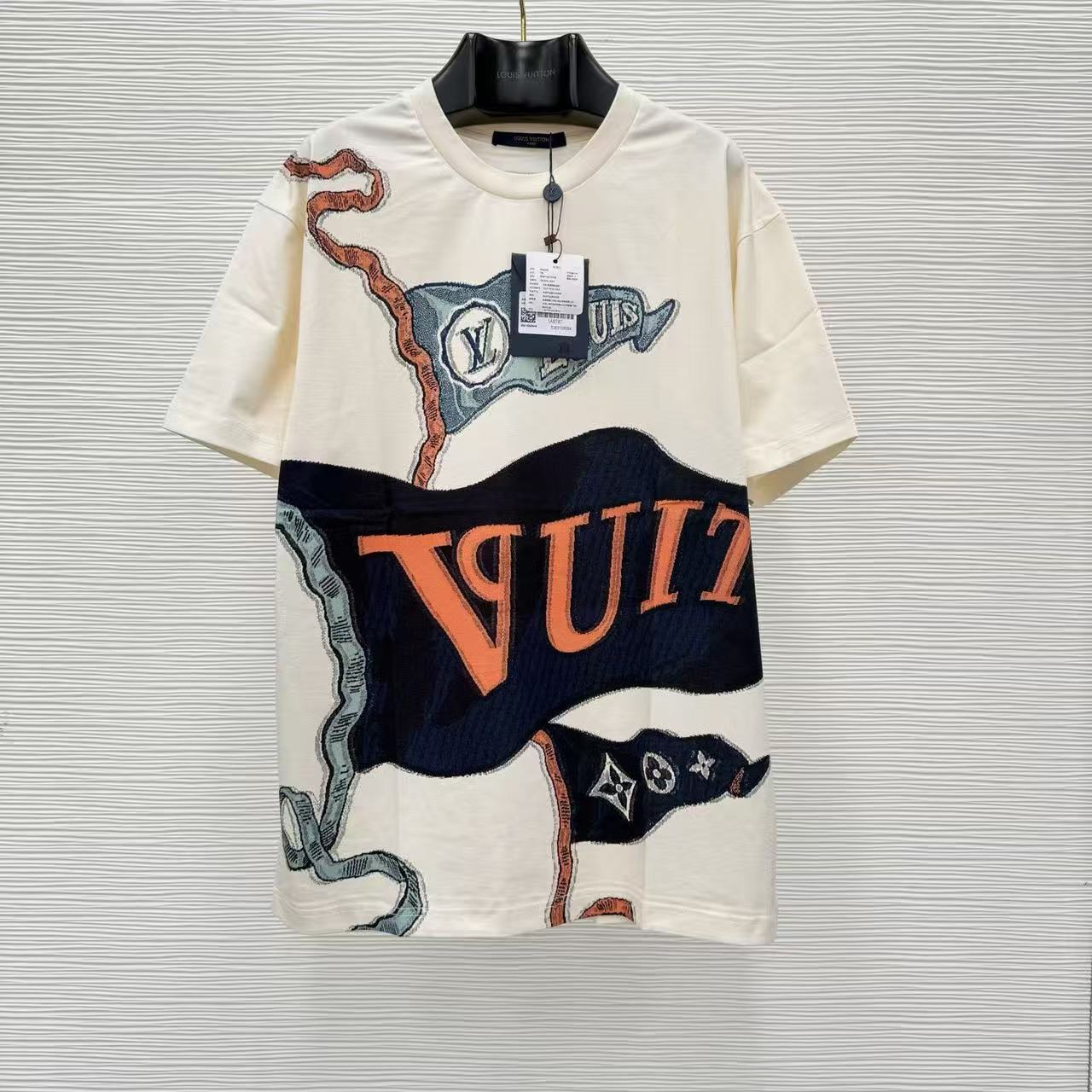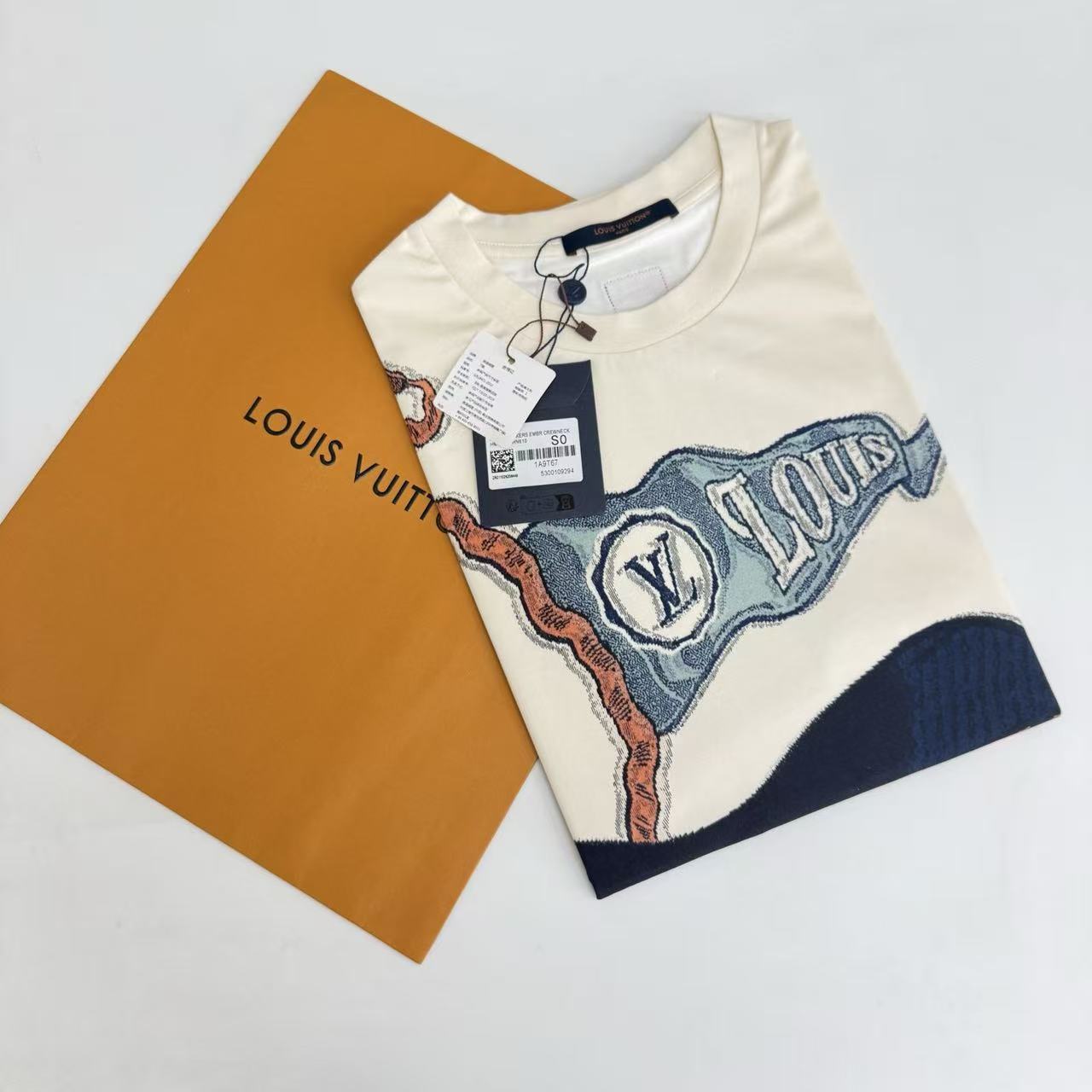 正面圖案: T 恤的正面飾有三面精緻的藍色旗幟提花針織圖案,上面巧妙地飾有 LV 家族的經典簽名,讓圖案看起來立體且充滿質感,遠比普通印花來得高級。